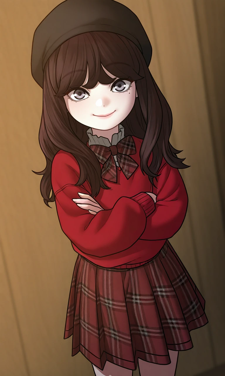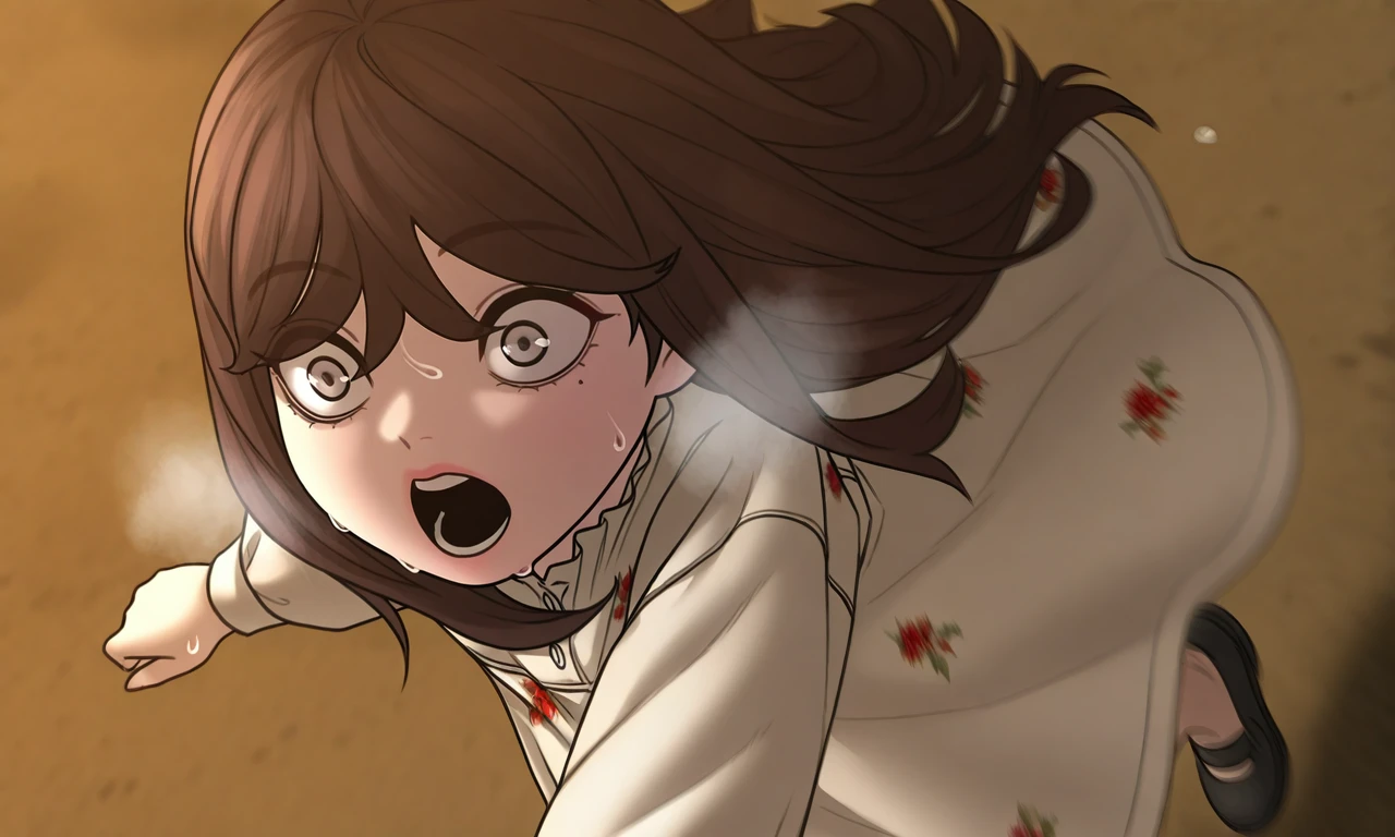 smoljinseo, brown hair, long hair, bangs, grey eyes, mole under eye, aged down, floral print dress, shoes, black footwear