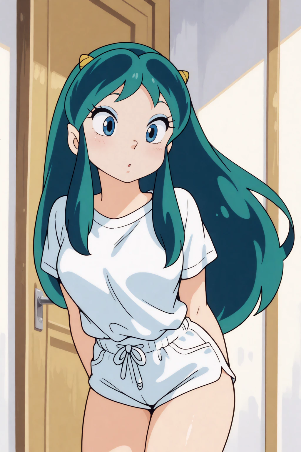 white mini shorts, white t-shirt
