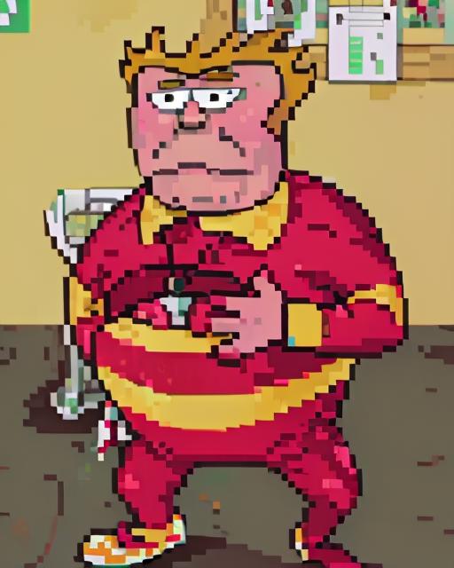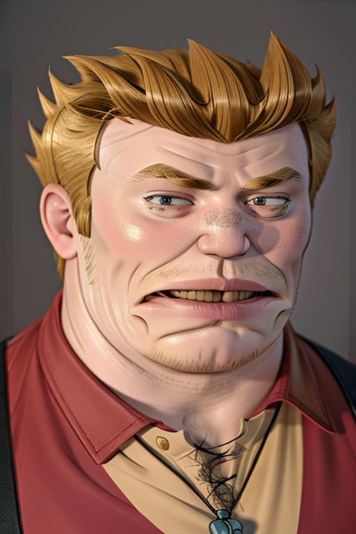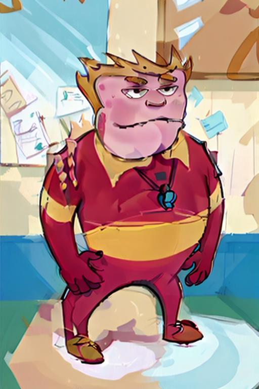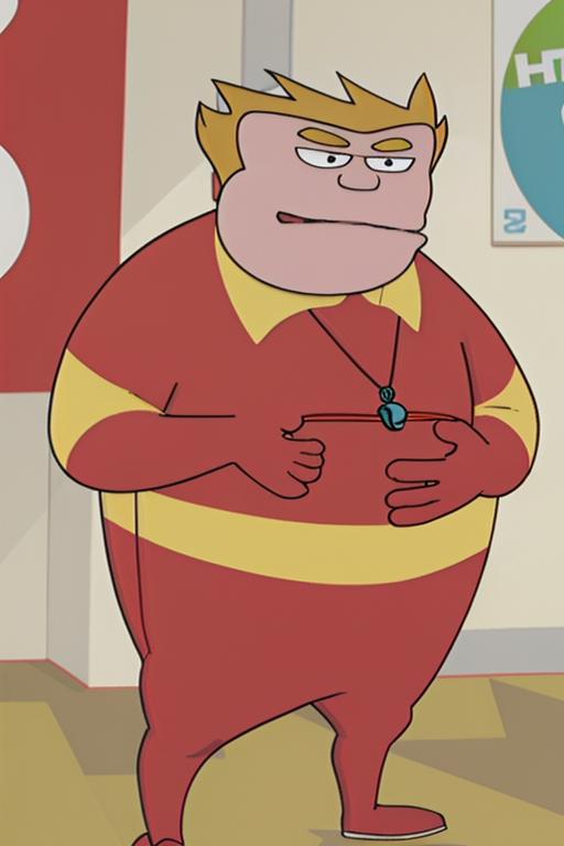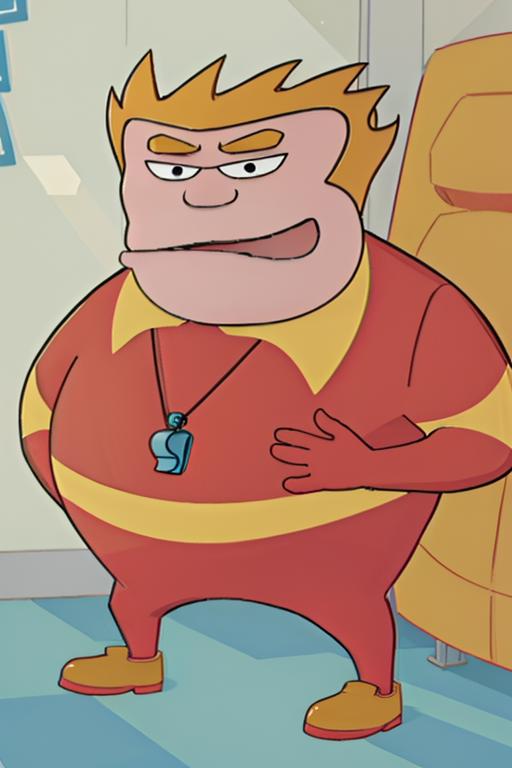coach_john_mcguirk, orange hair, short hair, spiked hair, overweight, yellow collar, red shirt, whistle around neck, red gloves, yellow stripe, red pants, red shoes, mouth open, raised eyebrow,