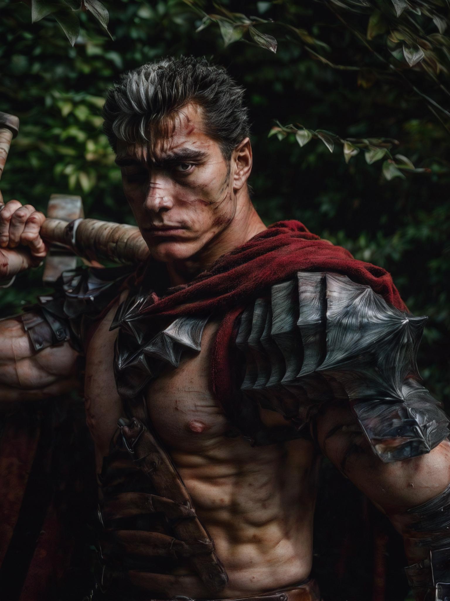 Trigger + Appearance: guts \(berserk\), muscular male, scar on face, short hair, black hair
