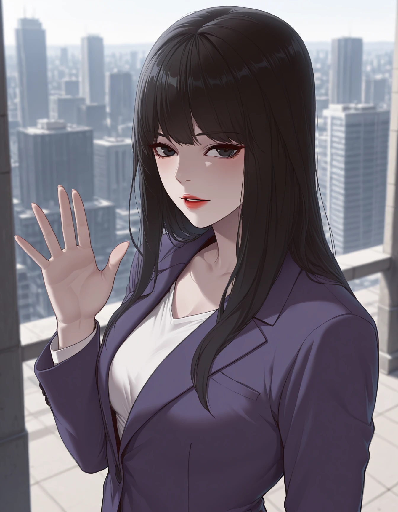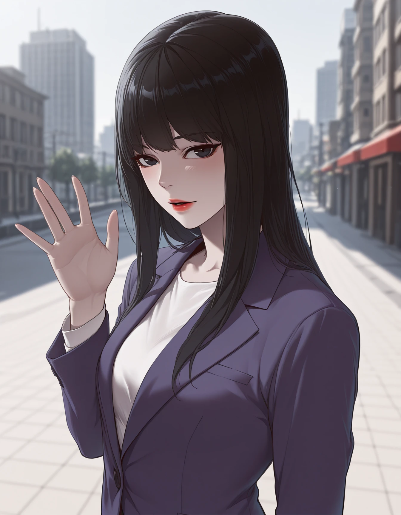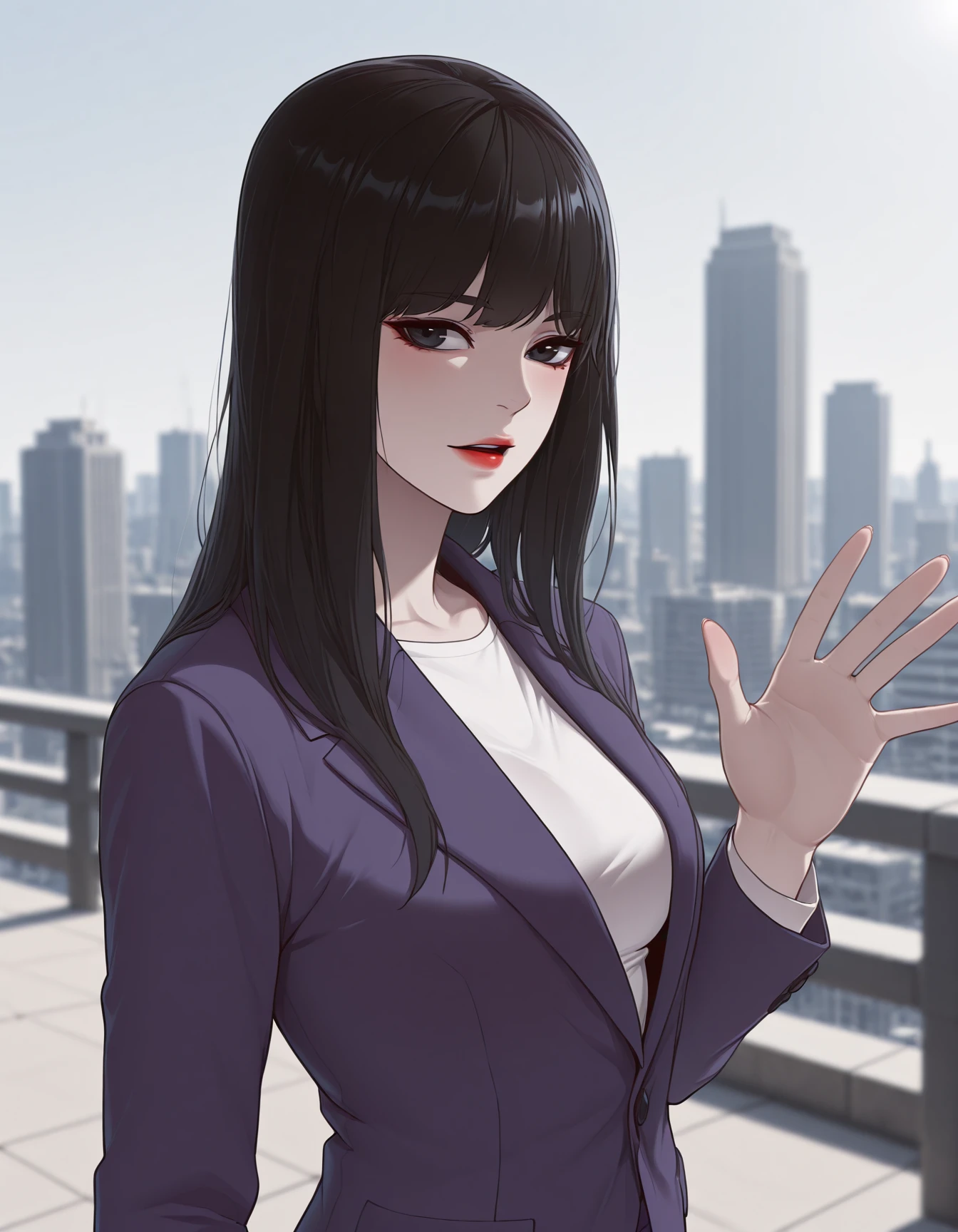 jiyoung yoo, 1girl, solo, long hair, black hair, red lips, black eyes, suit, purple suit, jacket, purple pants, formal, long sleeves, white shirt, closed jacket,