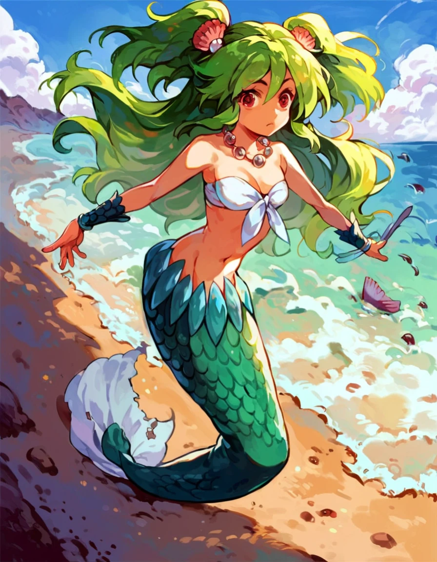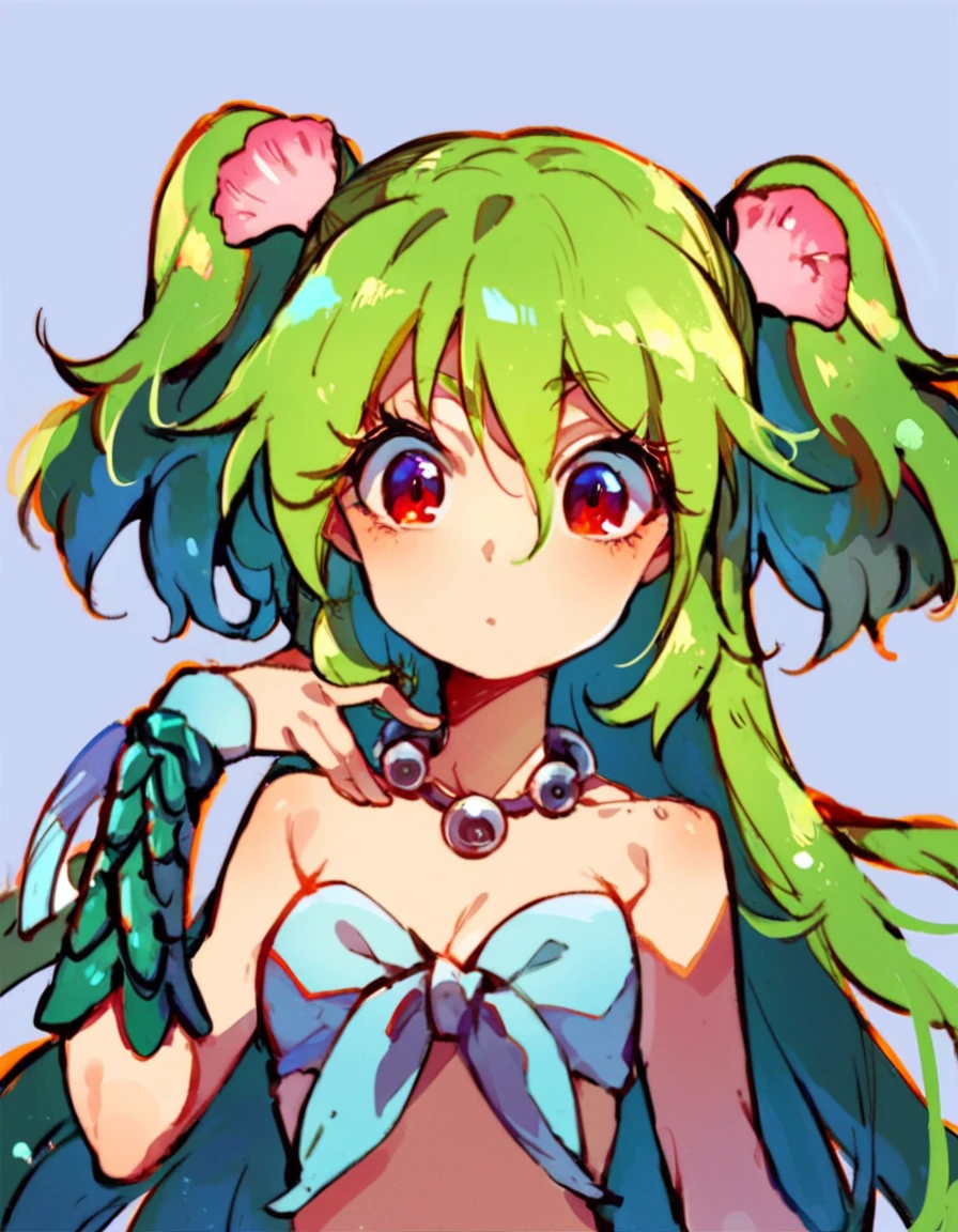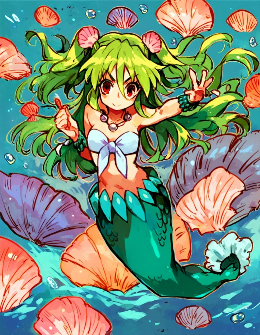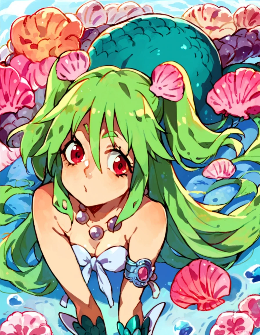 green hair, 1girl, monster girl, long hair, two side up, hair ornament, mermaid, jewelry, necklace, red eyes, scales