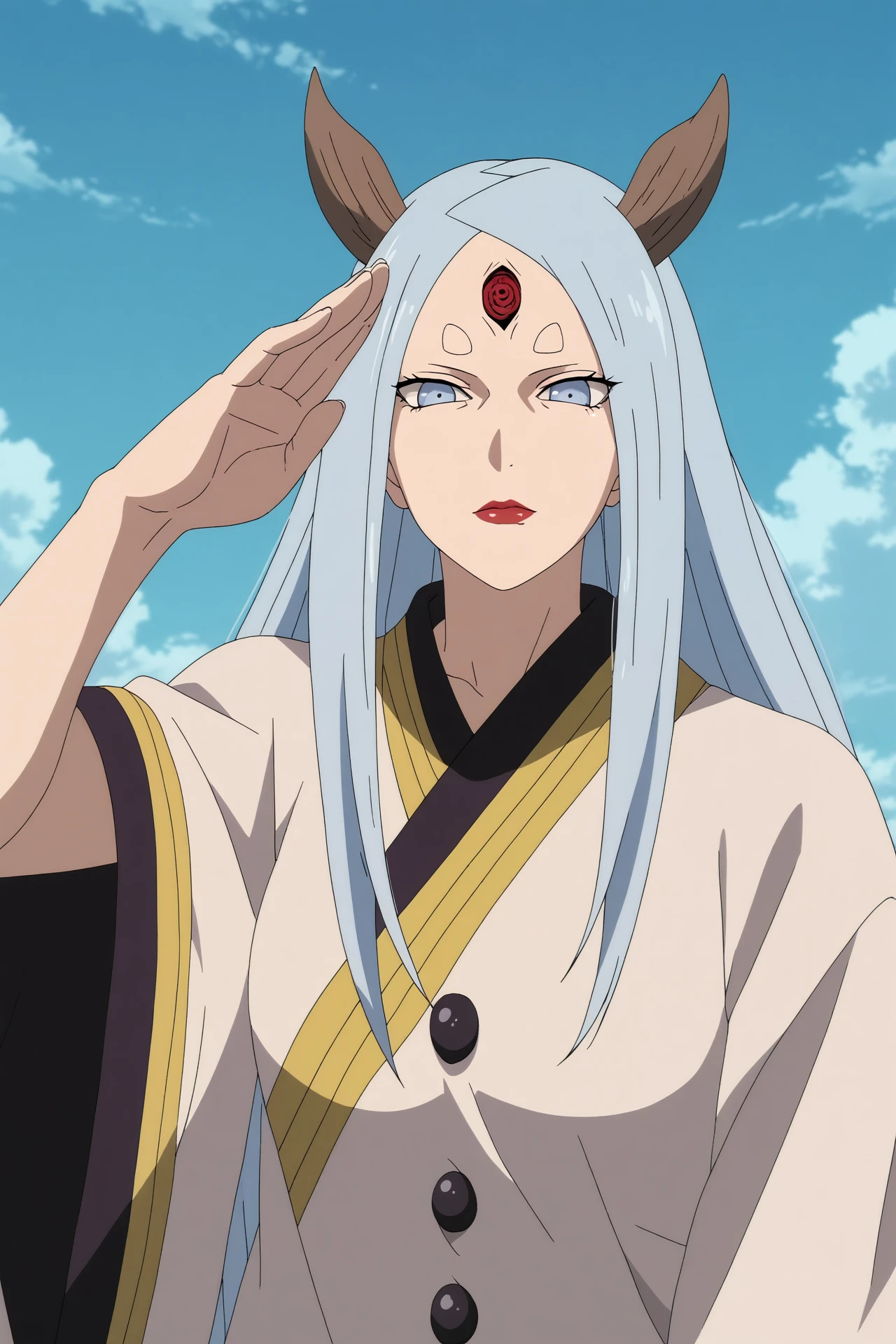 Triggers : kaguya,1girl,solo,mature,long hair,horns,japanese_clothes, white kimono,makeup, looking_at_viewer, lipstick, third_eye, facial_mark,forehead_mark, wide_sleeves,pale skin,no_pupils
