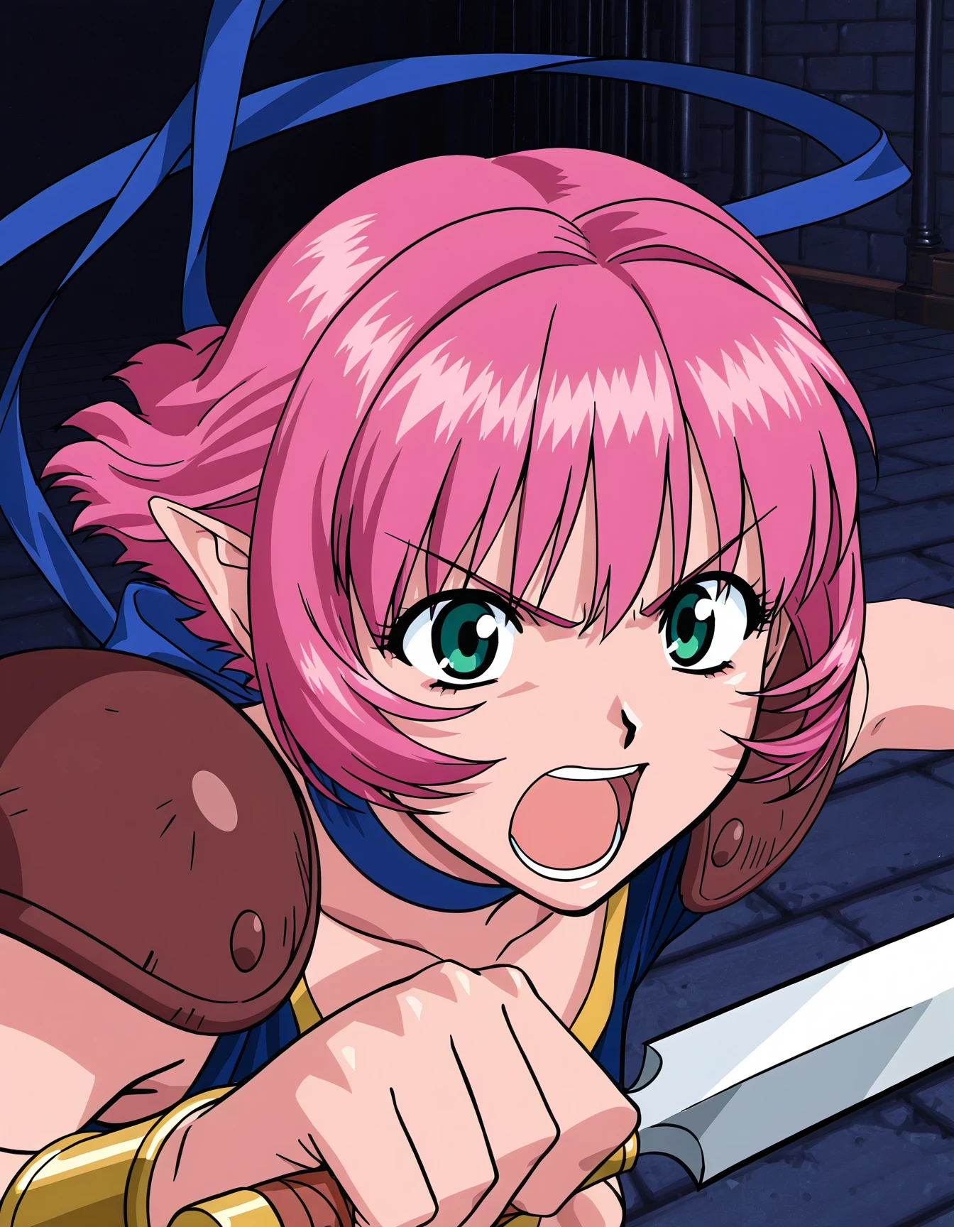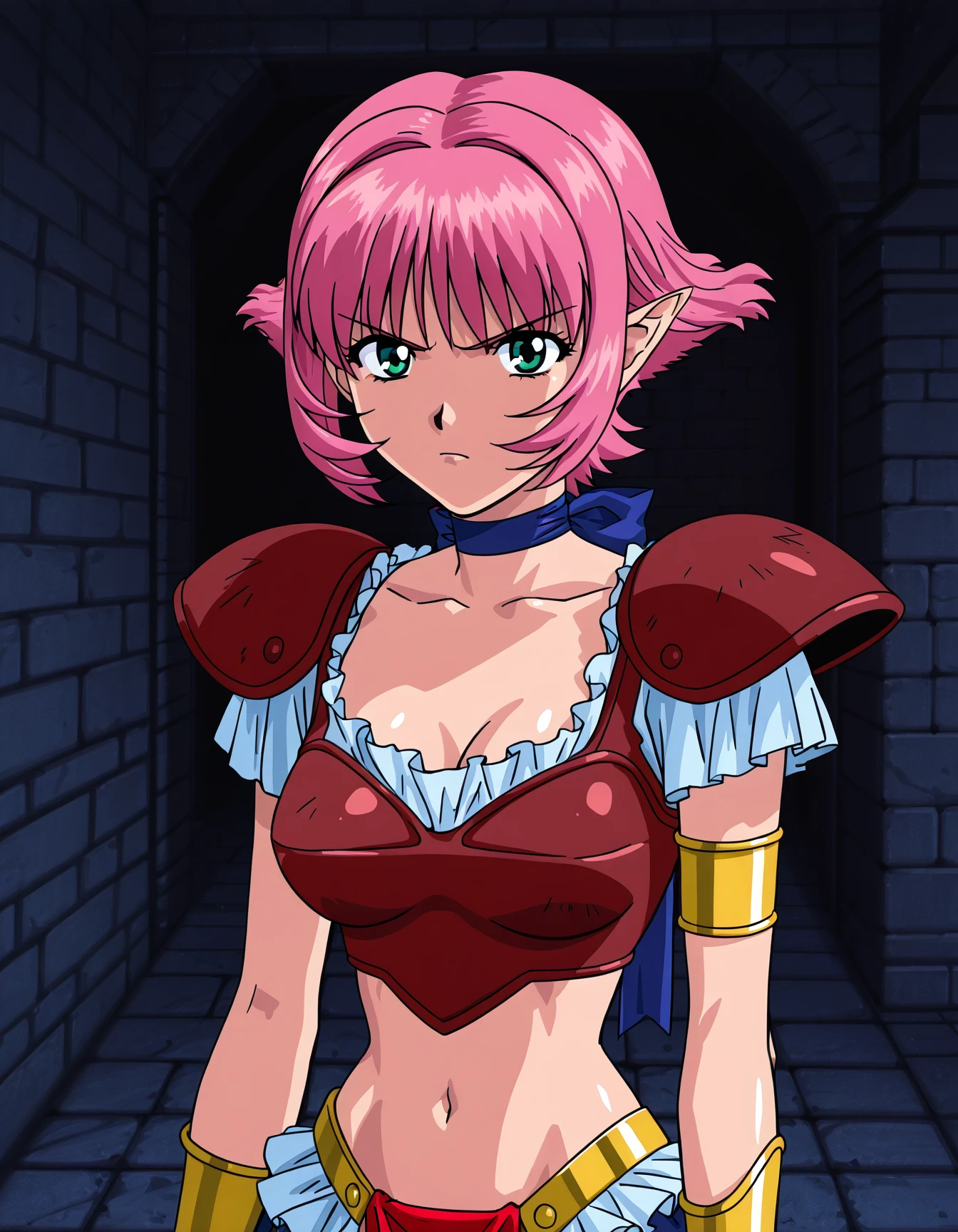 c47ap1n, (pink hair:0.6), (green eyes:0.5), ribbon choker, shoulder armor, midriff, frills, pelvic curtain, sandals