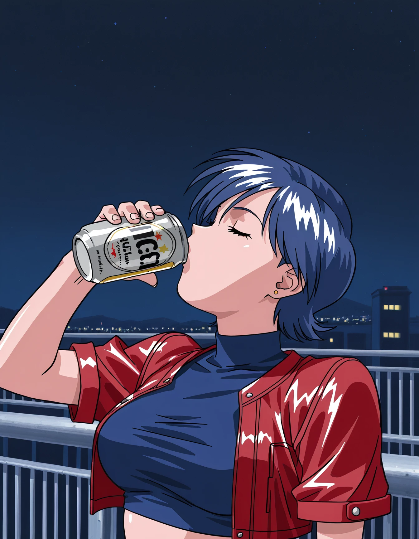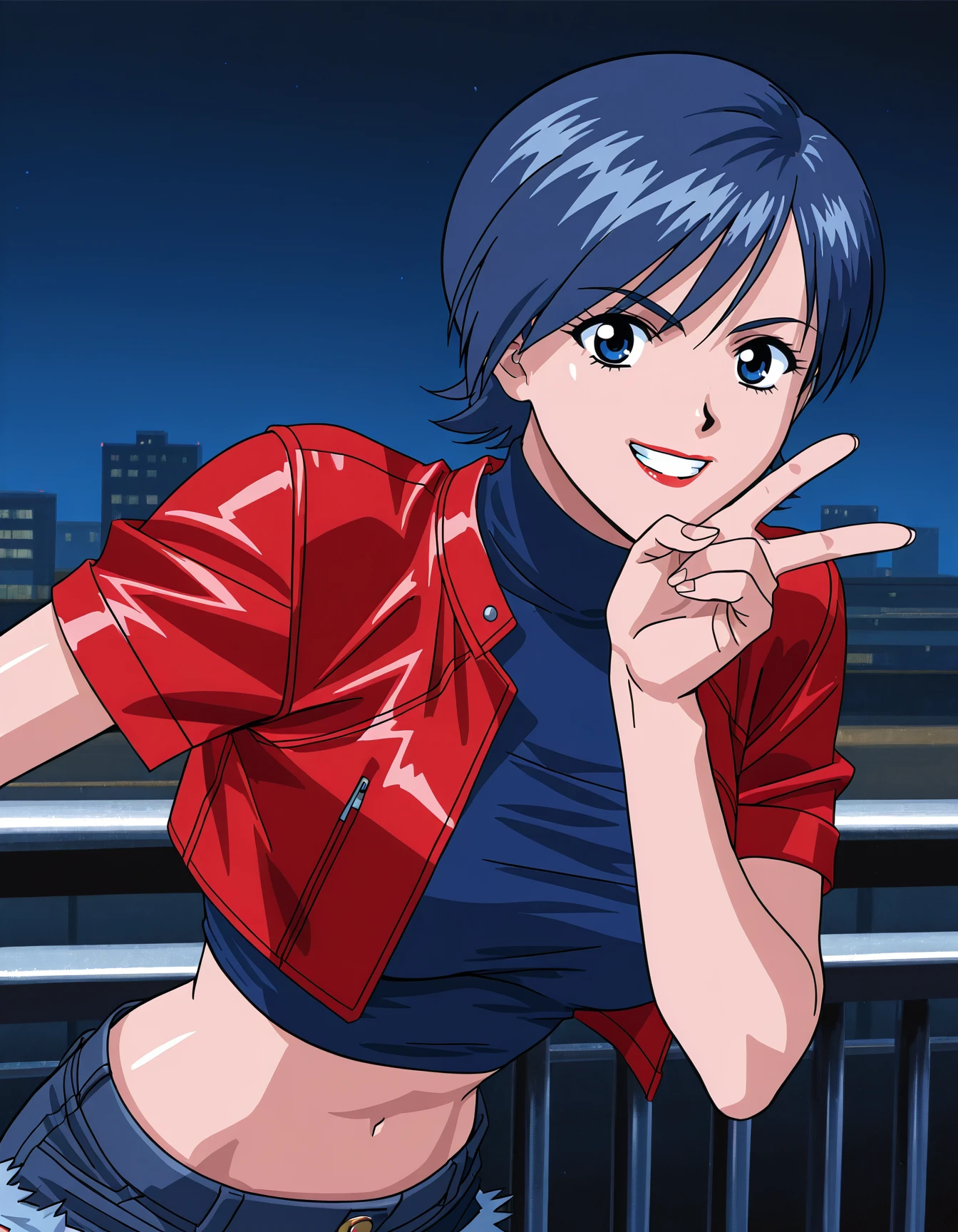 m1k1c0us5, blue hair, blue eyes, (red lips:0.6), blue shirt, turtleneck, crop top, short sleeves, cutoffsm1k1c0us5, blue hair, blue eyes, (red lips:0.6), blue shirt, turtleneck, crop top, short sleeves, red jacket, cropped jacket, open jacket, cutoffs