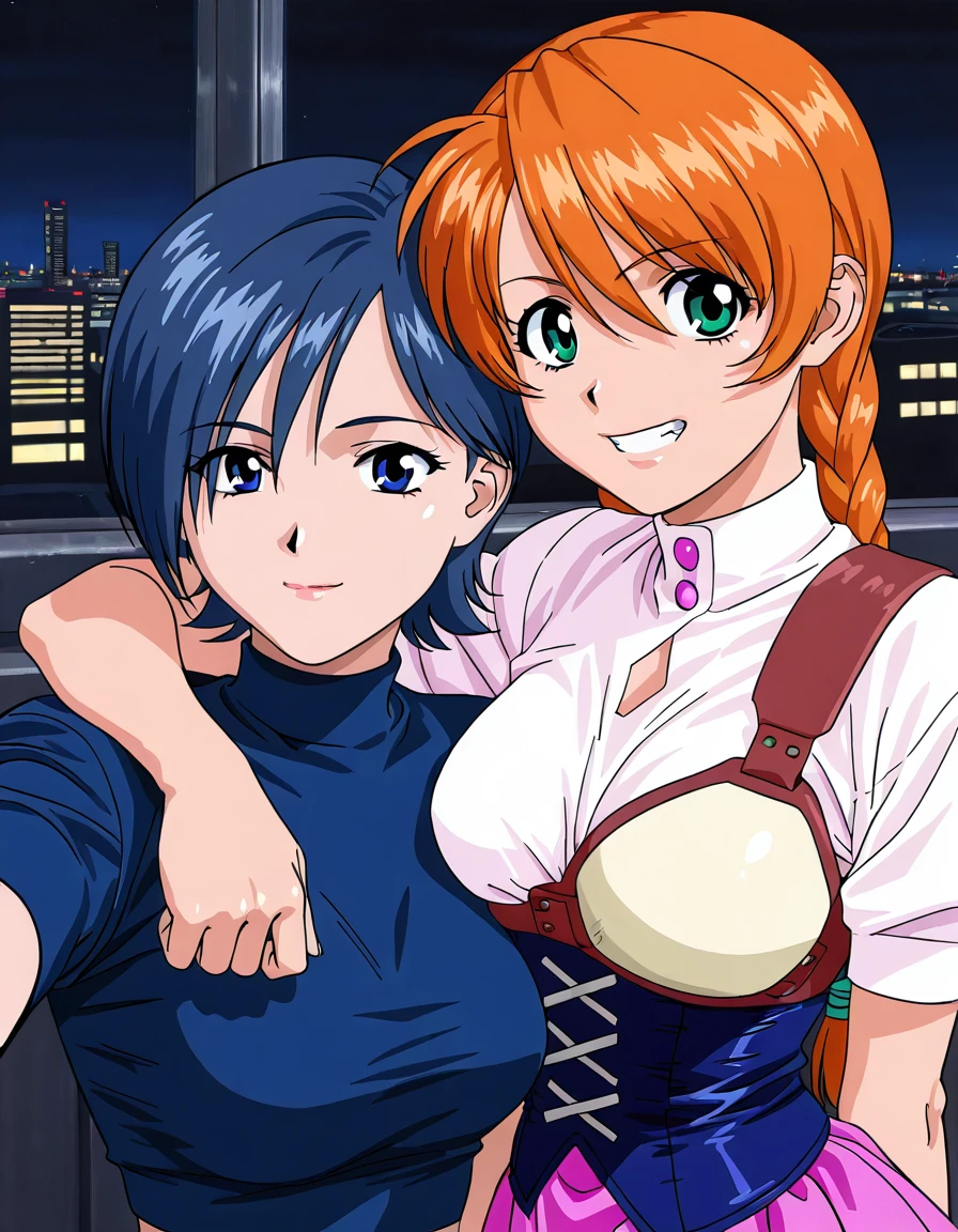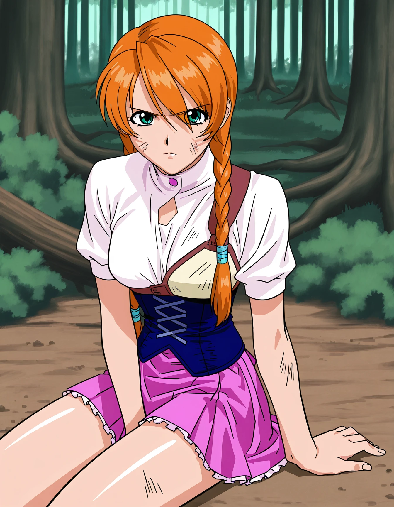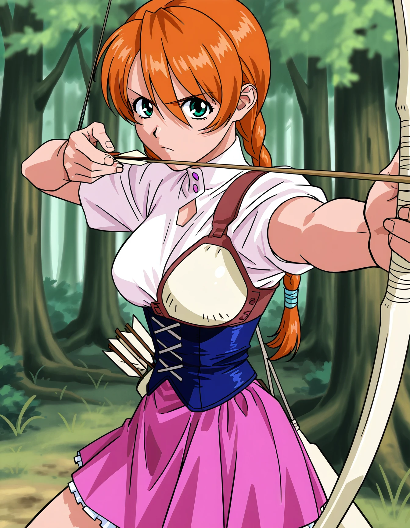 a4ch4j074, (twin braids:0.6), (orange hair:0.6), (green eyes:0.6), short sleeves, white shirt, muneate, corset, blue corset, pink skirt, miniskirt