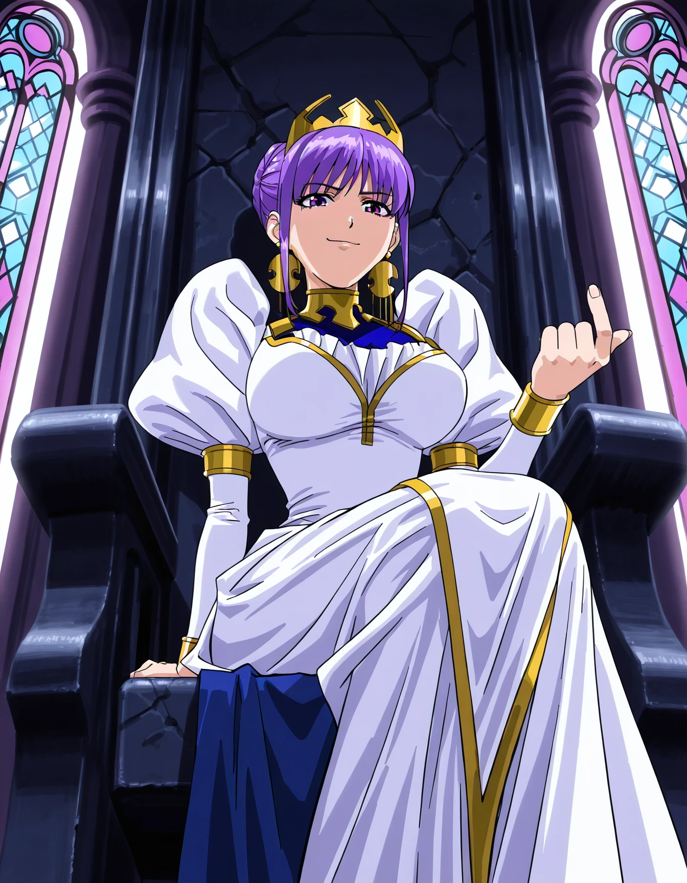 ju713t74, single hair bun, (purple hair:0.6), (purple eyes:0.6), crown, earrings, white dress, (blue dress:0.8), puffy sleeves