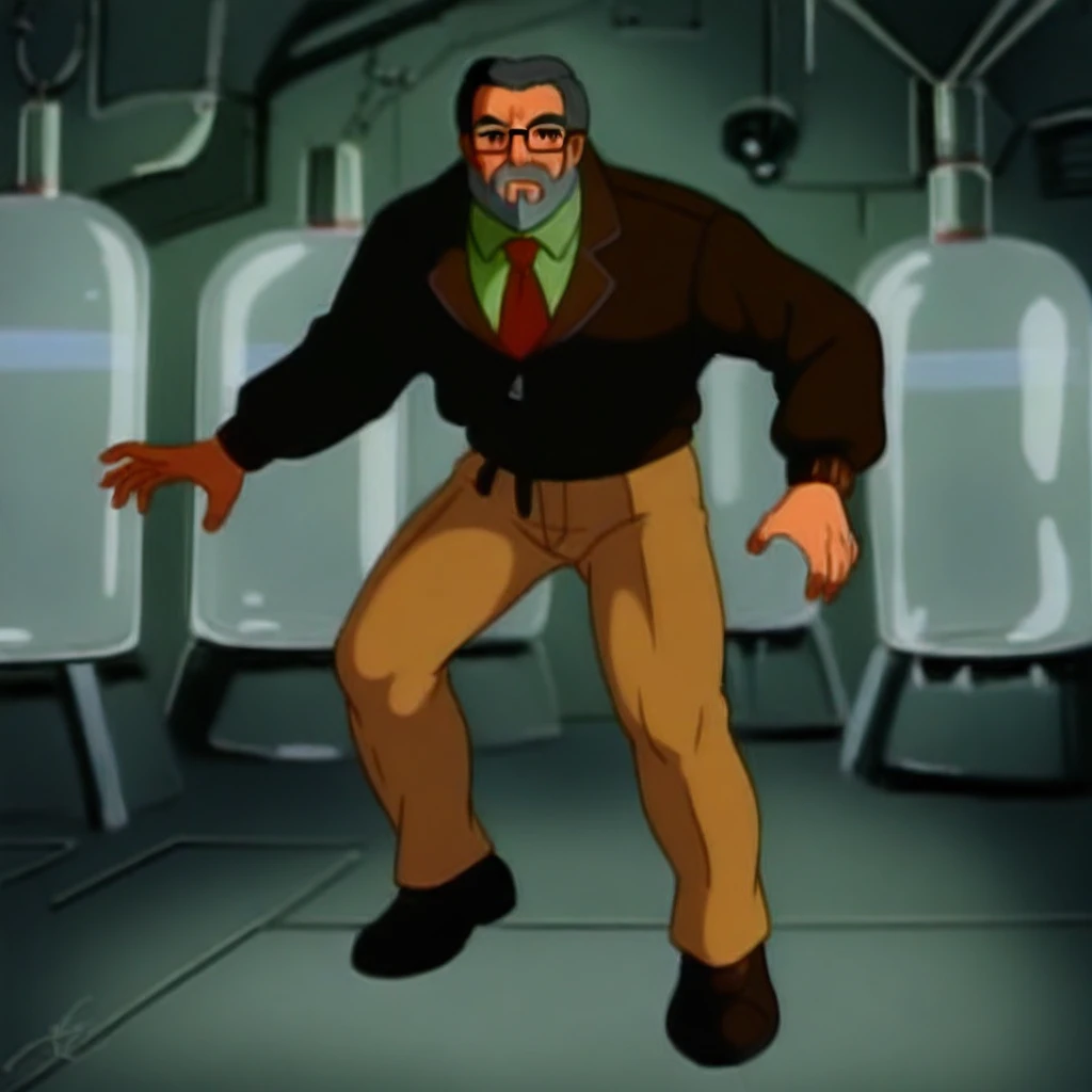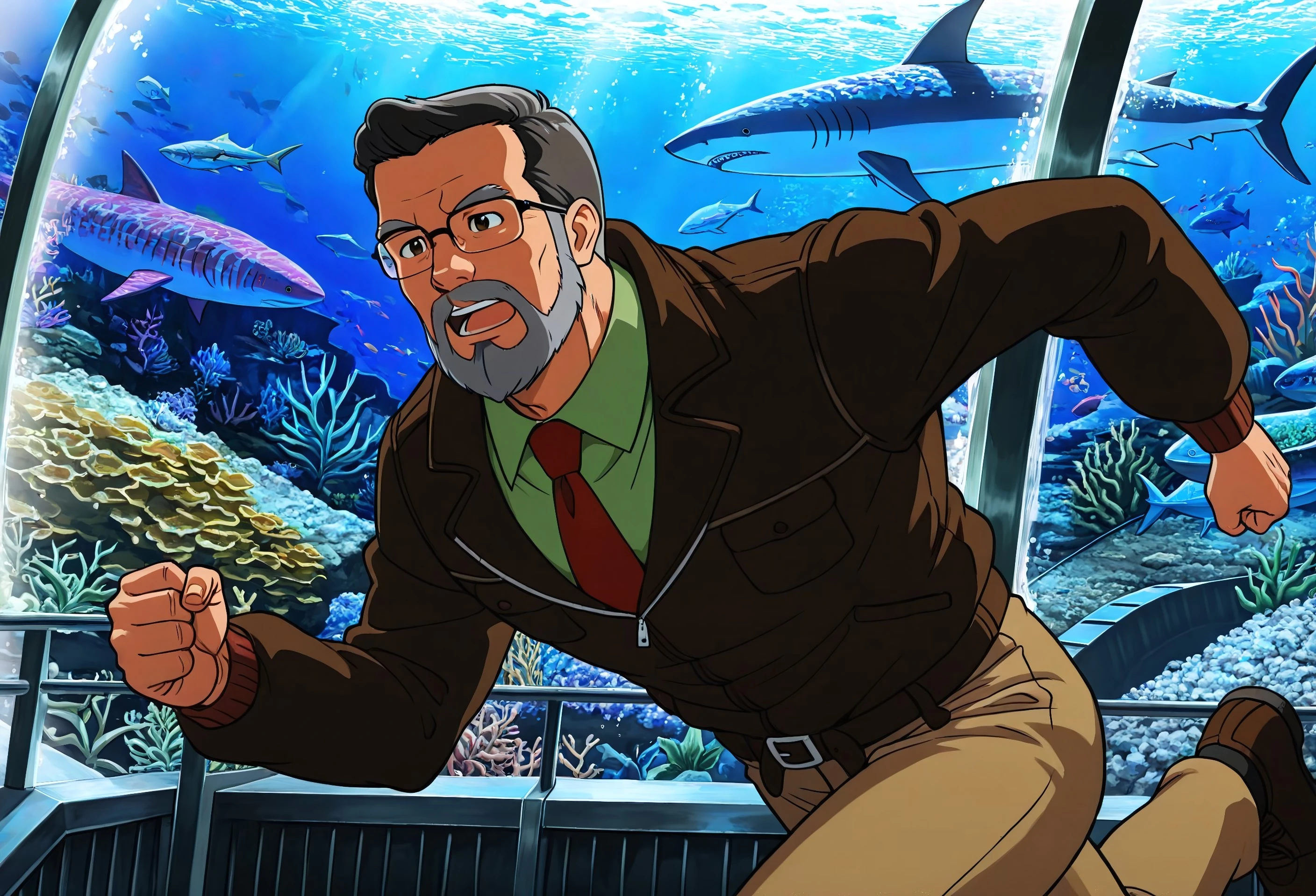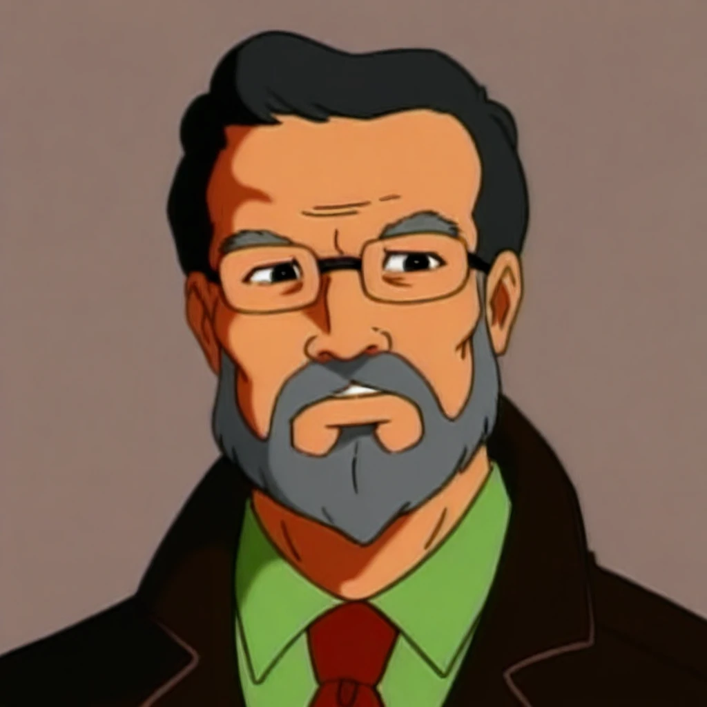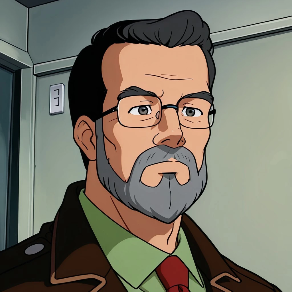 DrB_Shark, gray hair, facial hair, gray beard, glasses, brown jacket, green shirt, red tie, khakis