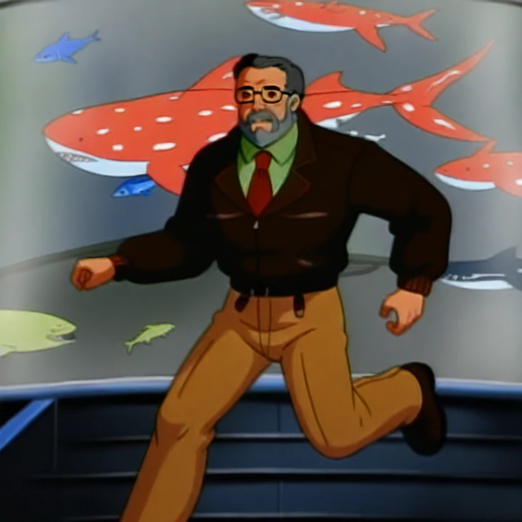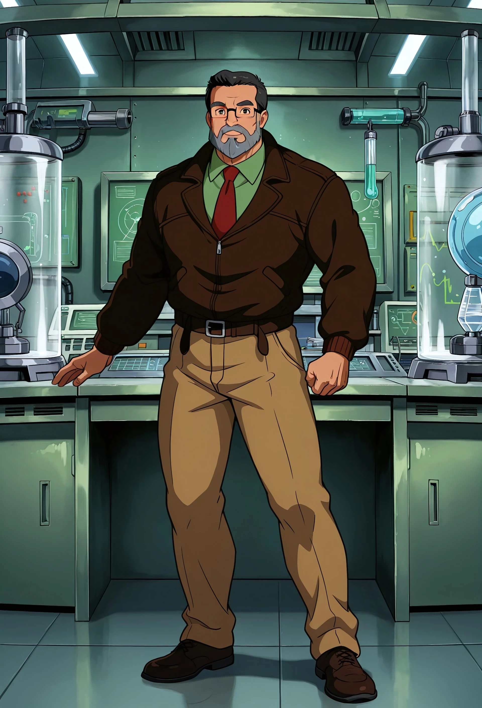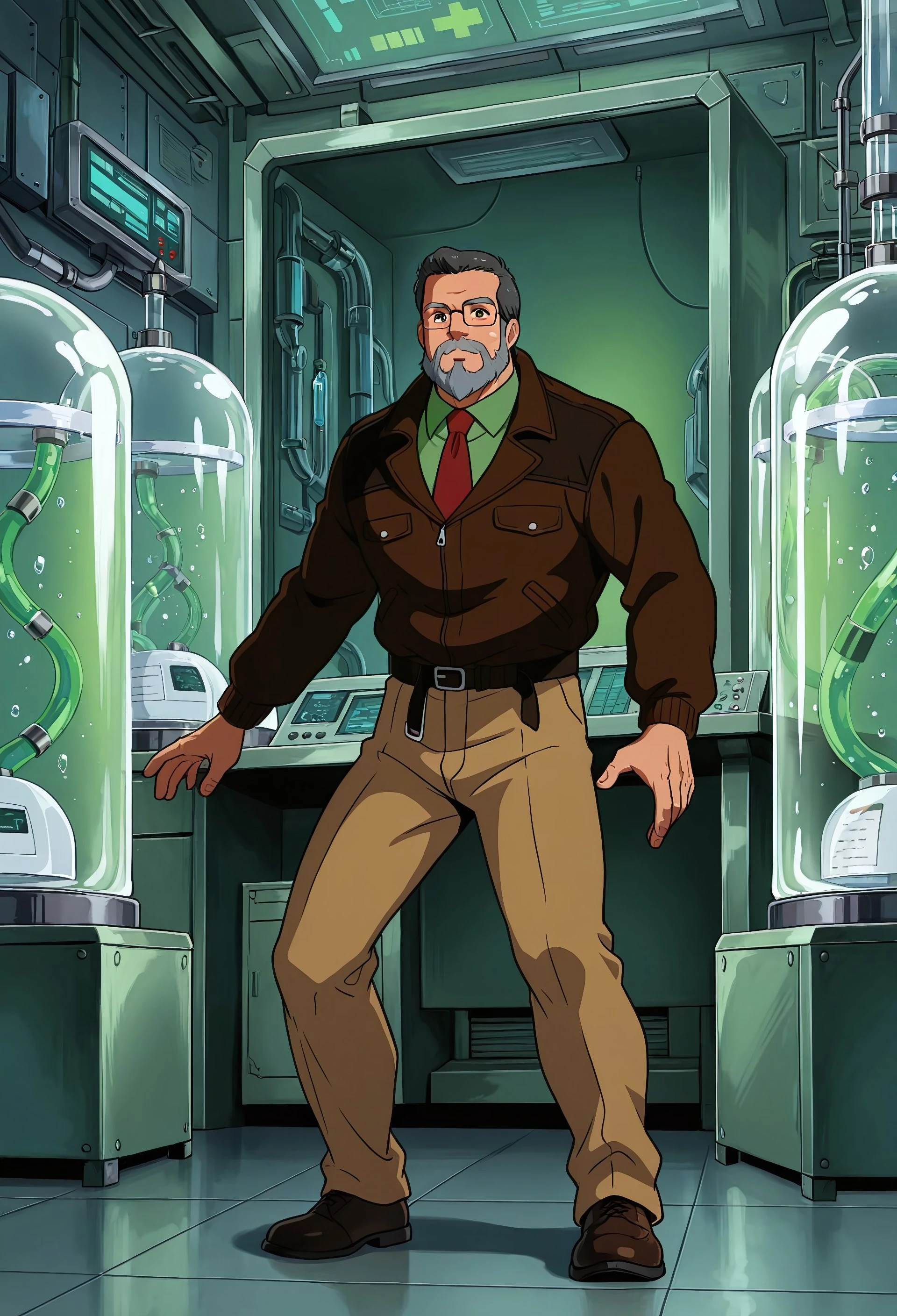 DrB_Shark, gray hair, facial hair, gray beard, glasses, brown jacket, green shirt, red tie, khakis