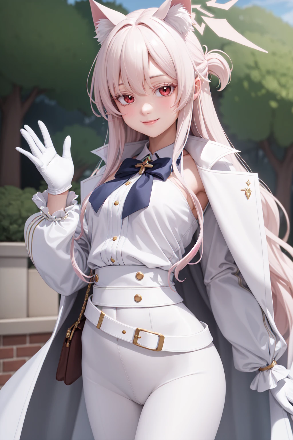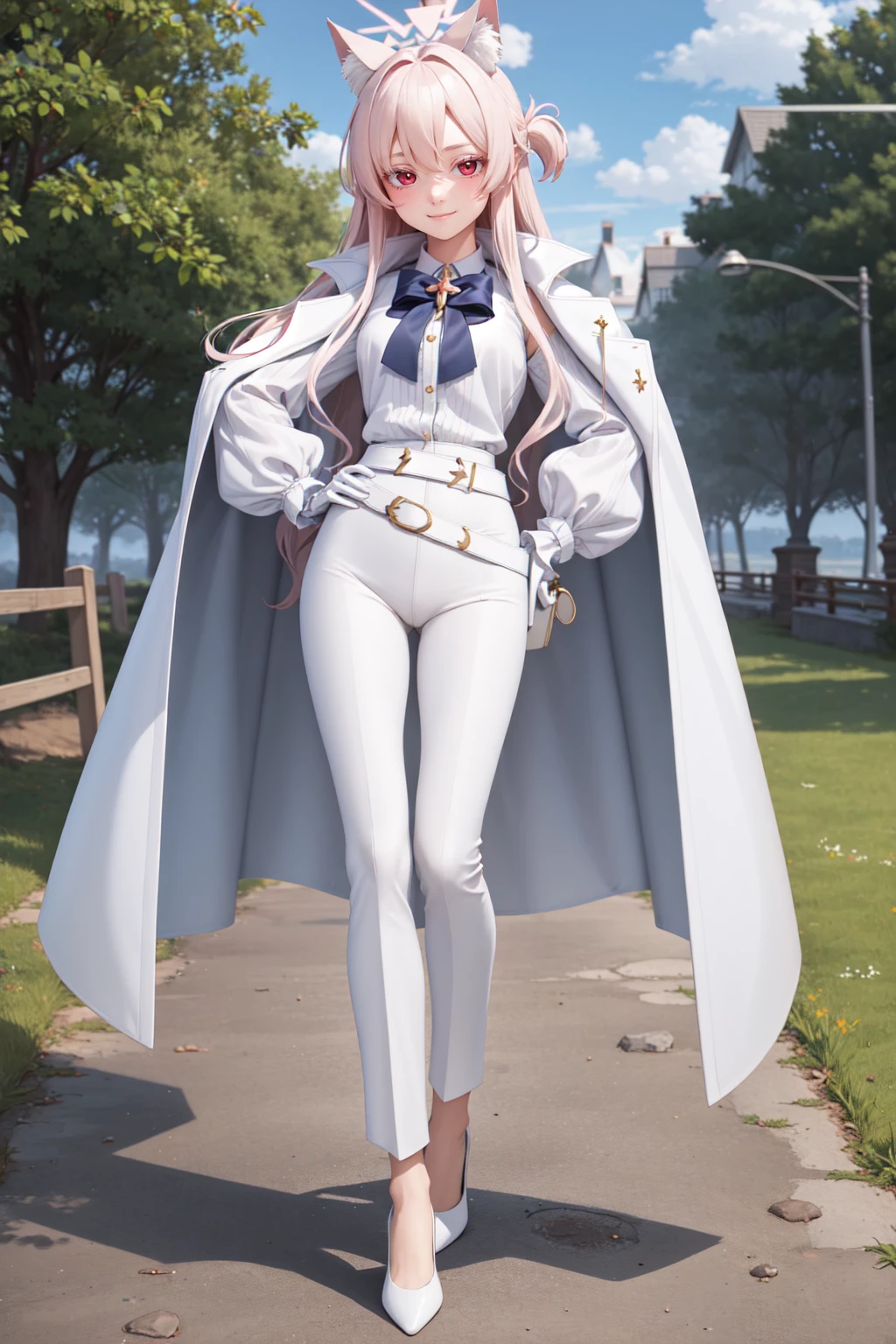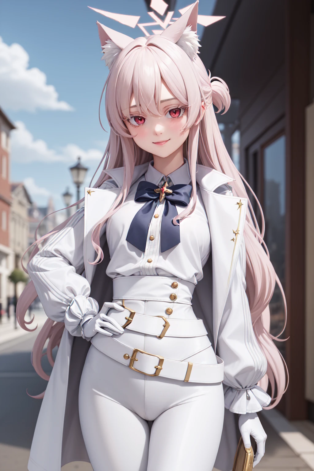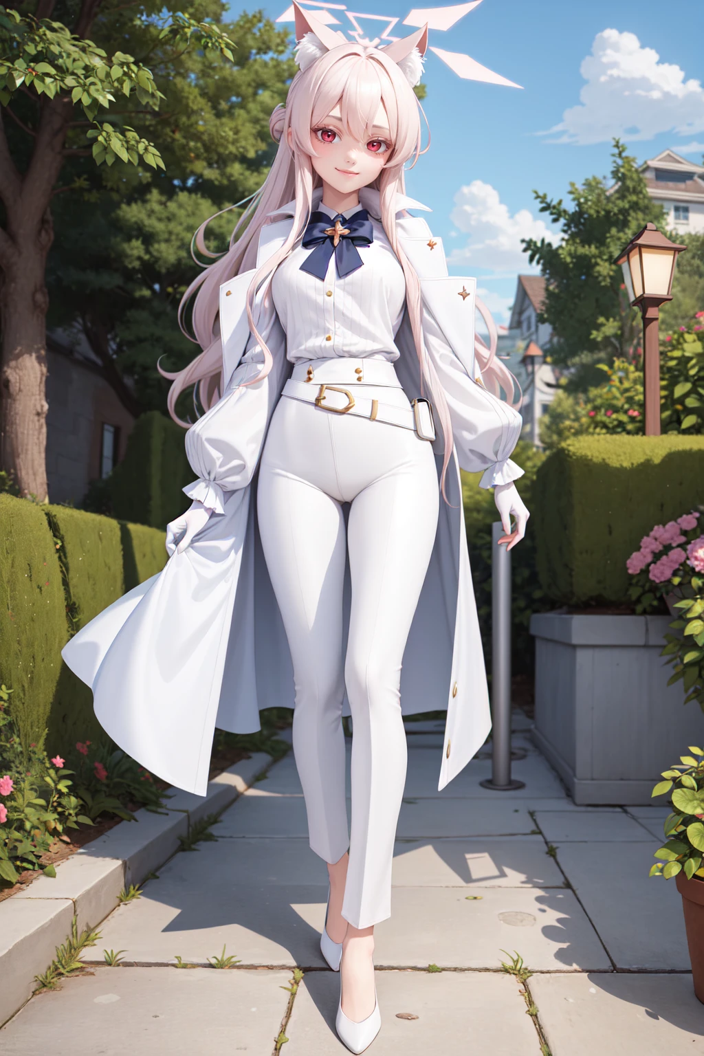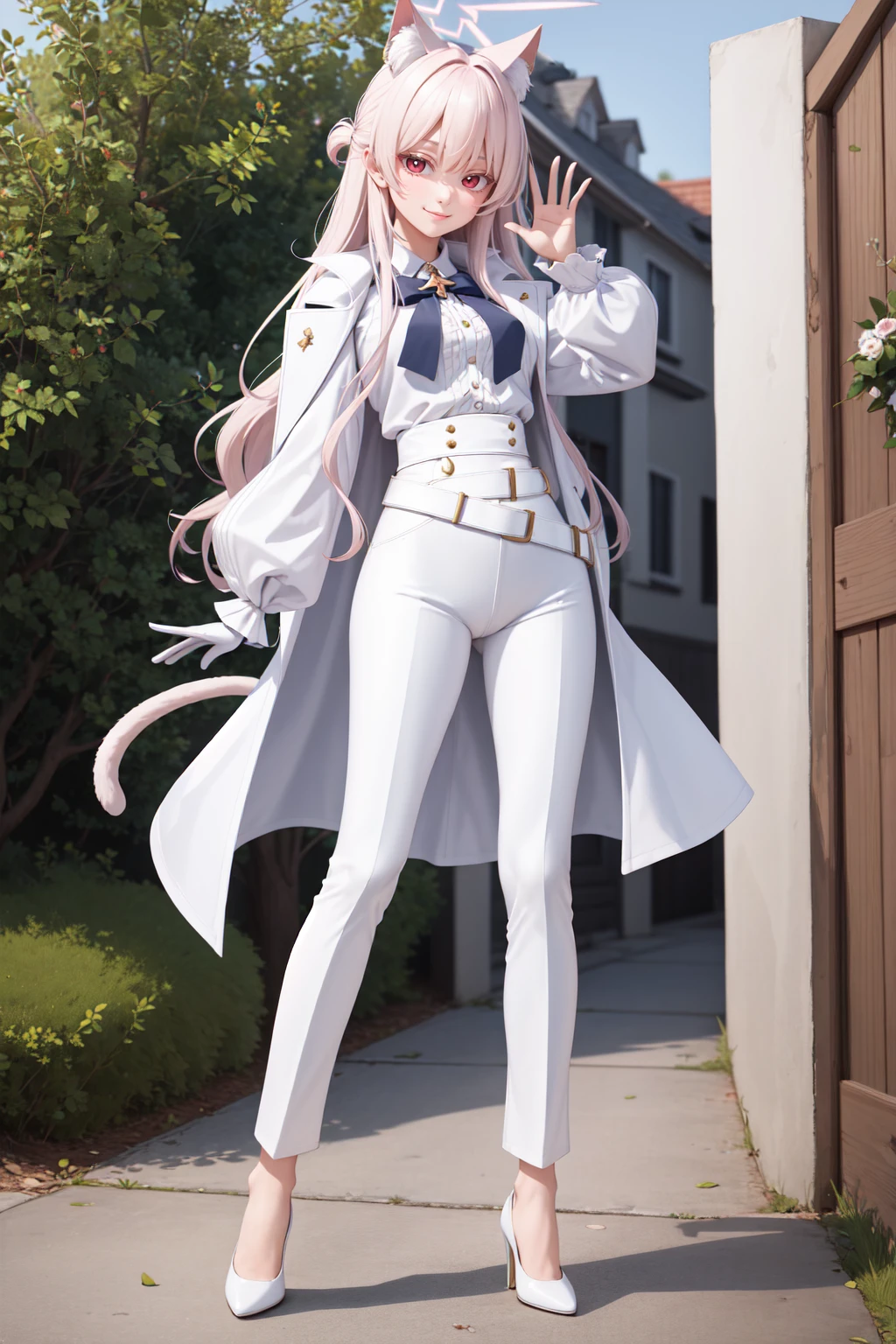 Outfit : white gloves, gloves, white shirt, white pantyhose, belt, white coat, open coat, cat tails, white pants, high heels,