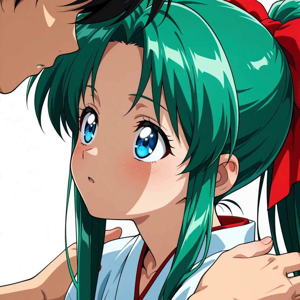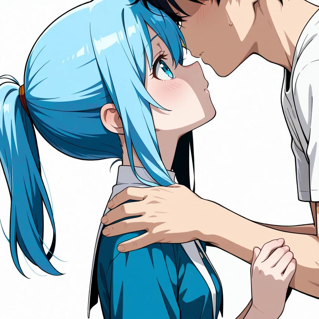 The composition focuses on the girl’s face turned diagonally upward, with only the lower part of the male partner’s face (mainly the mouth) visible in frame.