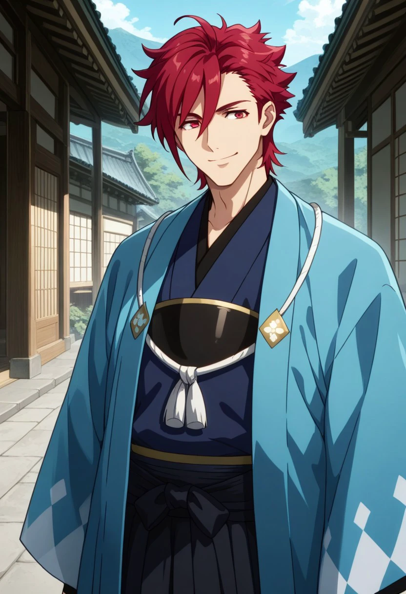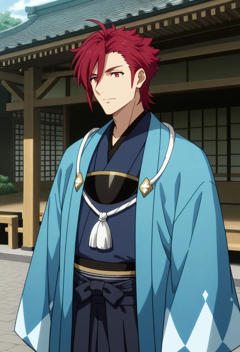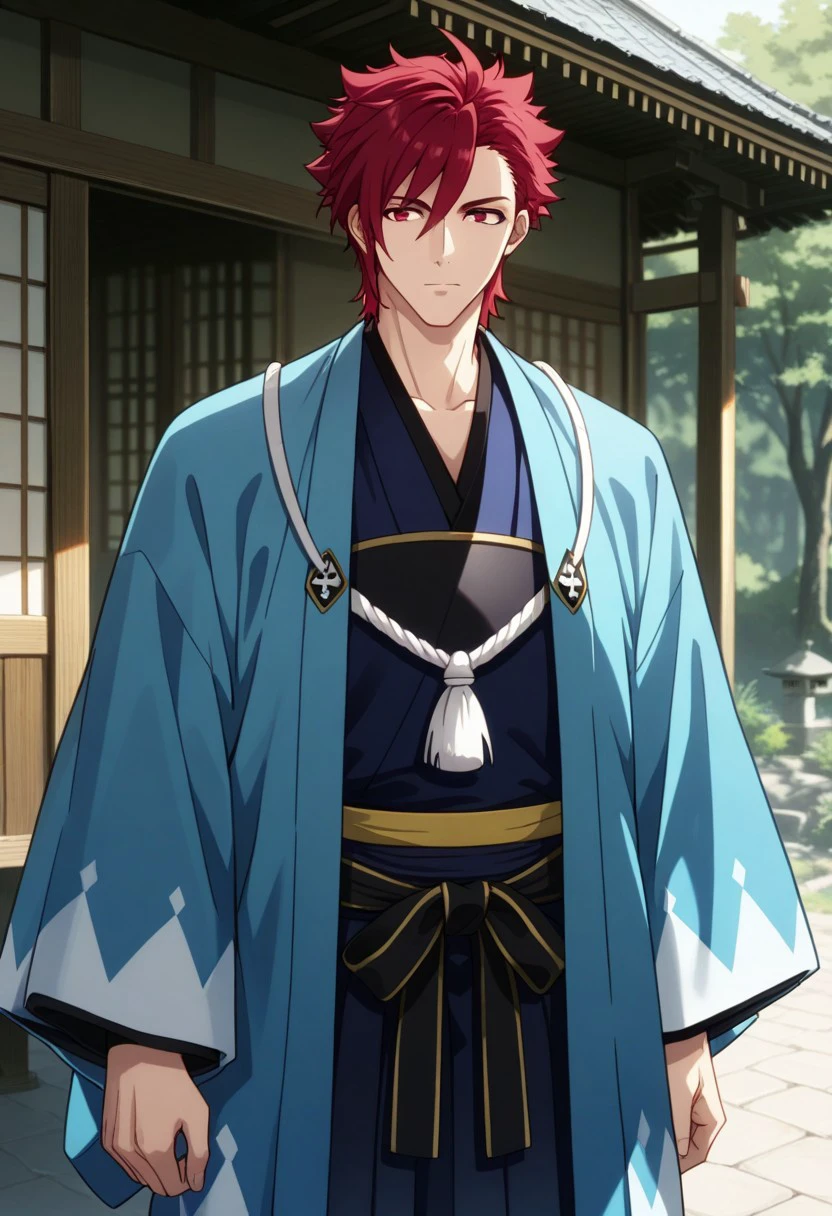 arcberg, 1boy, male focus, solo, red eyes, red hair, short hair, japanese clothes, kimono, haori, blue kimono, sash,