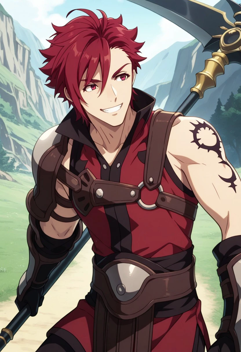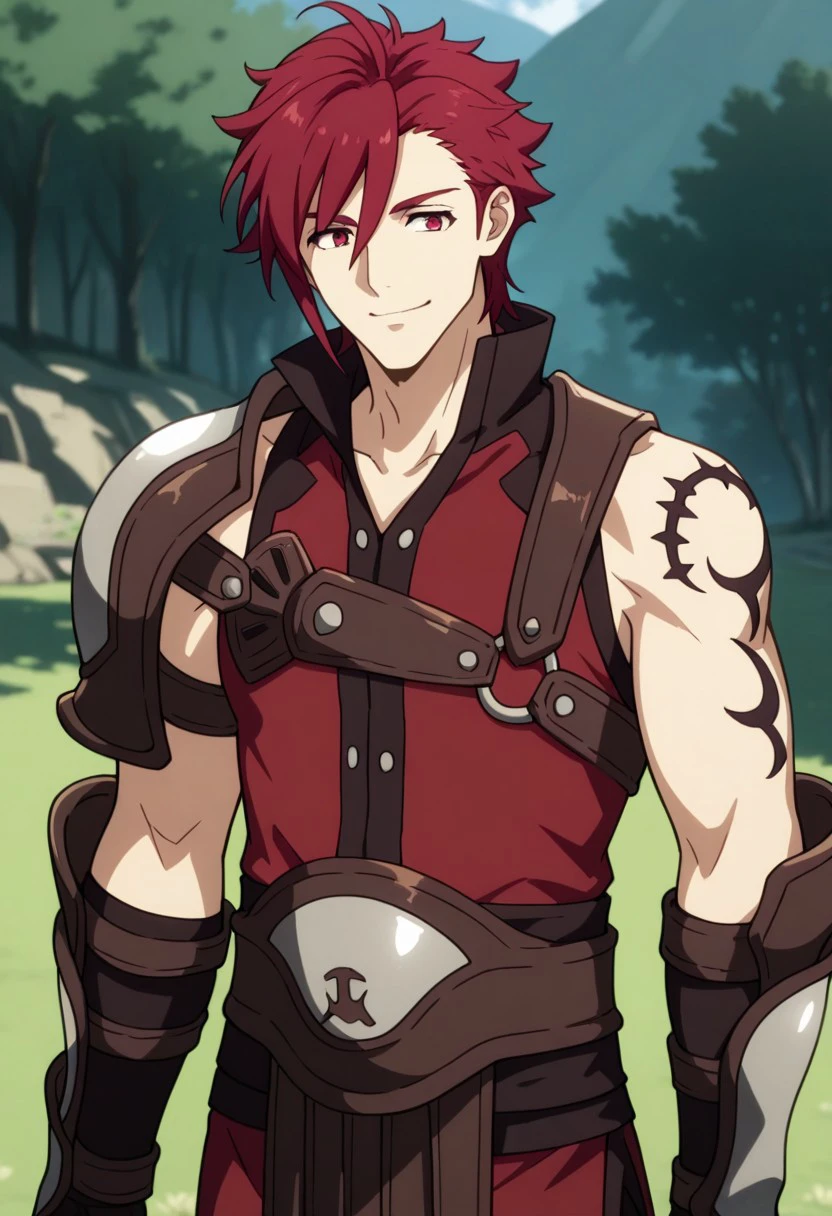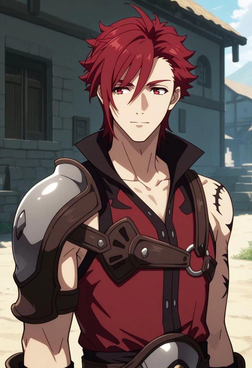arcberg, 1boy, male focus, solo, red eyes, red hair, short hair, tunic, red tunic, popped collar, sleeveless, shoulder tattoo, armor, shoulder armor, belt, gloves, brown gloves, pants, black pants, boots, knee boots, brown footwear