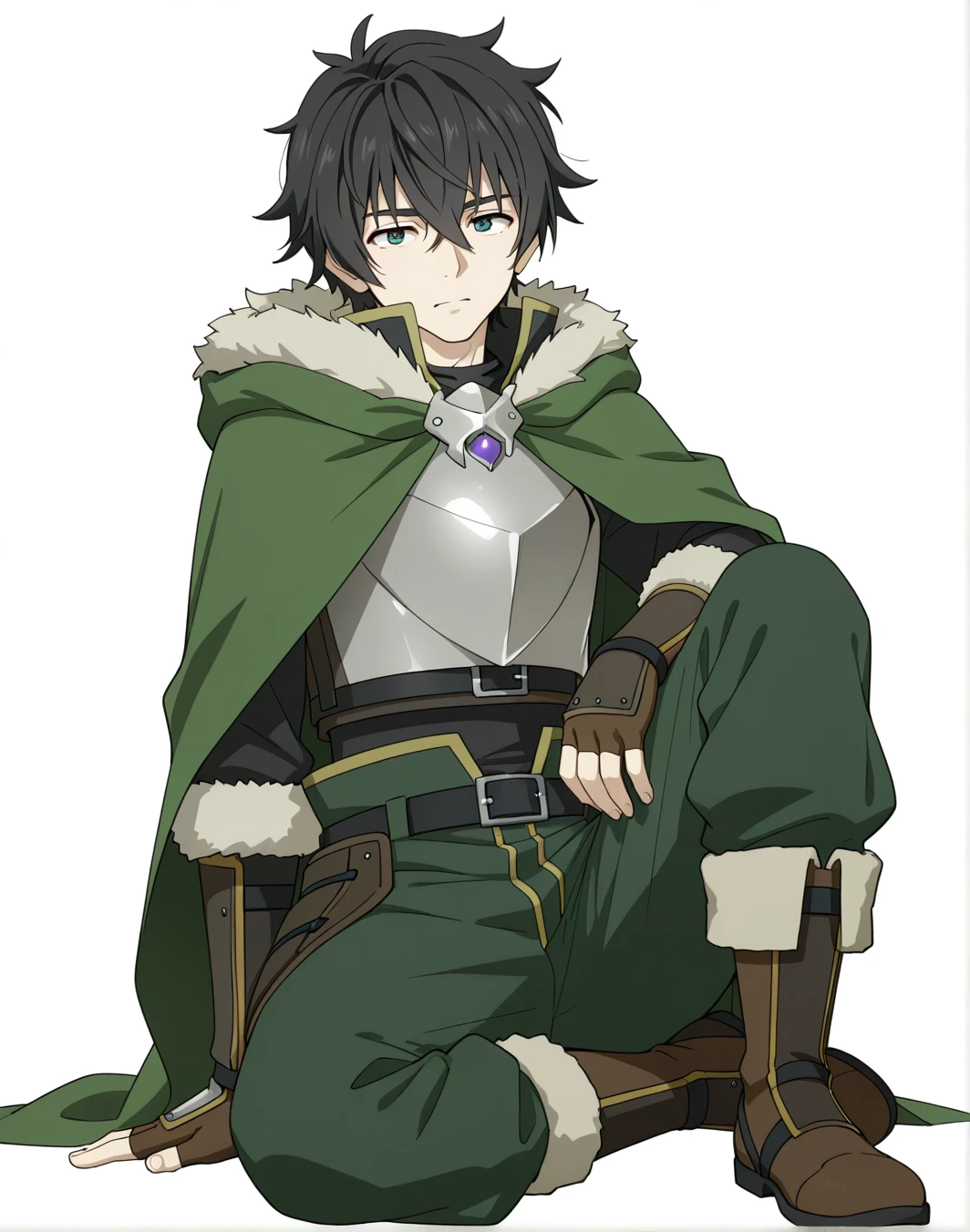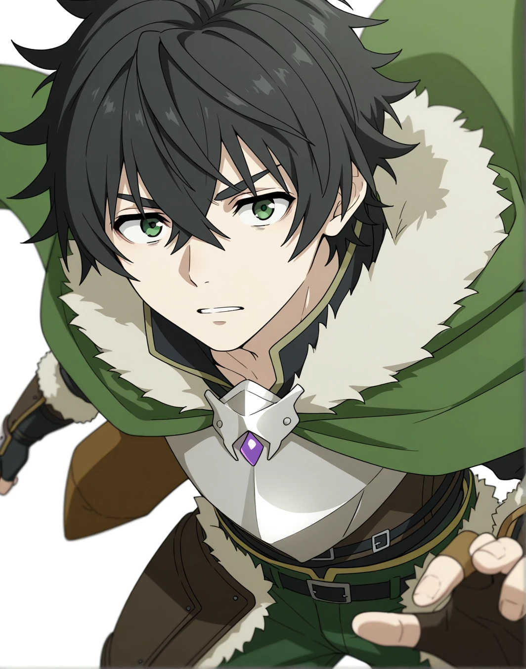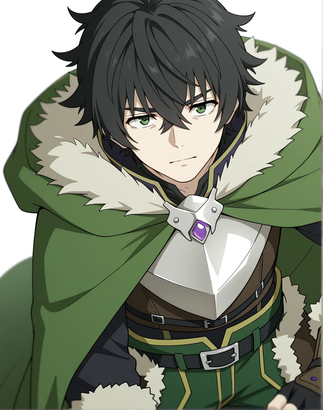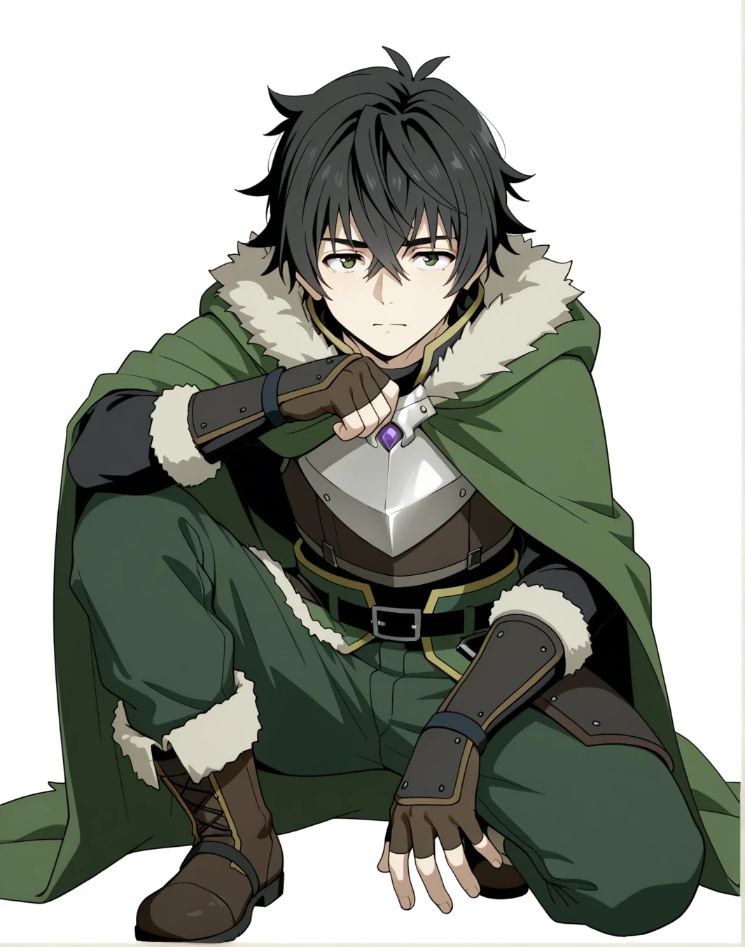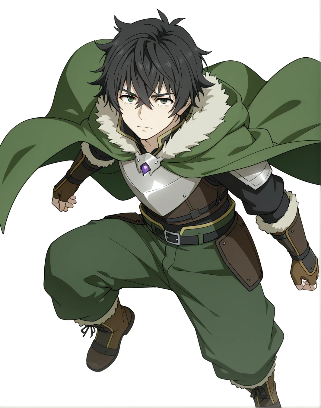 Prompt: Naofumi-Liver020, naofumi, solo, black hair, 1boy, short hair, gloves, green eyes, hair between eyes, male focus, black belt, fingerless gloves, armor, fur trim, cloak, breastplate, green cape, green pants, jewelry, ornaments, fingerless gloves, armor