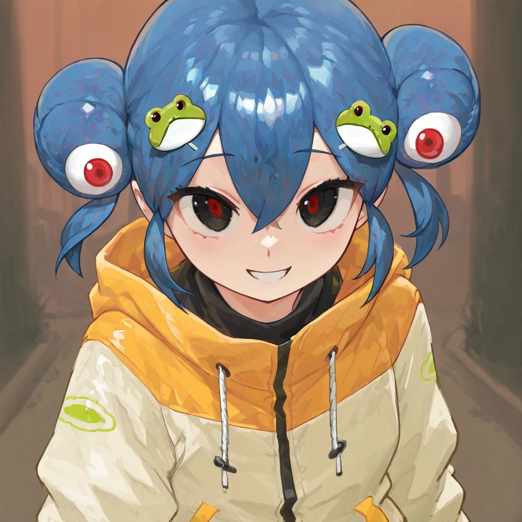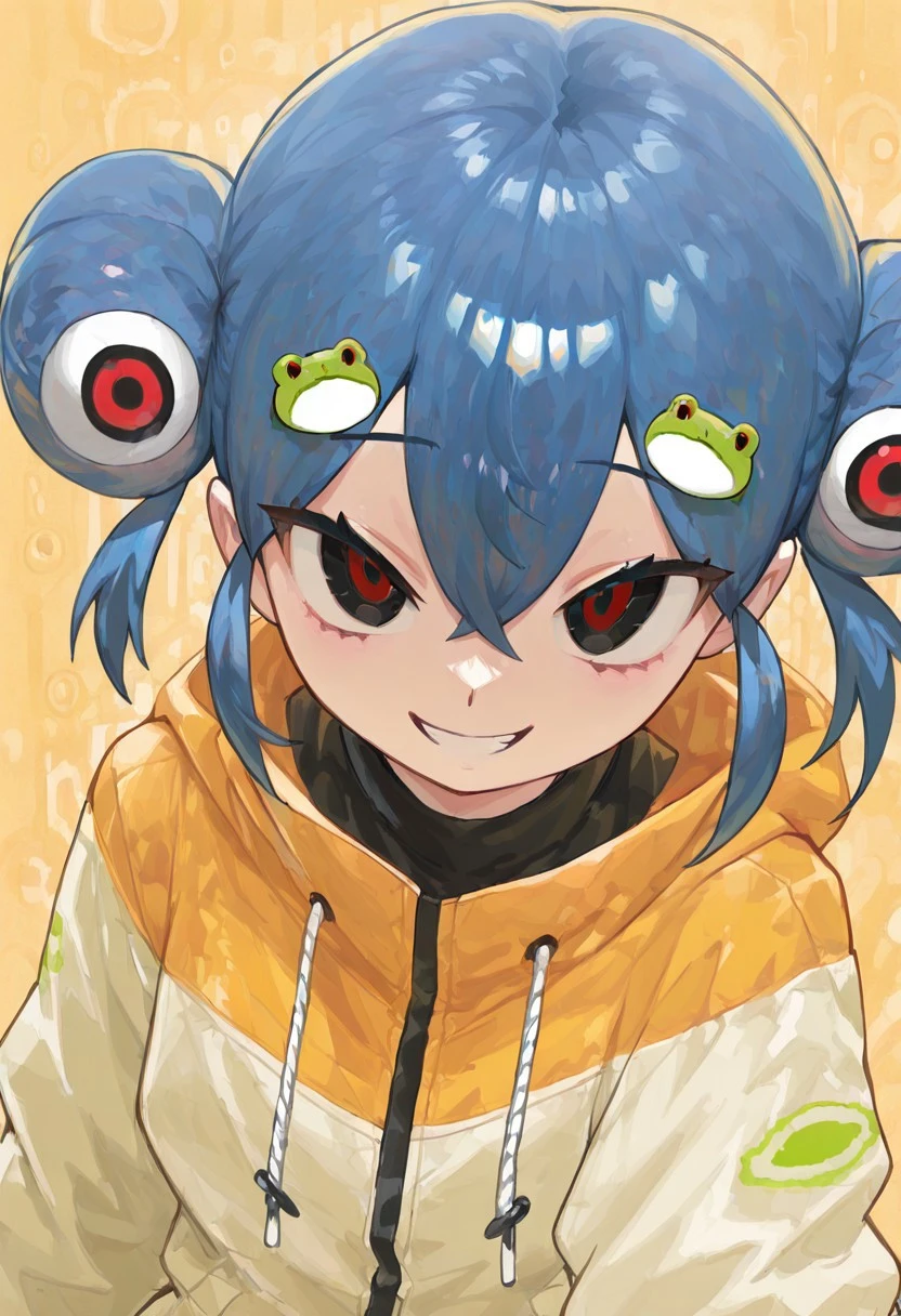 kerchanlu, colorful, anime-style,blue hair,hair betwen eyes, short hair,double buns, hair buns, hair ornament, frog hair ornament, eyes on hair buns, big eyes,