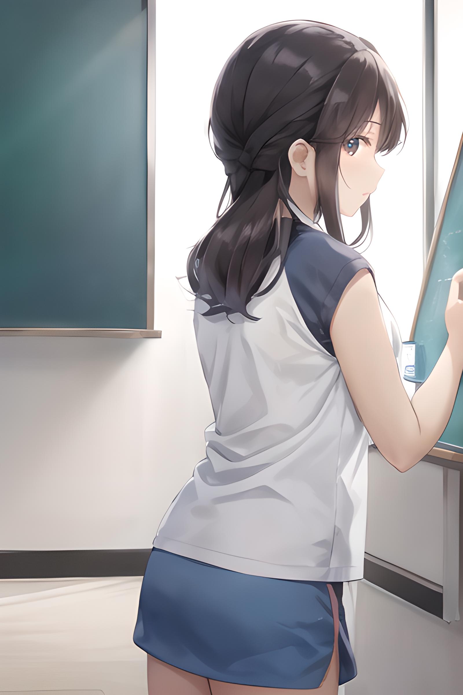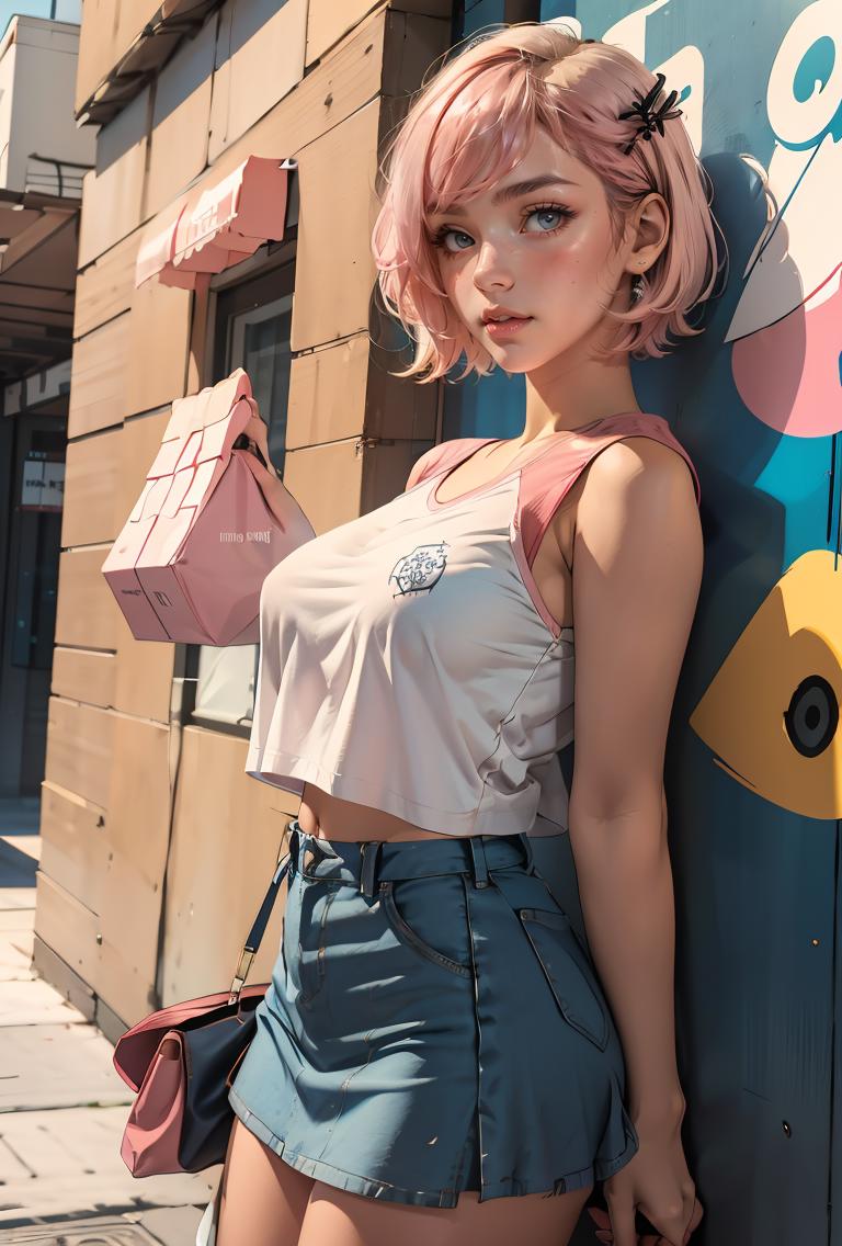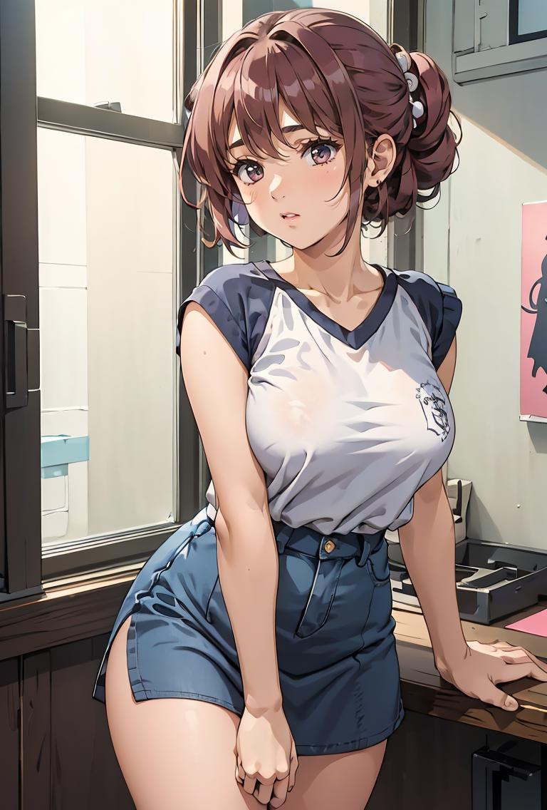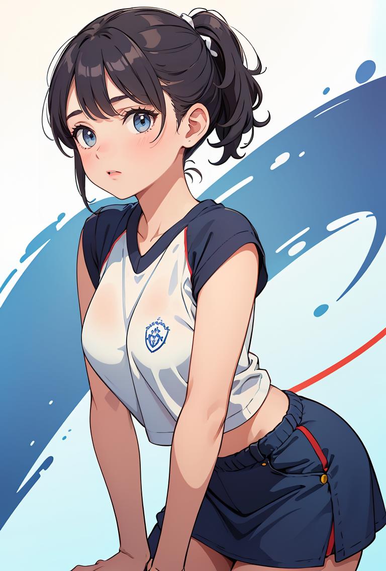 Prompts: white shirt, blue shoulders, bare arms, blue miniskirt (or blue pants)