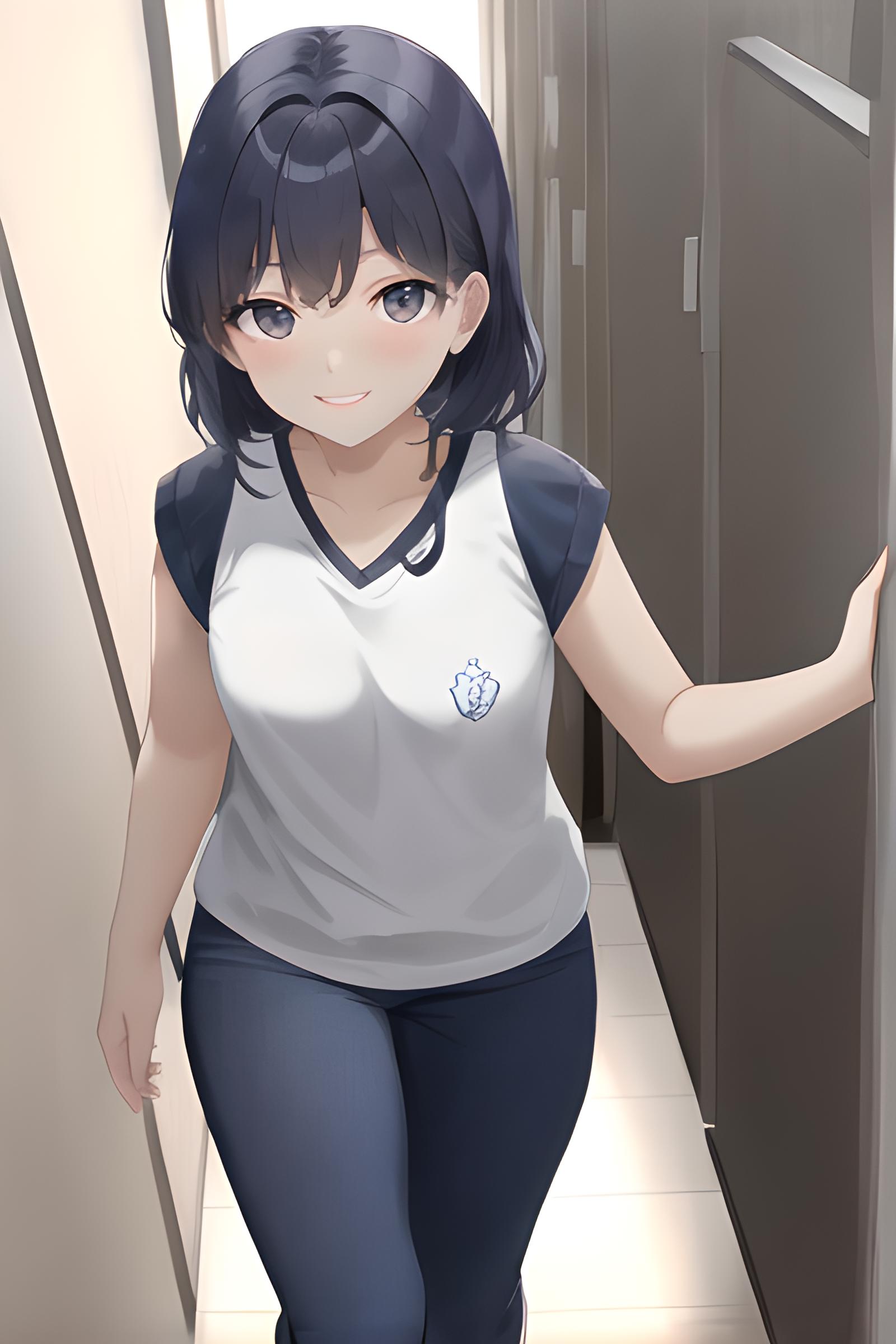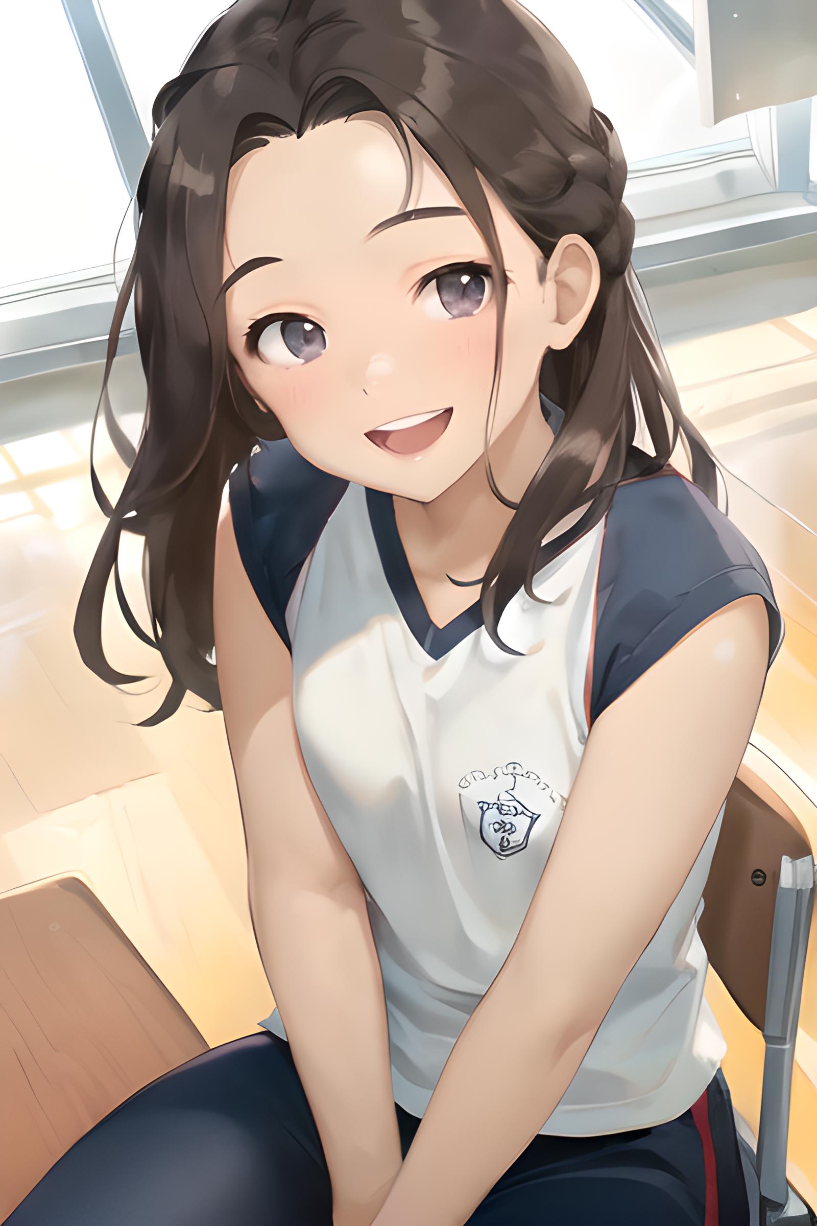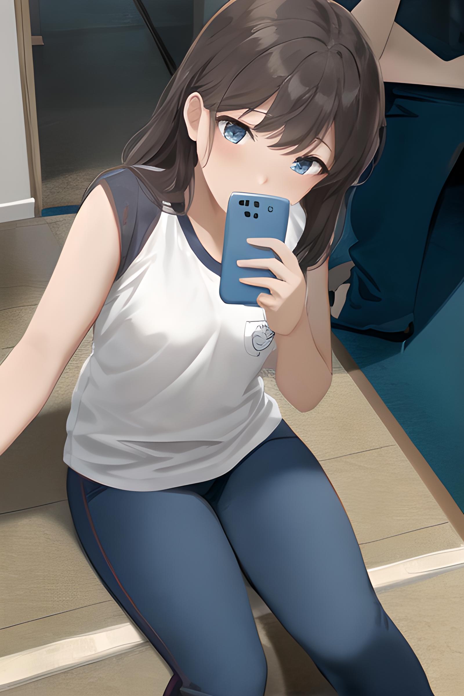 Prompts: white shirt, blue shoulders, bare arms, blue miniskirt (or blue pants)