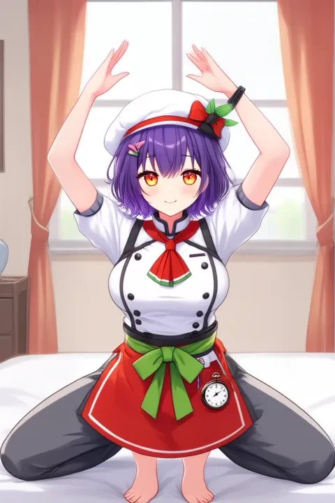 sample prompt:Nanase Suzuna, anime-style girl. The image features an anime-style character with purple hair styled in a messy, slightly tousled manner. The character has large, expressive orange eyes that stand out prominently against their skin tone. They are wearing a white chef's uniform with black accents, including a red bow tie and a green scarf tied around the neck. The character is also wearing a white hat with a red band and a small black bow on top. The character is also wearing a black belt and a red apron with a green bow and a pocket watch hanging from it. The character is also wearing gray pants. (she is dancing:2.5), (chibi Nendoroid:3.5) in bedroom.