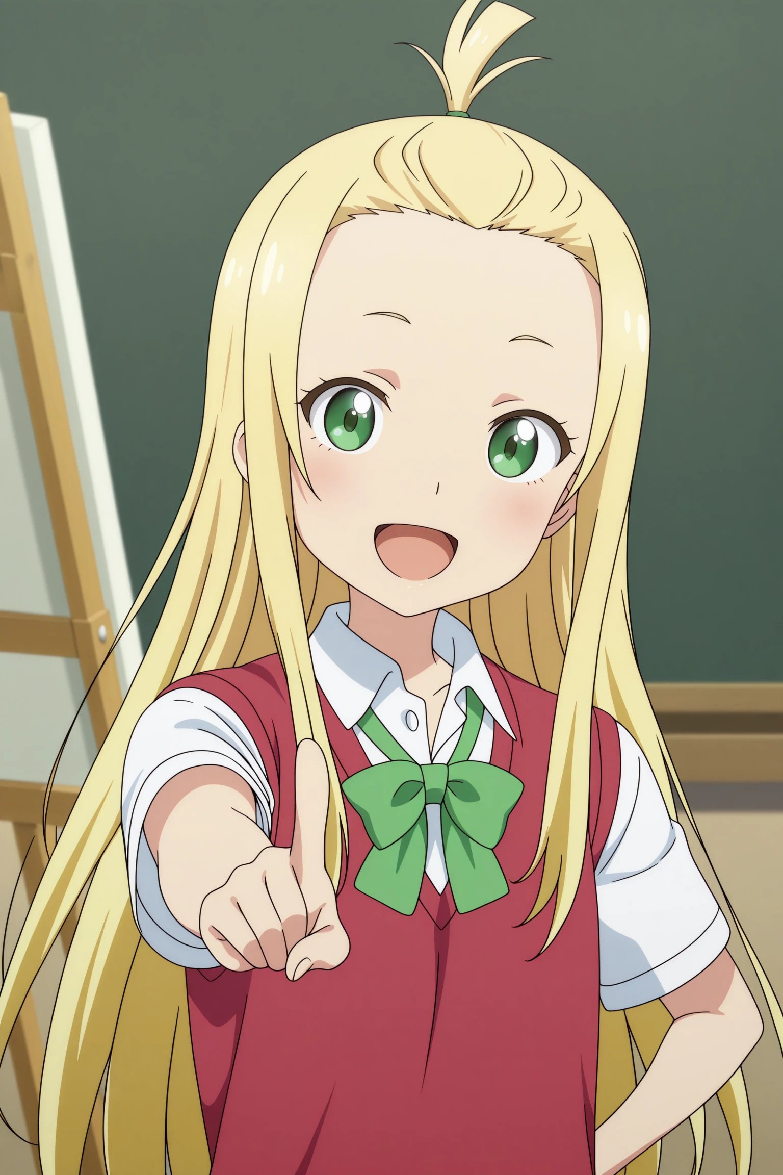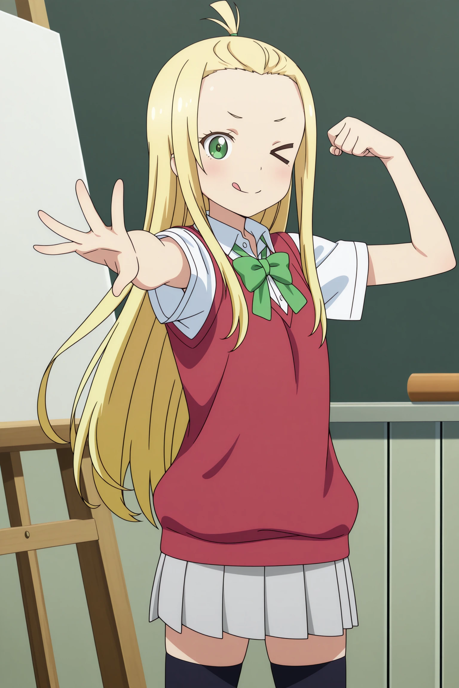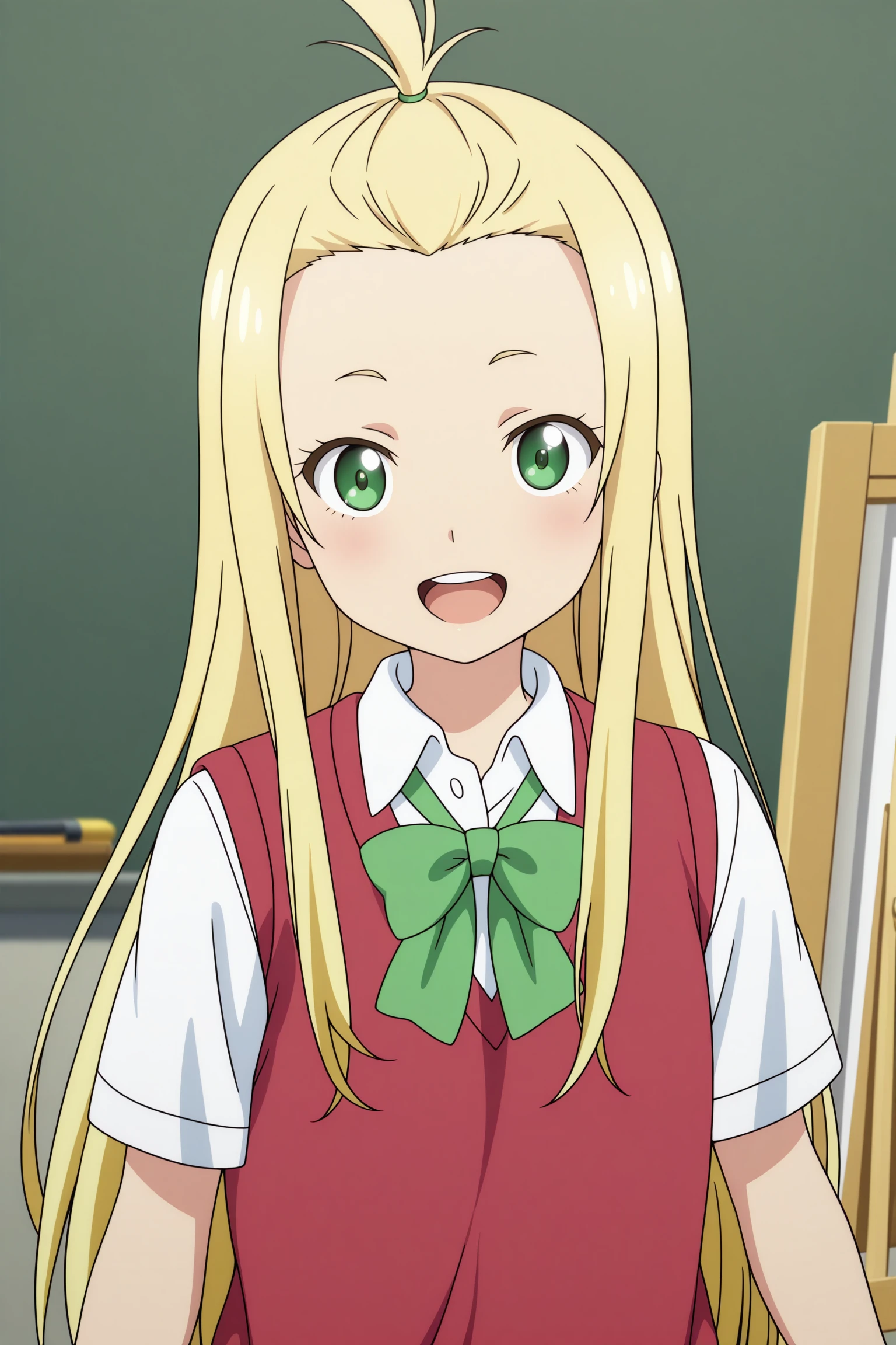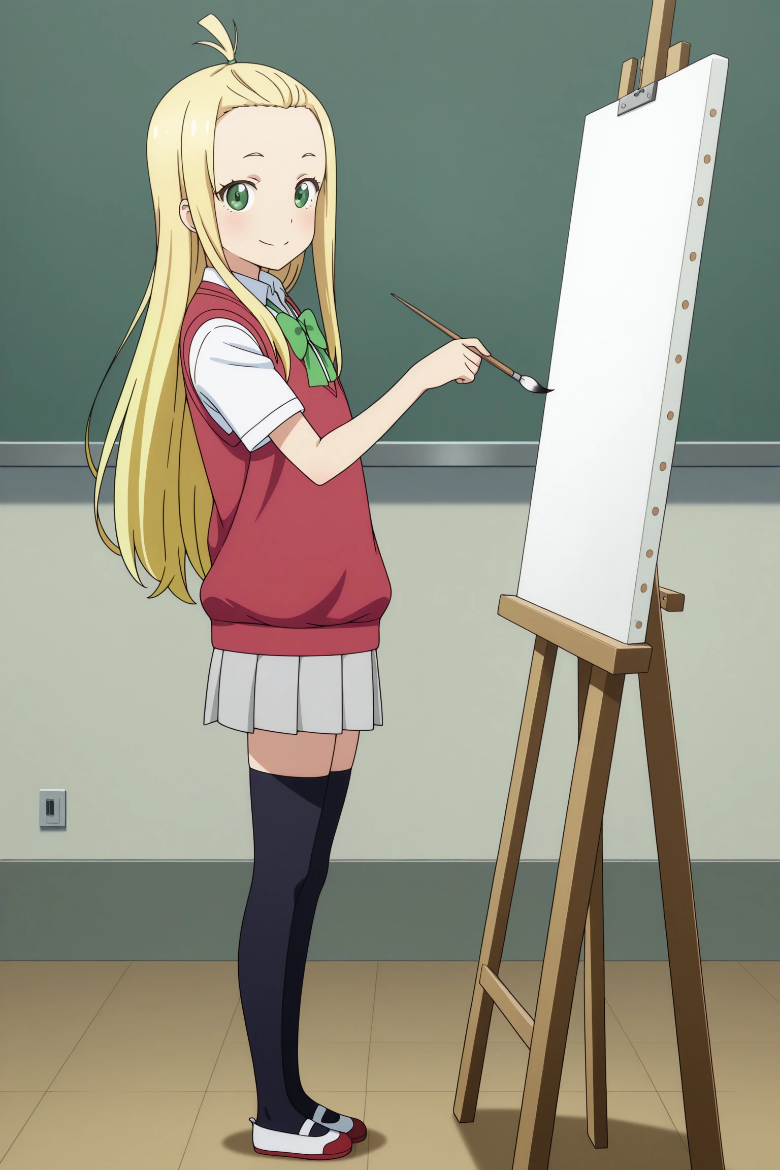 colette, long hair, blonde hair, bangs pinned back, topknot, hair tie, sidelocks, green eyes, short sleeves, red sweater vest, white shirt, collared shirt, green bowtie, grey skirt, pleated skirt, black thighhighs, uwabaki