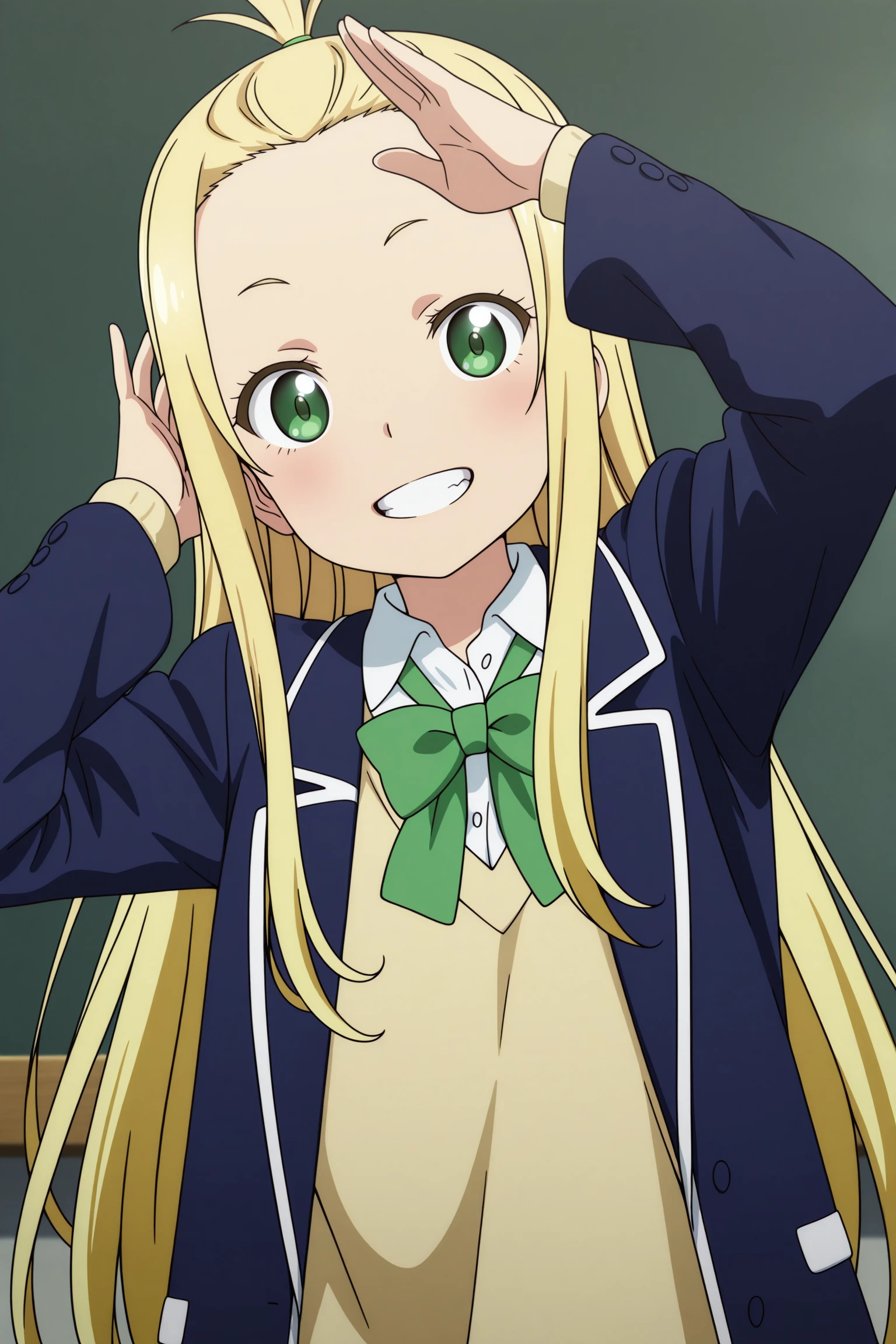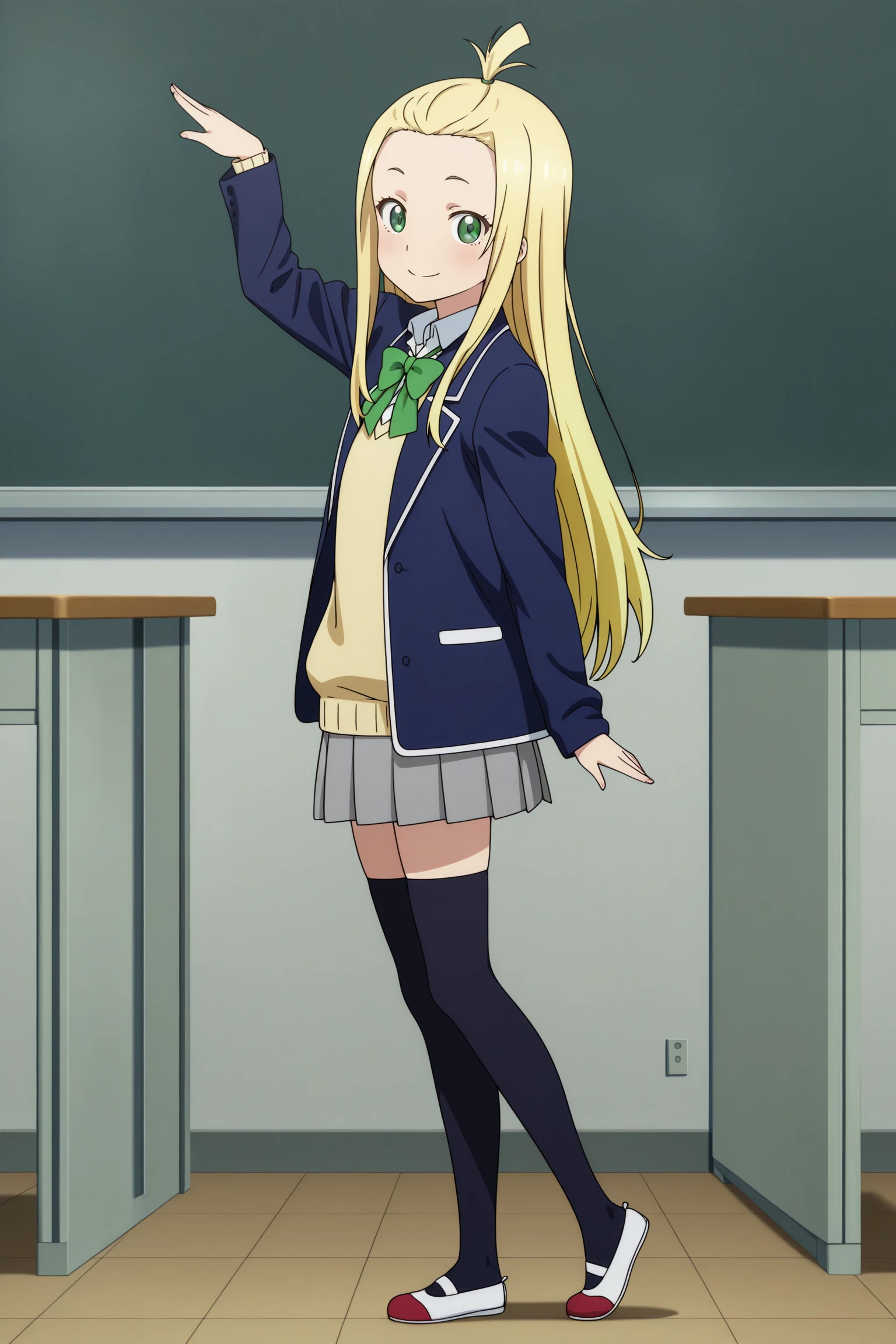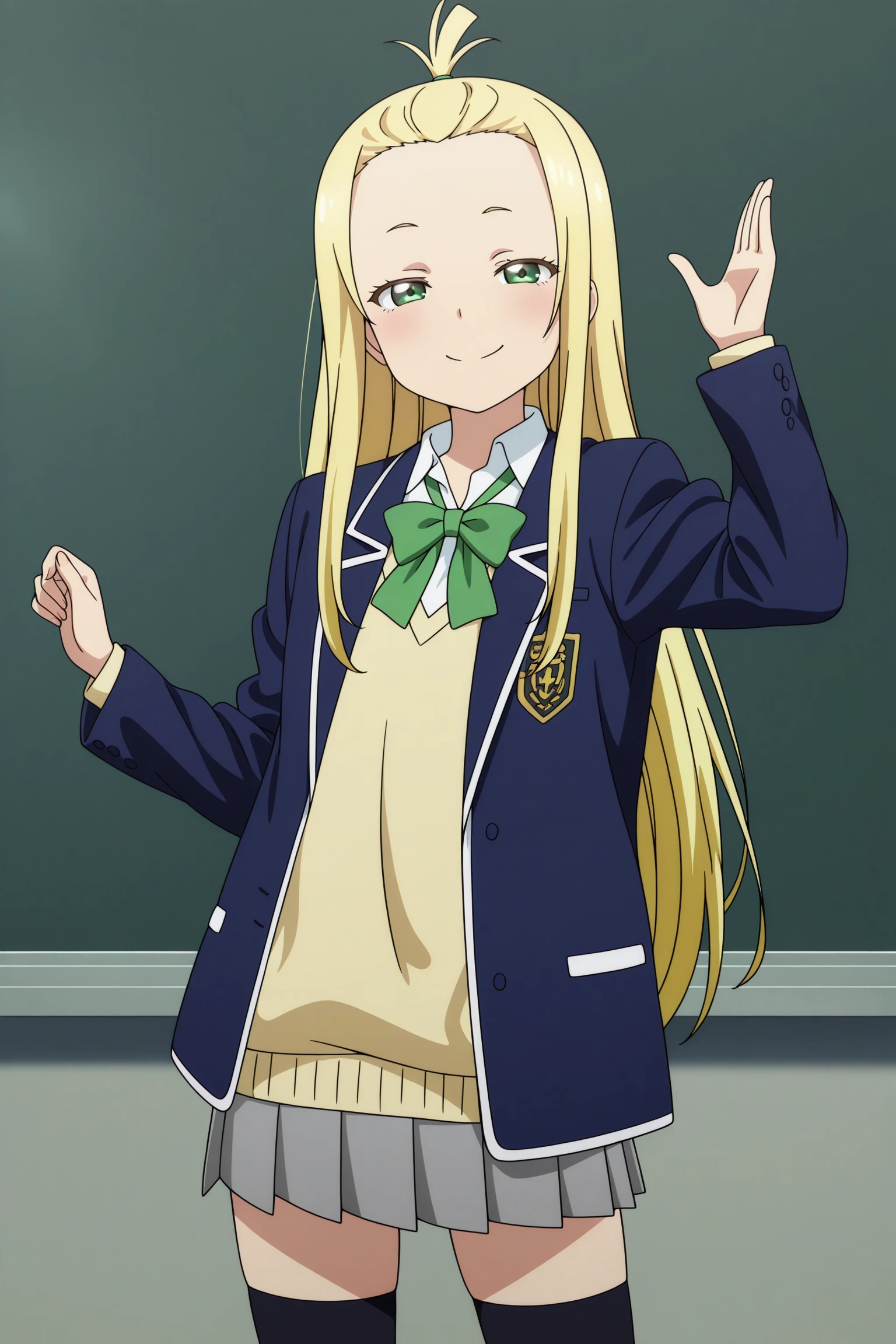 colette, long hair, blonde hair, bangs pinned back, topknot, hair tie, sidelocks, green eyes, long sleeves, blue jacket, open jacket, yellow sweater, white shirt, collared shirt, green bowtie, grey skirt, pleated skirt, black thighhighs, uwabakiSchool Uniform (Summer)
