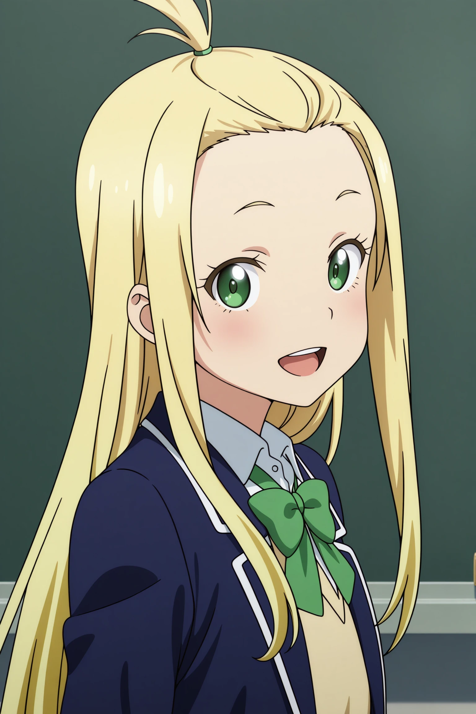 colette, long hair, blonde hair, bangs pinned back, topknot, hair tie, sidelocks, green eyes, long sleeves, blue jacket, open jacket, yellow sweater, white shirt, collared shirt, green bowtie, grey skirt, pleated skirt, black thighhighs, uwabaki