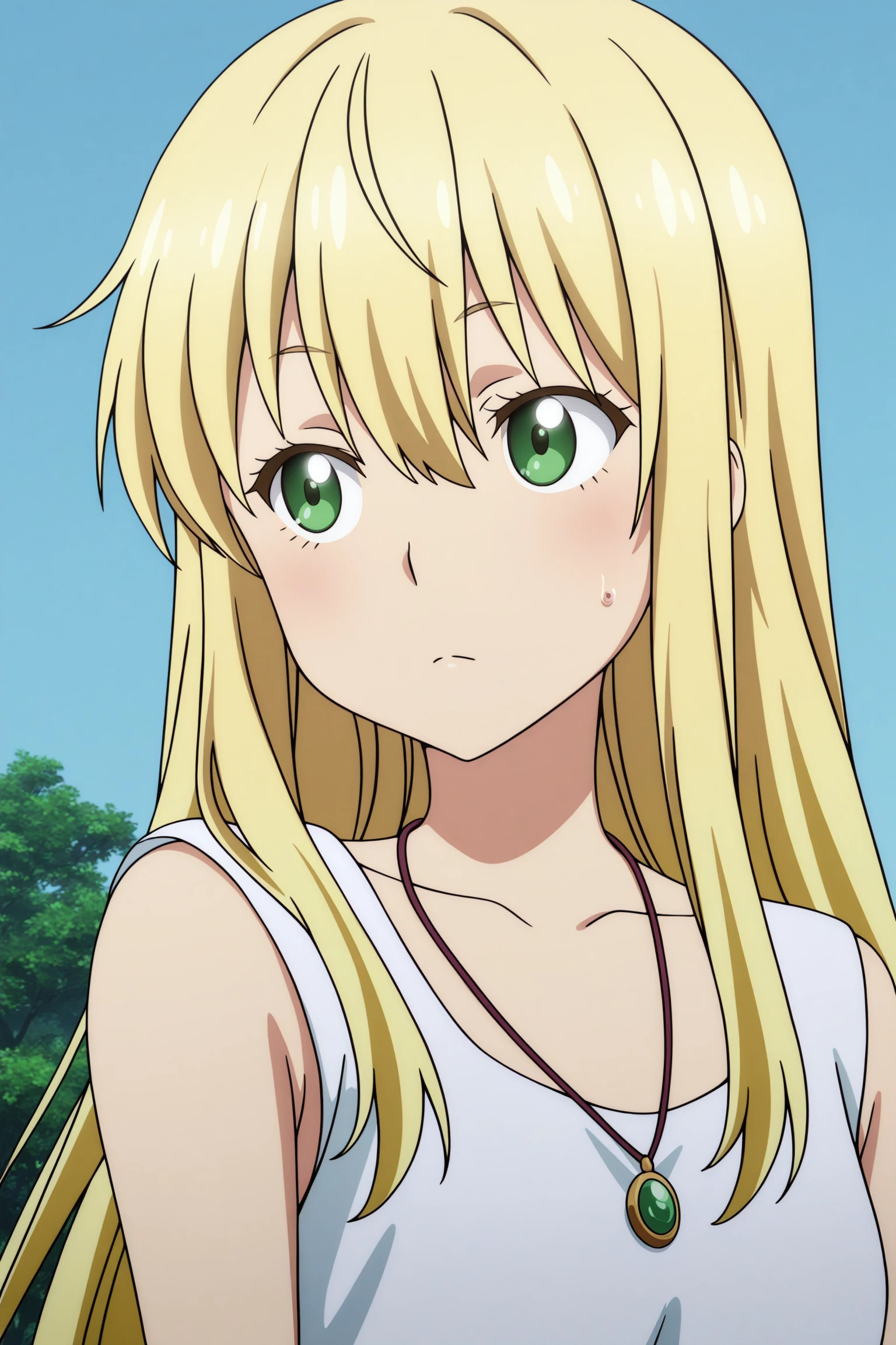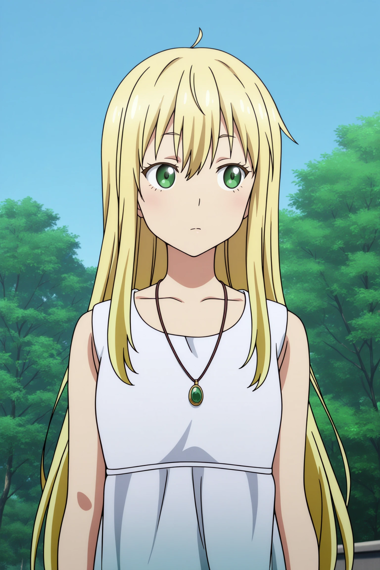 colette, long hair, blonde hair, ahoge, wispy bangs, sidelocks, green eyes, necklace, white dress, sleeveless dress, gradient dress, lace-trimmed dress, ankle strap, white footwear, flatsSchool Swimsuit