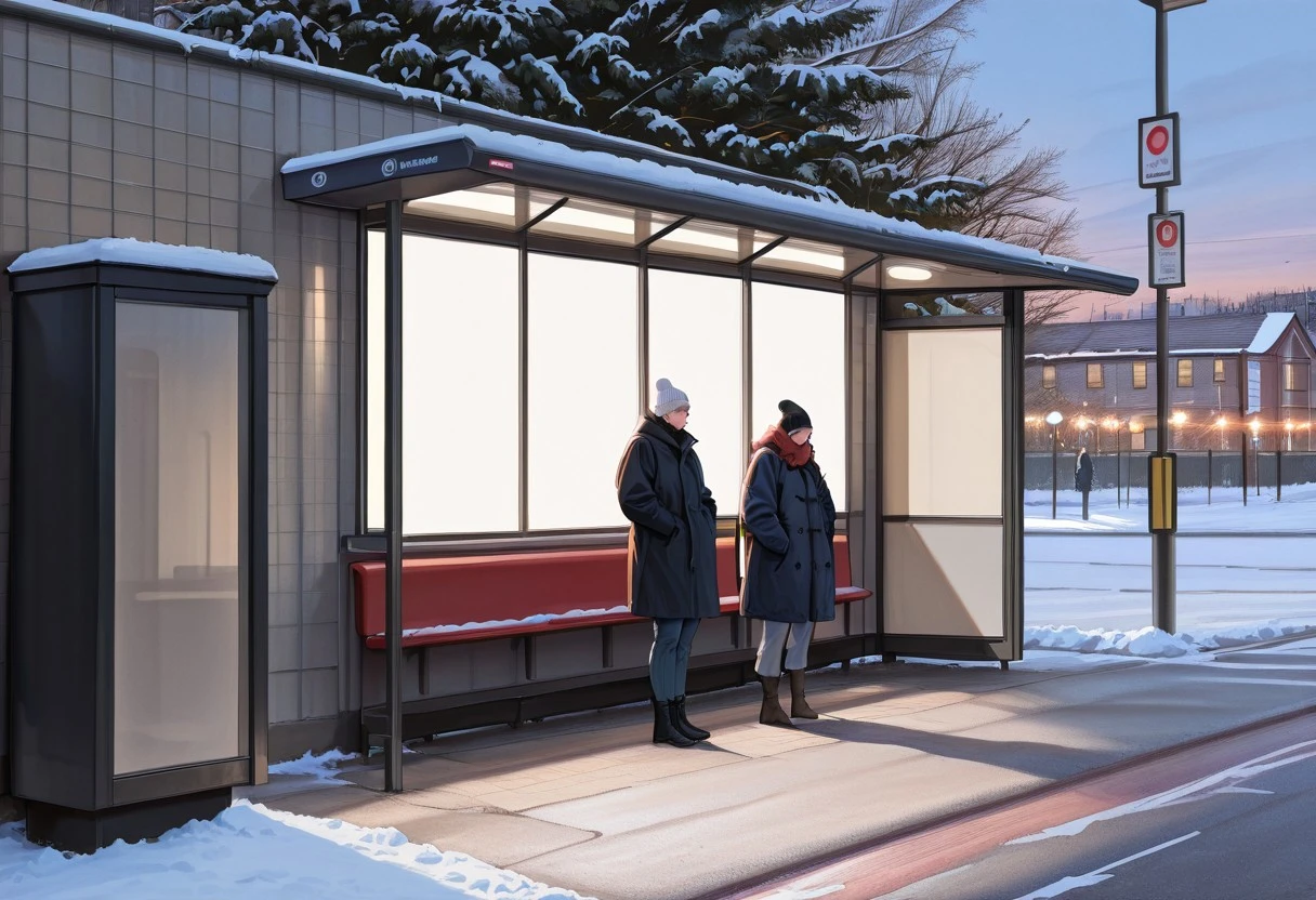 Use "wide shot" to get the whole bush shelter, or "close up" to focus on an individual bus-awaiter.