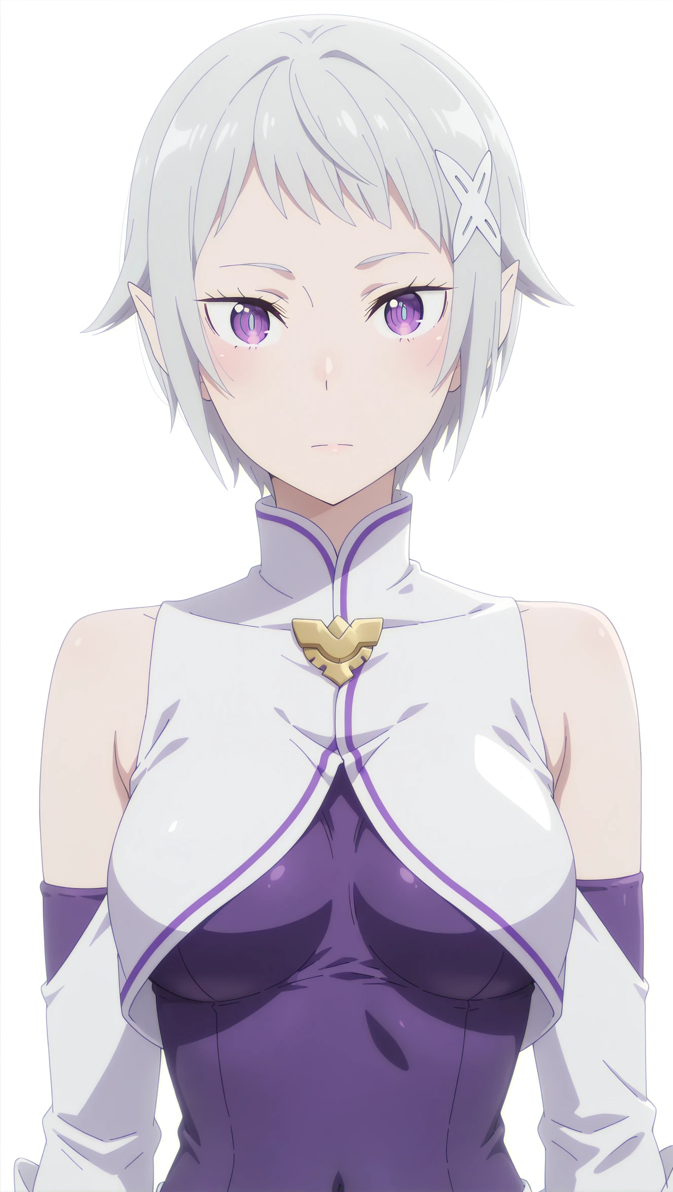fortuna, 1girl, mature female, elf, pointy ears, short hair, silver hair, bangs, purple eyes, medium breasts, x hair ornament, purple bodysuit, detached sleeves, bare shoulders, white jacket, high collar, covered navel, knee boots, white footwear, solo, pose, standing, looking at viewer, white background, simple background, anime coloring, anime screencap, masterpiece, best quality, amazing quality, intricate ditails, uncensoredDescription