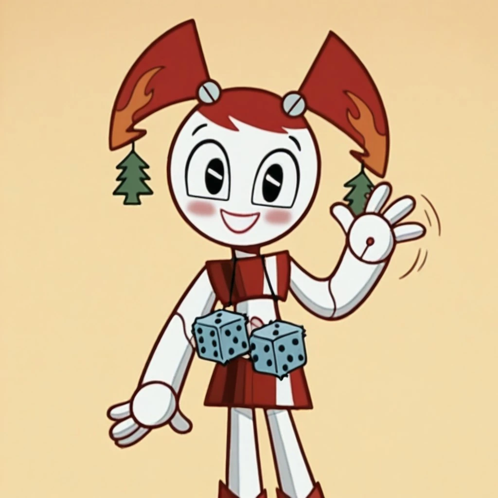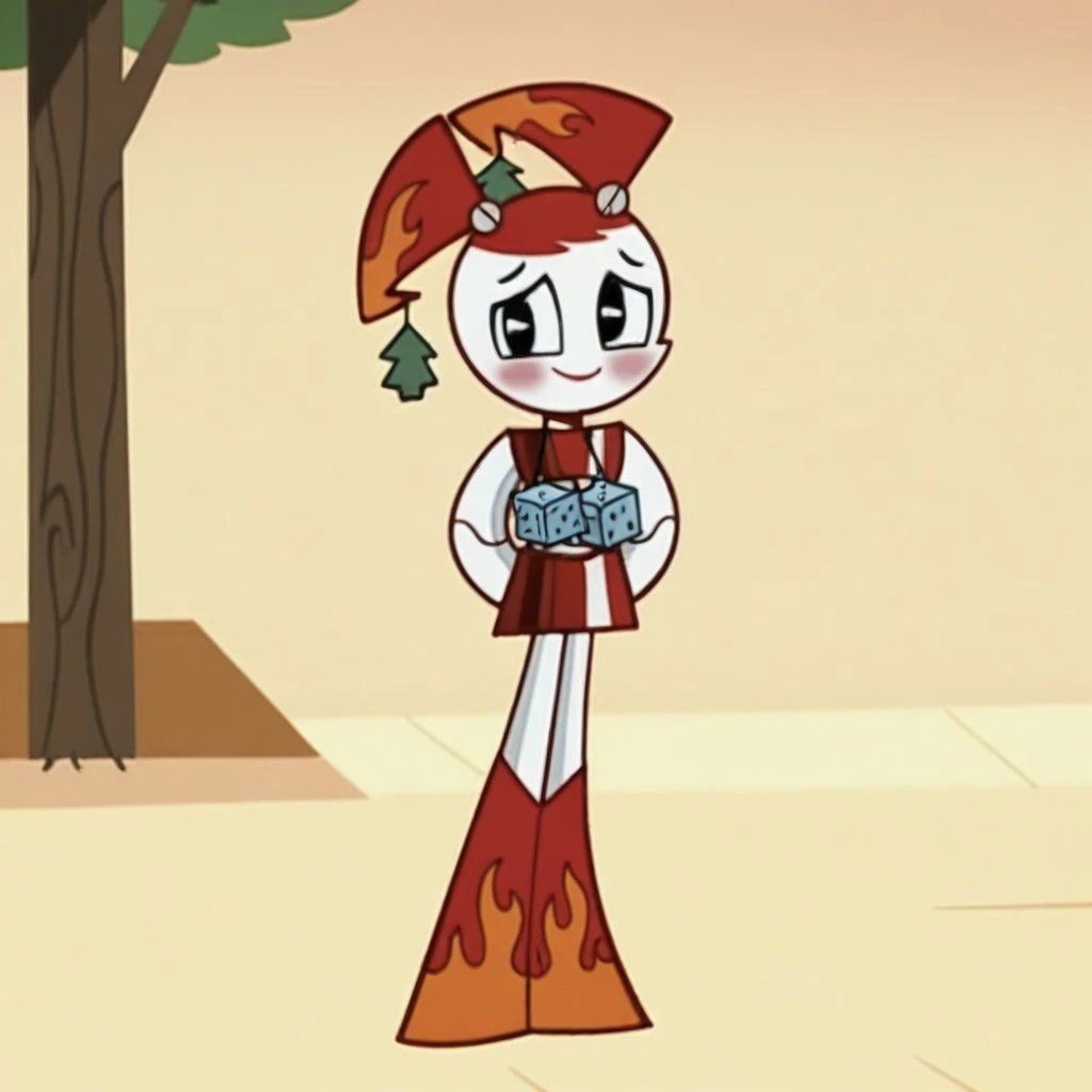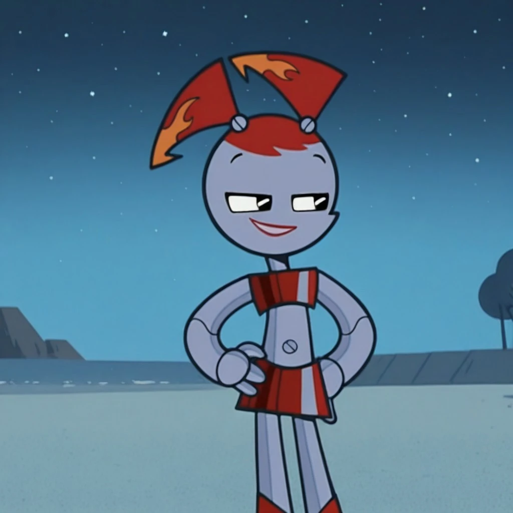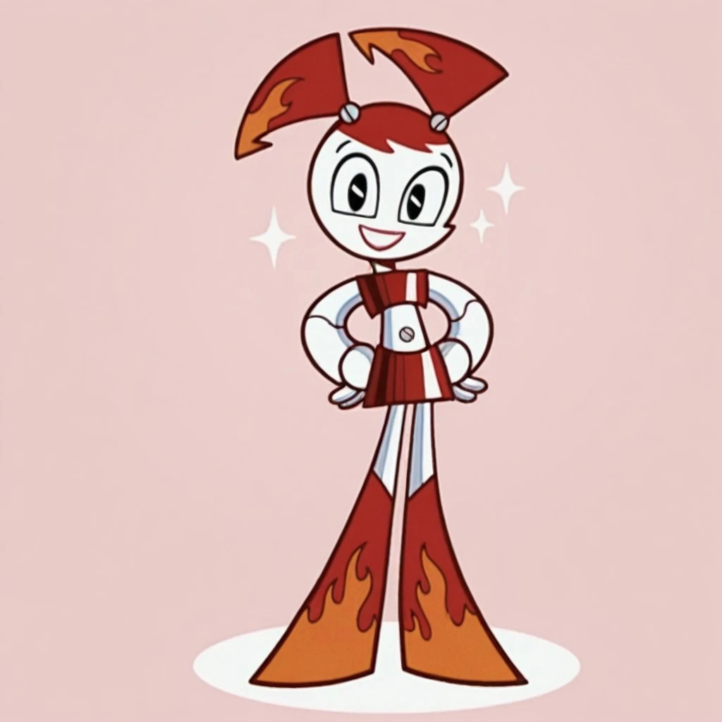 jennyhotrod, twintails, red hair, black eyes, crop top, skirt, knee boots, orange flame accents