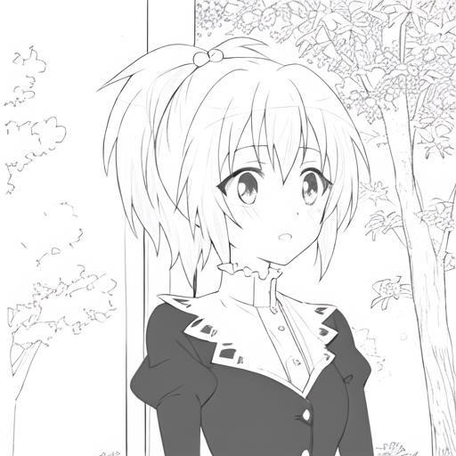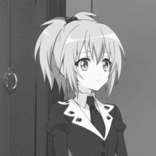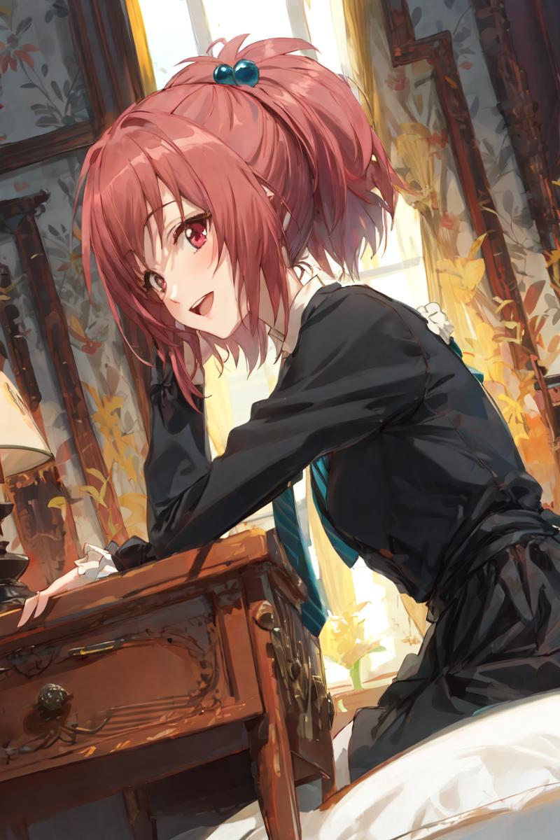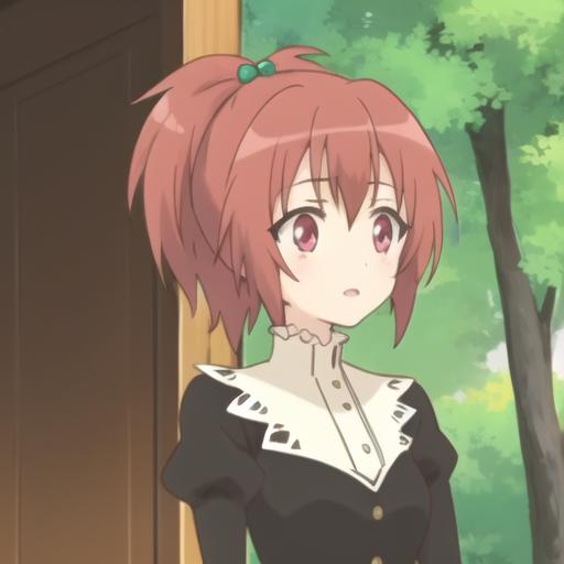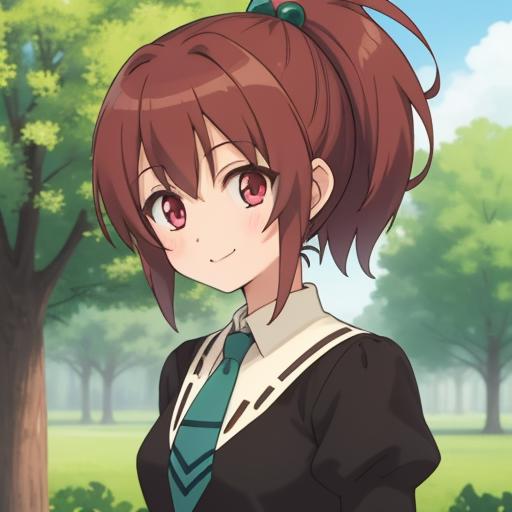 Character: aoi nagisa, brown hair, short hair, ponytail, small breasts, hair bobbles, red eyes