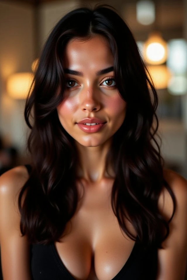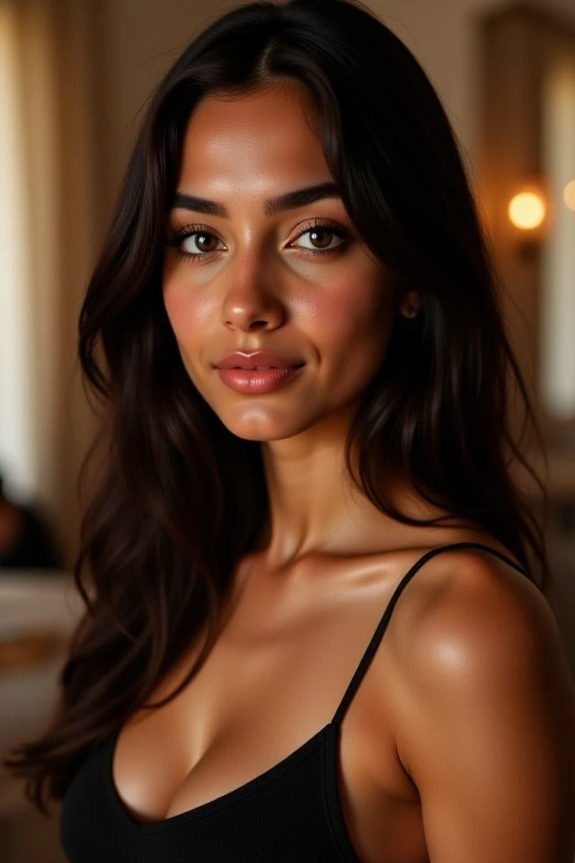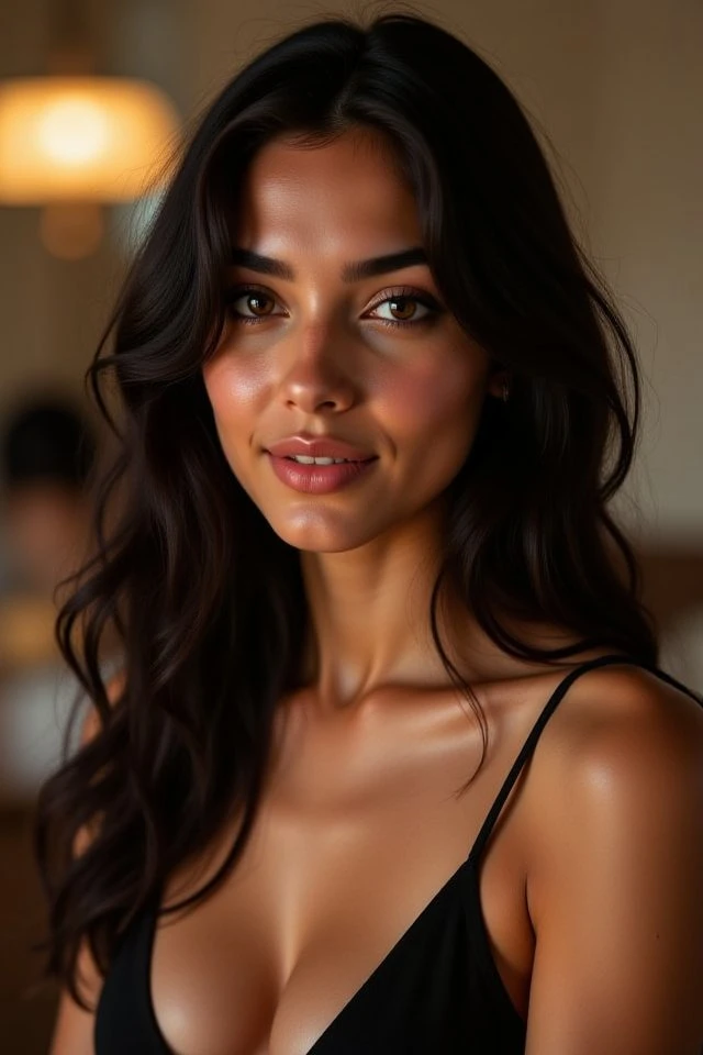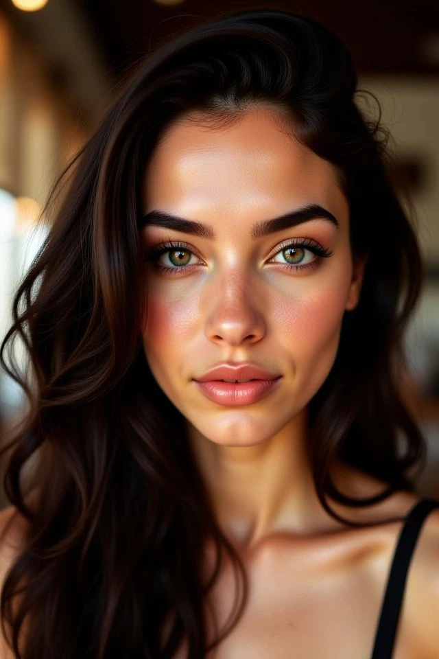 smooth olive skin, long dark wavy hair,
