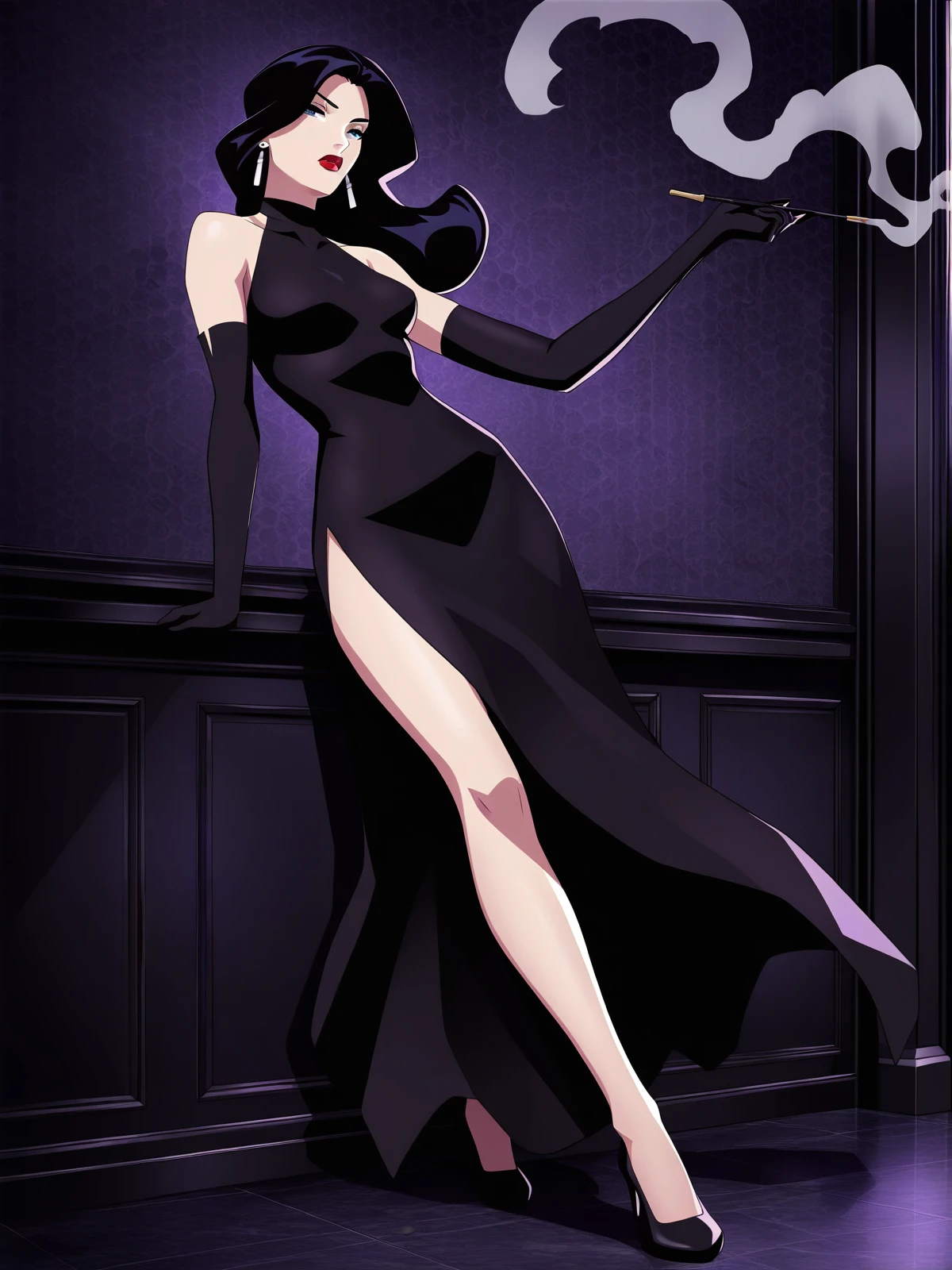 1girl,solo,dress,gloves,high heels,black dress,black hair,elbow gloves,black gloves,long hair,jewelry,makeup,earrings,lipstick,red lips,black footwear,side slit,holding,smoke,smoking pipe,breasts,smoking,brimstone,,