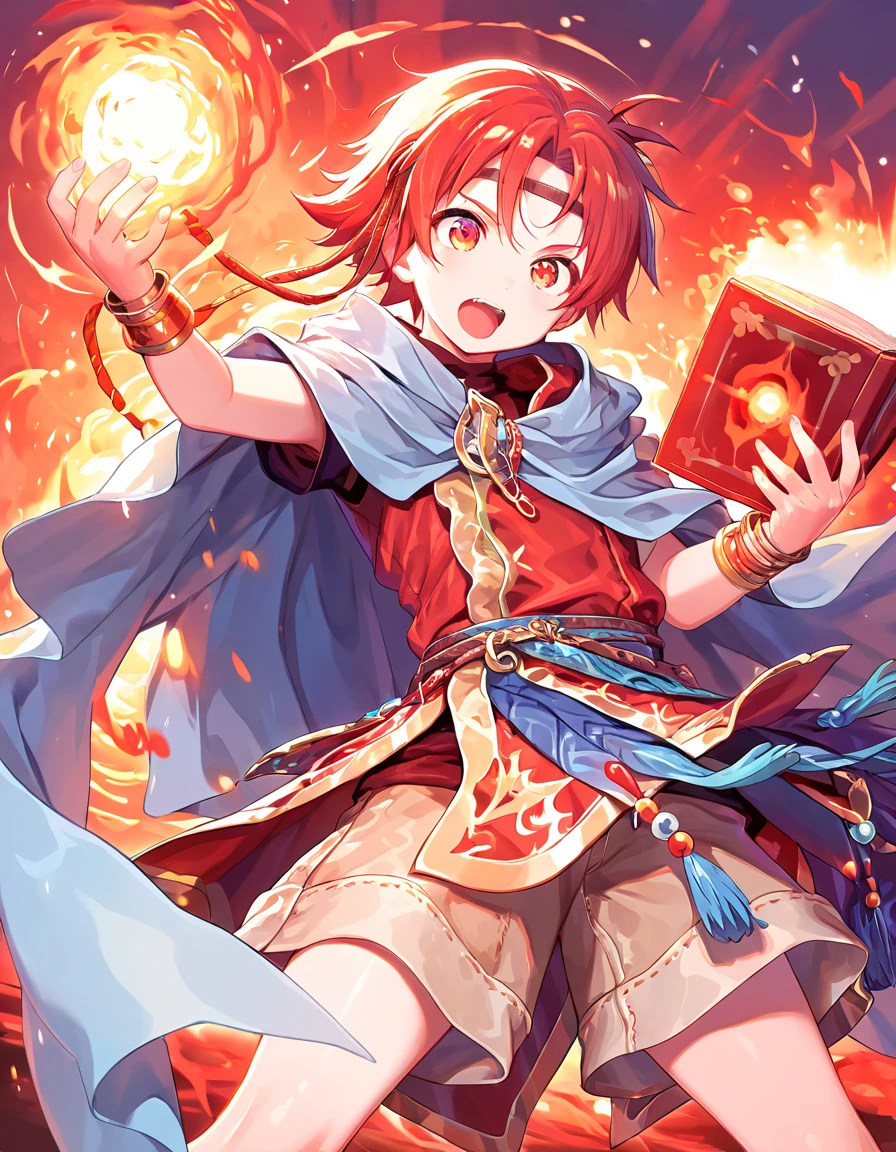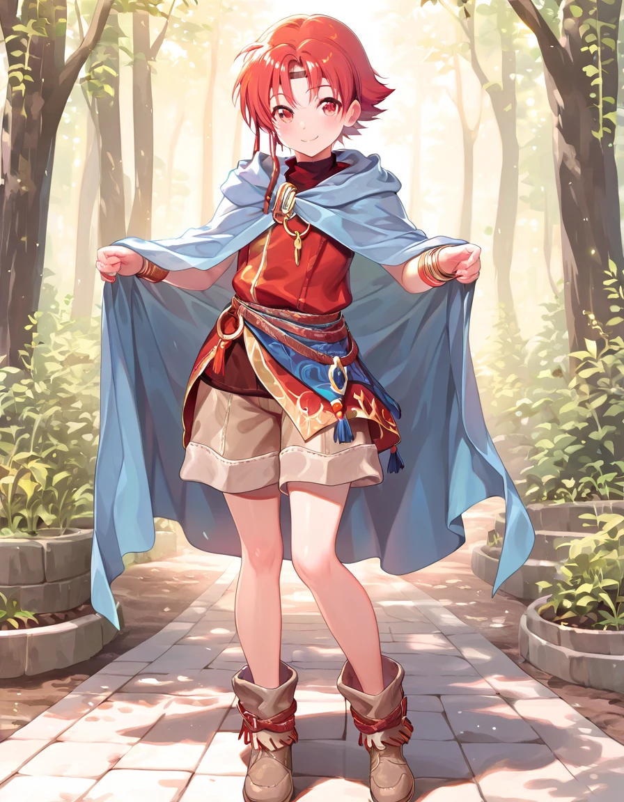 red hair, red eyes, ewan_il,cape,bracelet,jewelry,shorts,boots,