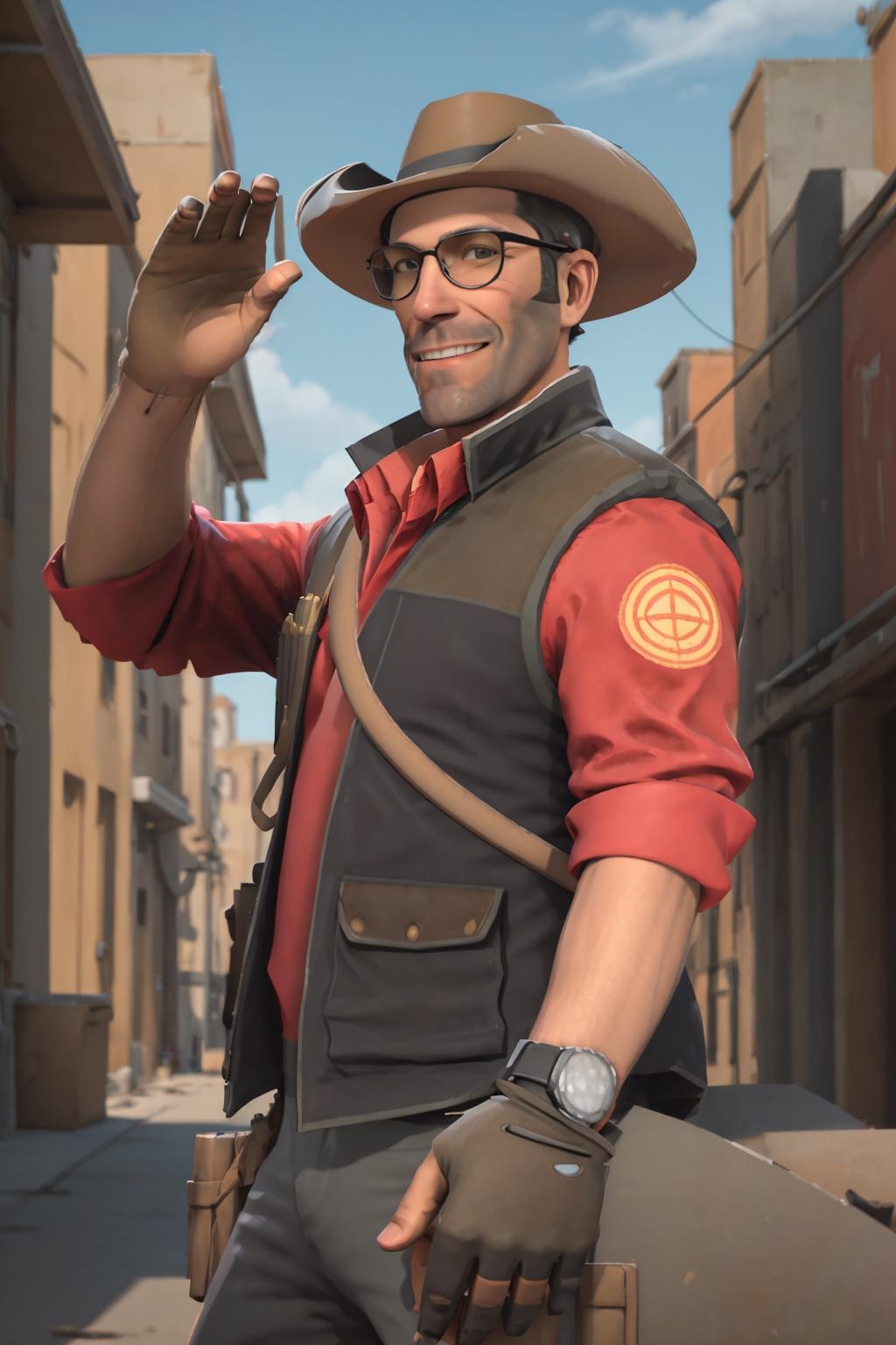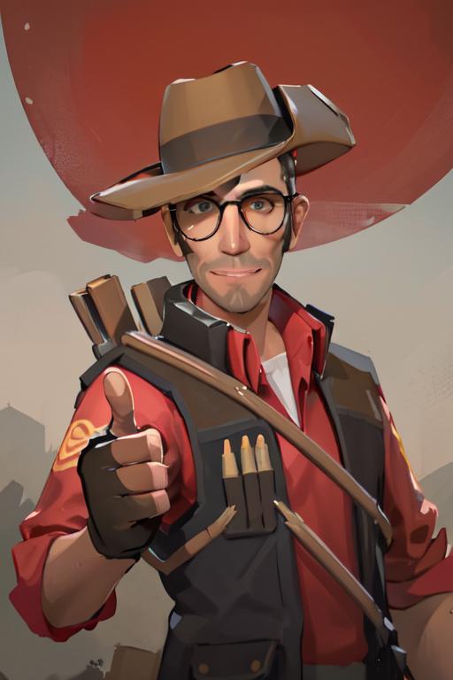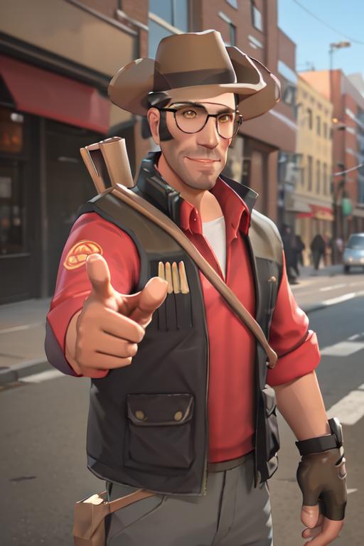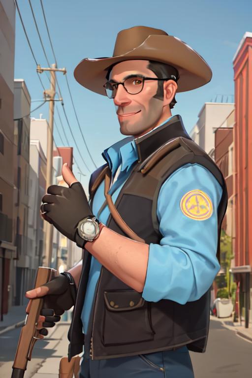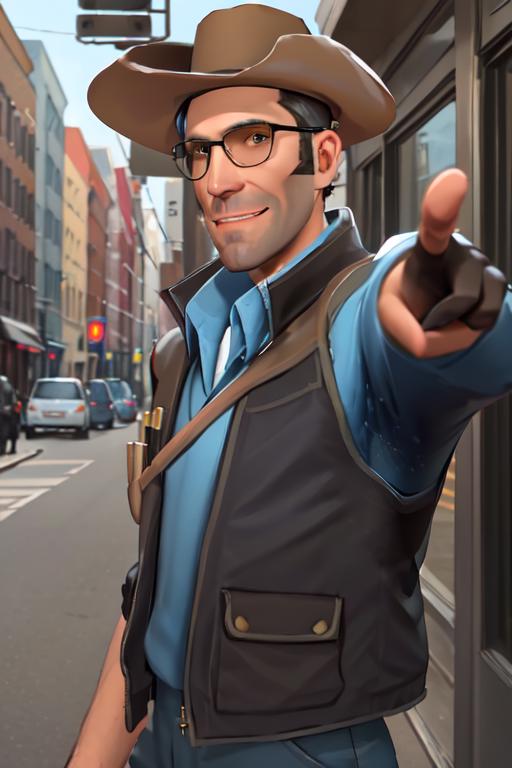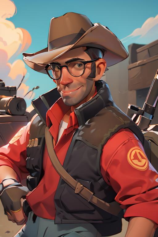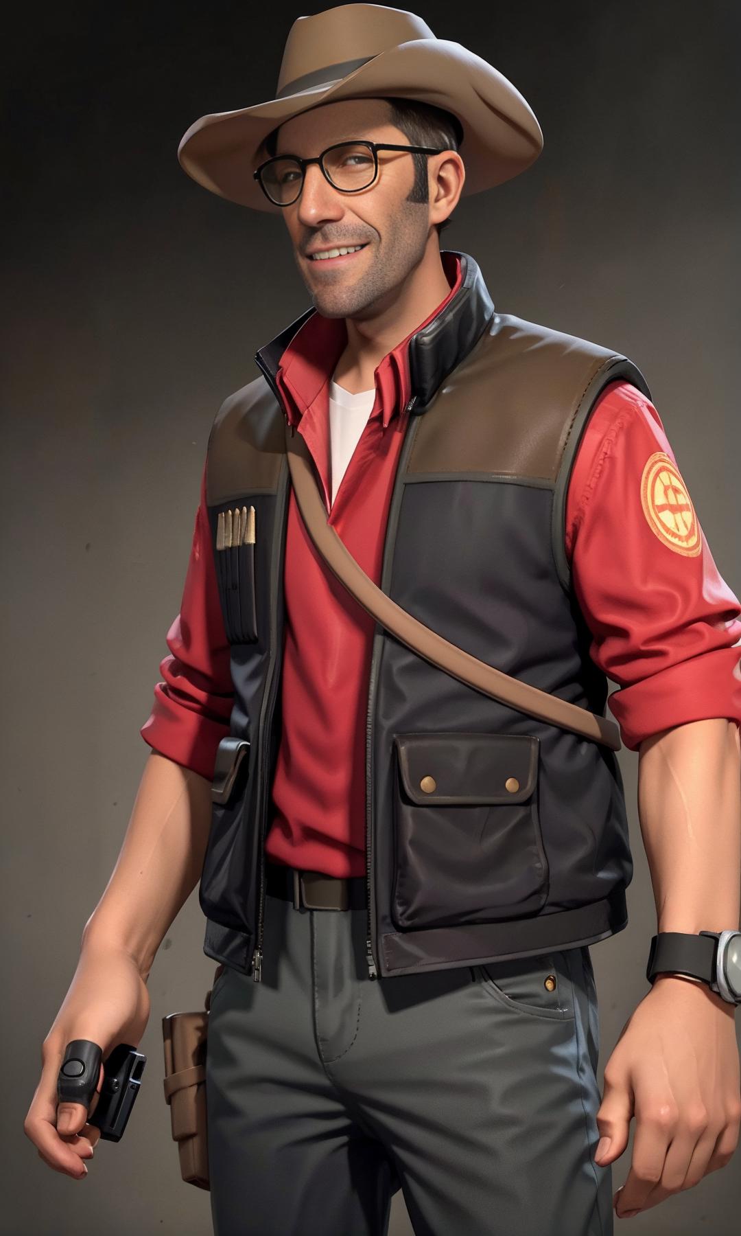 glasses, facial hair, cowboy hat, red/blue shirt, grey/blue pants, single glove,