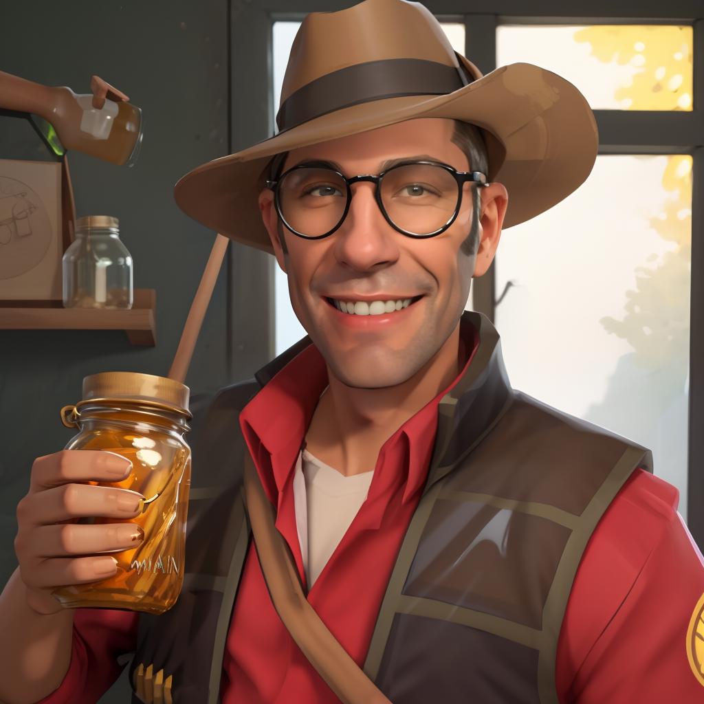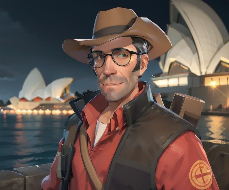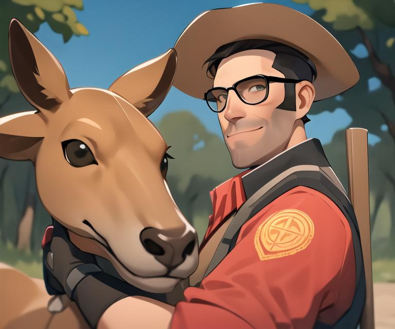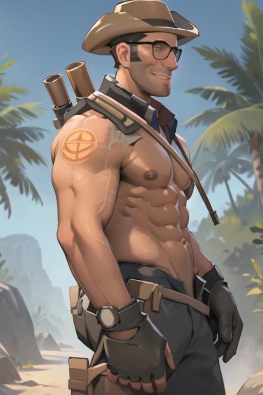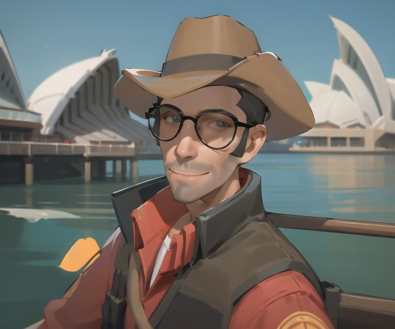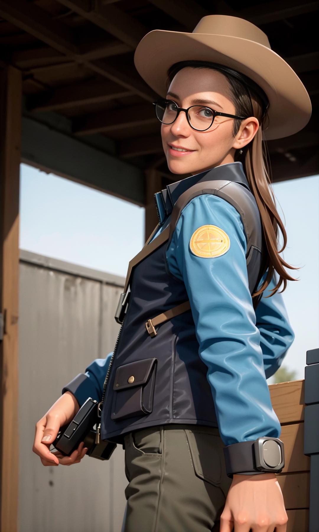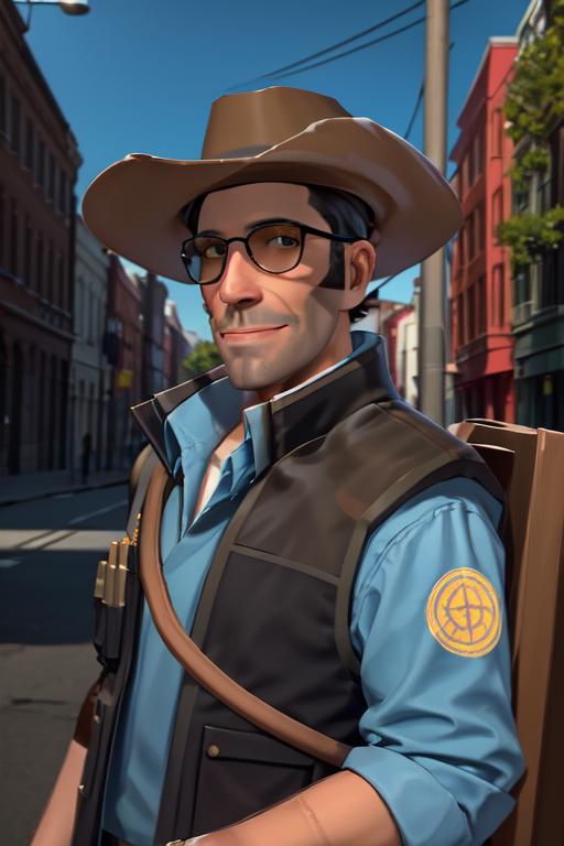 glasses, facial hair, cowboy hat, red/blue shirt, grey/blue pants, single glove,