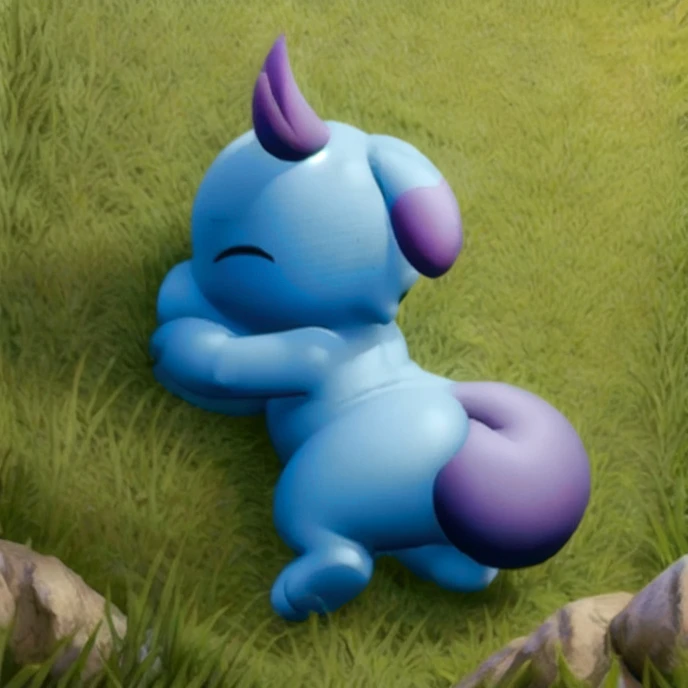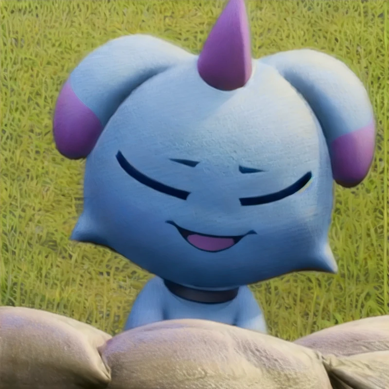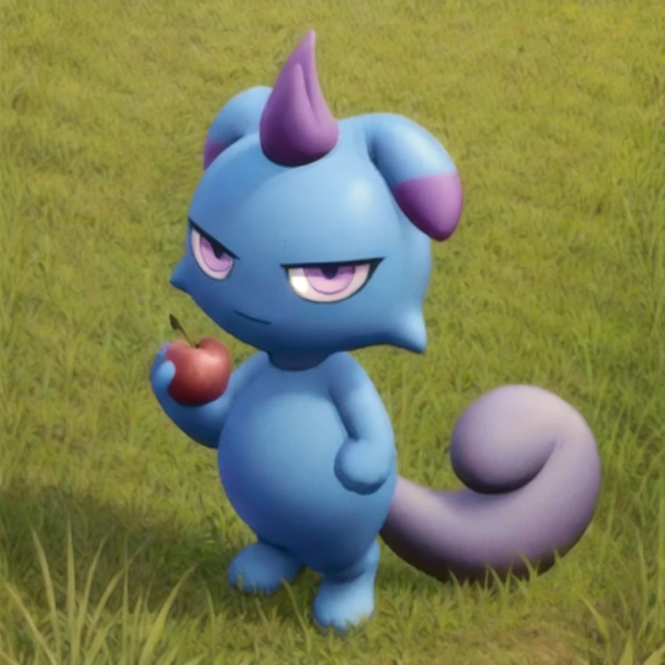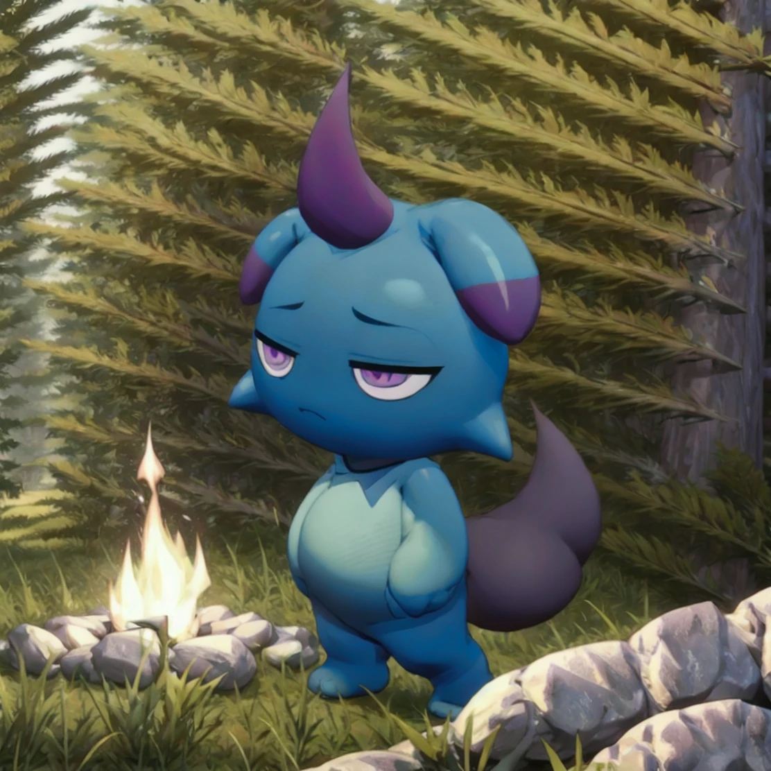 <lora:depresso_2:1> , blue creature, standing, blue fur, purple eyes, dark purple puffy round like round tip tail,
