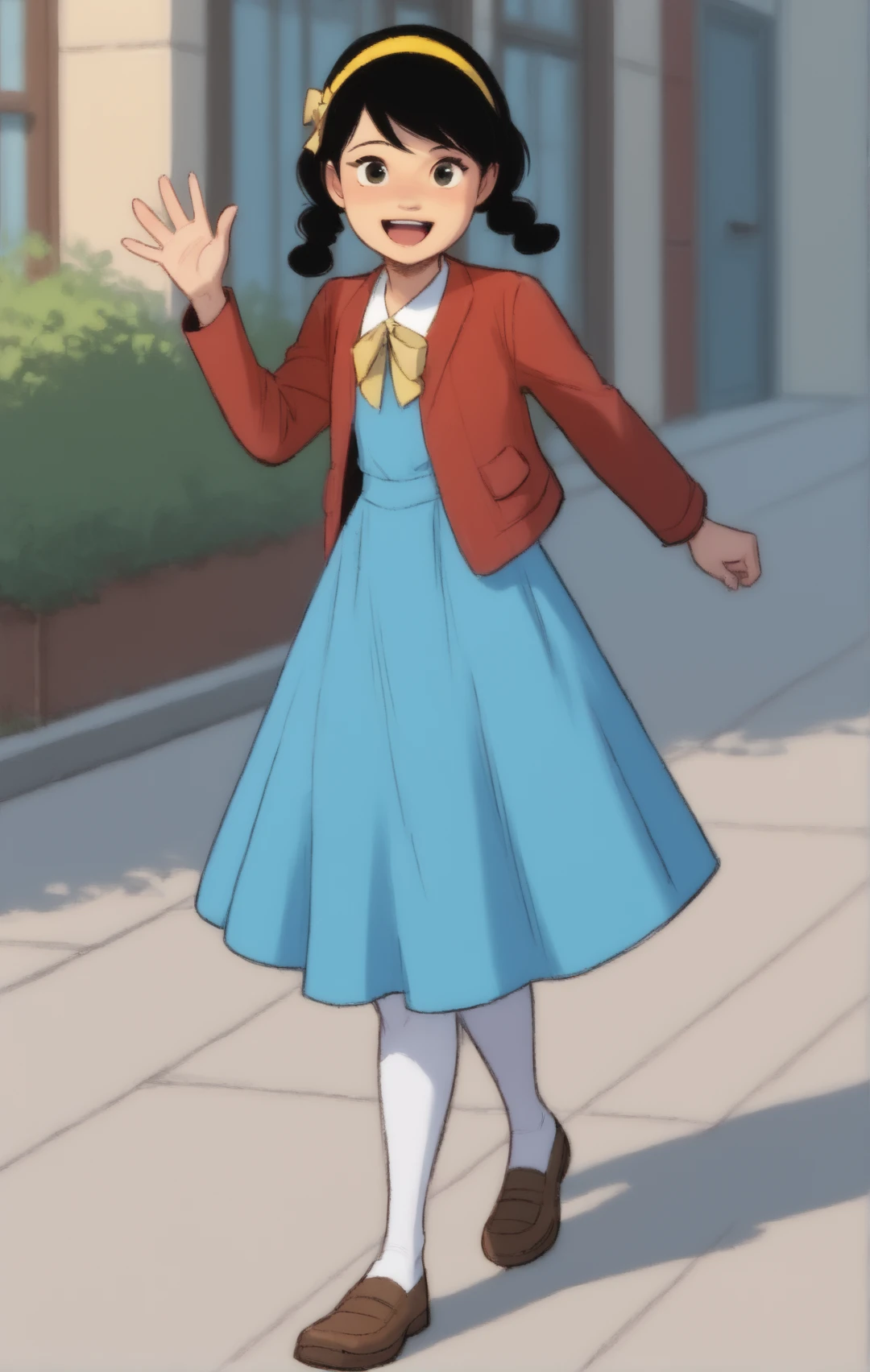 yellow headband, red jacket, blue dress, bow, bowtie, pantyhose