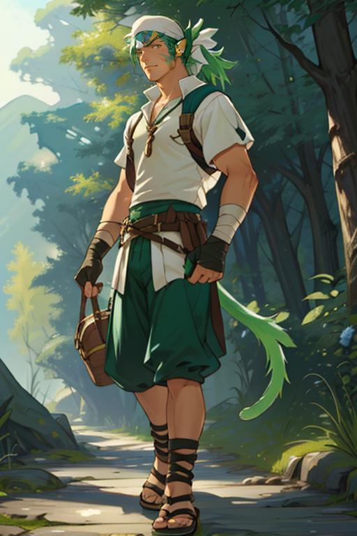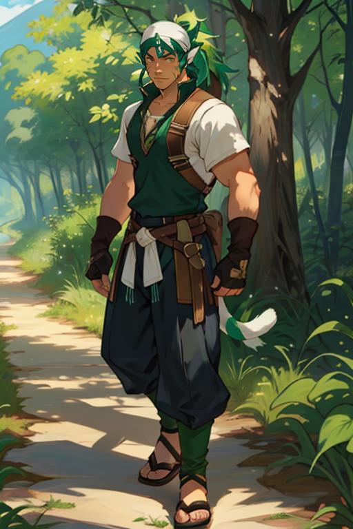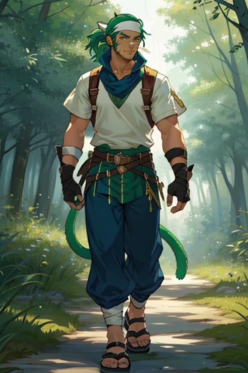 Tags: Muarim_Fire_Emblem, solo, gloves, animal ears, tail, male focus, green hair, fingerless gloves, cat tail, facial mark, bandages, sandals, white bandana.