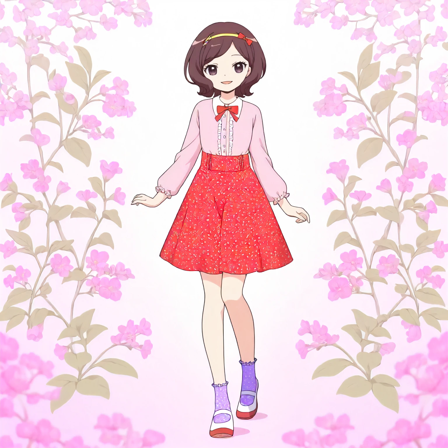 dress_shirt,pink shirt,red bow tie,button frills,long_sleeves, high-waist_skirt,red skirt,polka dots skirt,