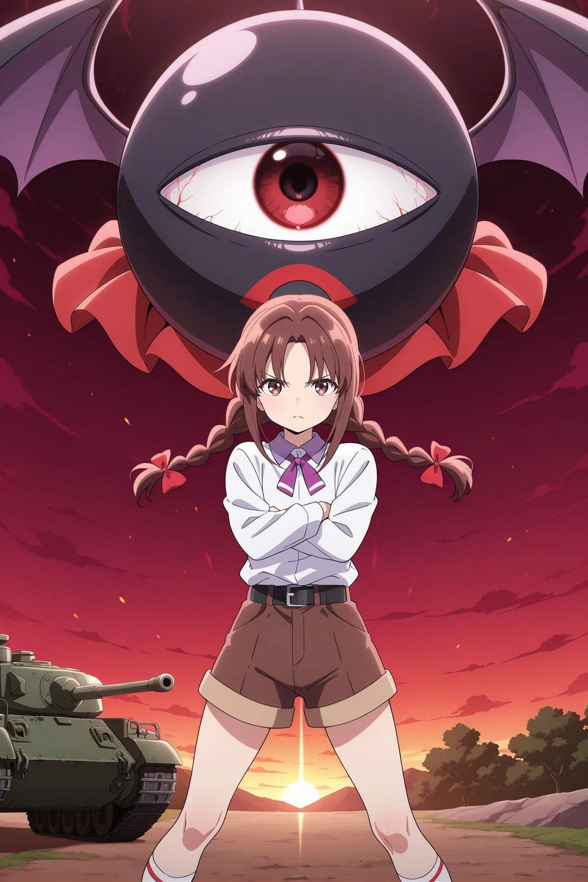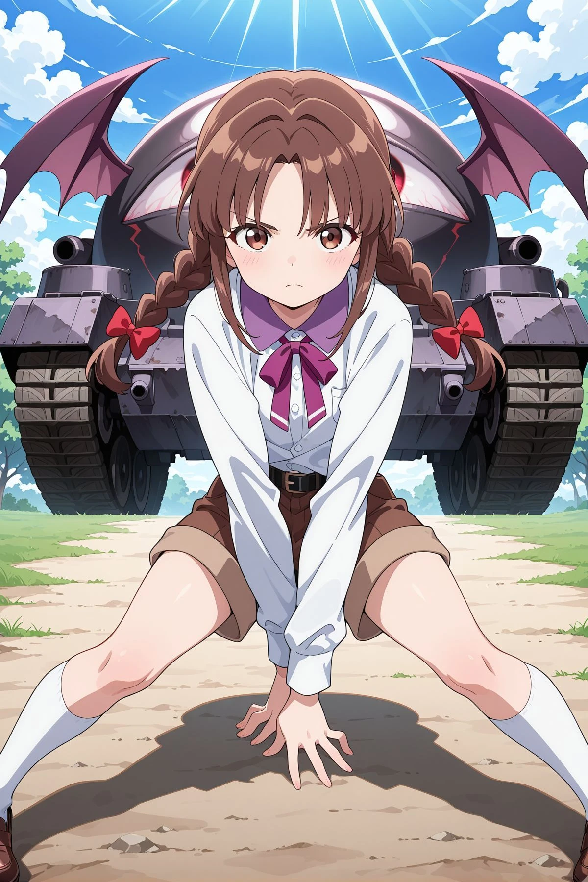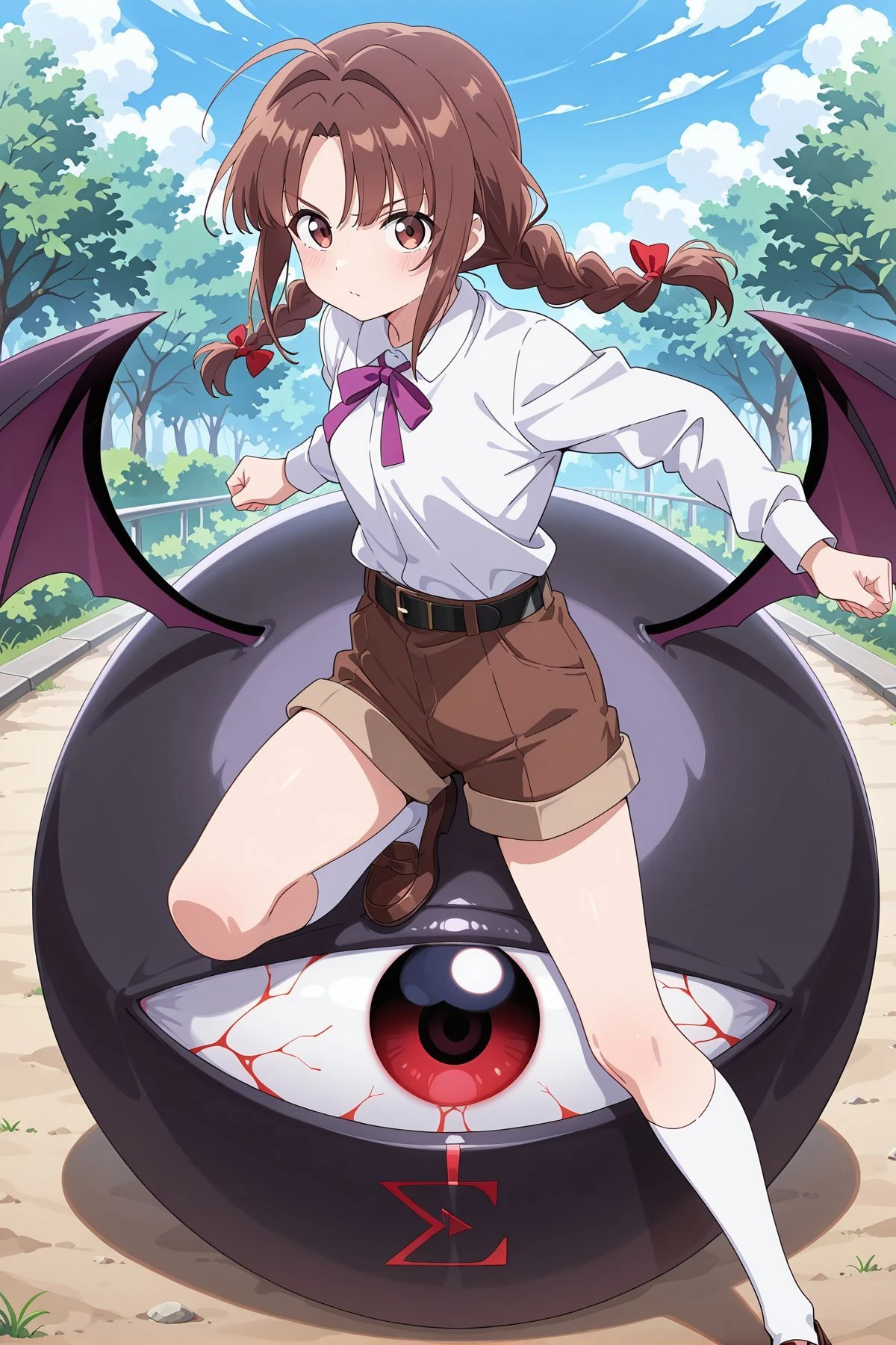 rika, 1girl, solo, brown eyes, brown hair, long hair, twin braids, hair intakes,hair bow, red bow, purple neck ribbon, collared shirt, white shirt, long sleeves, black belt, brown shorts, white socks, kneehighs, brown shoes, loafers,Optional :