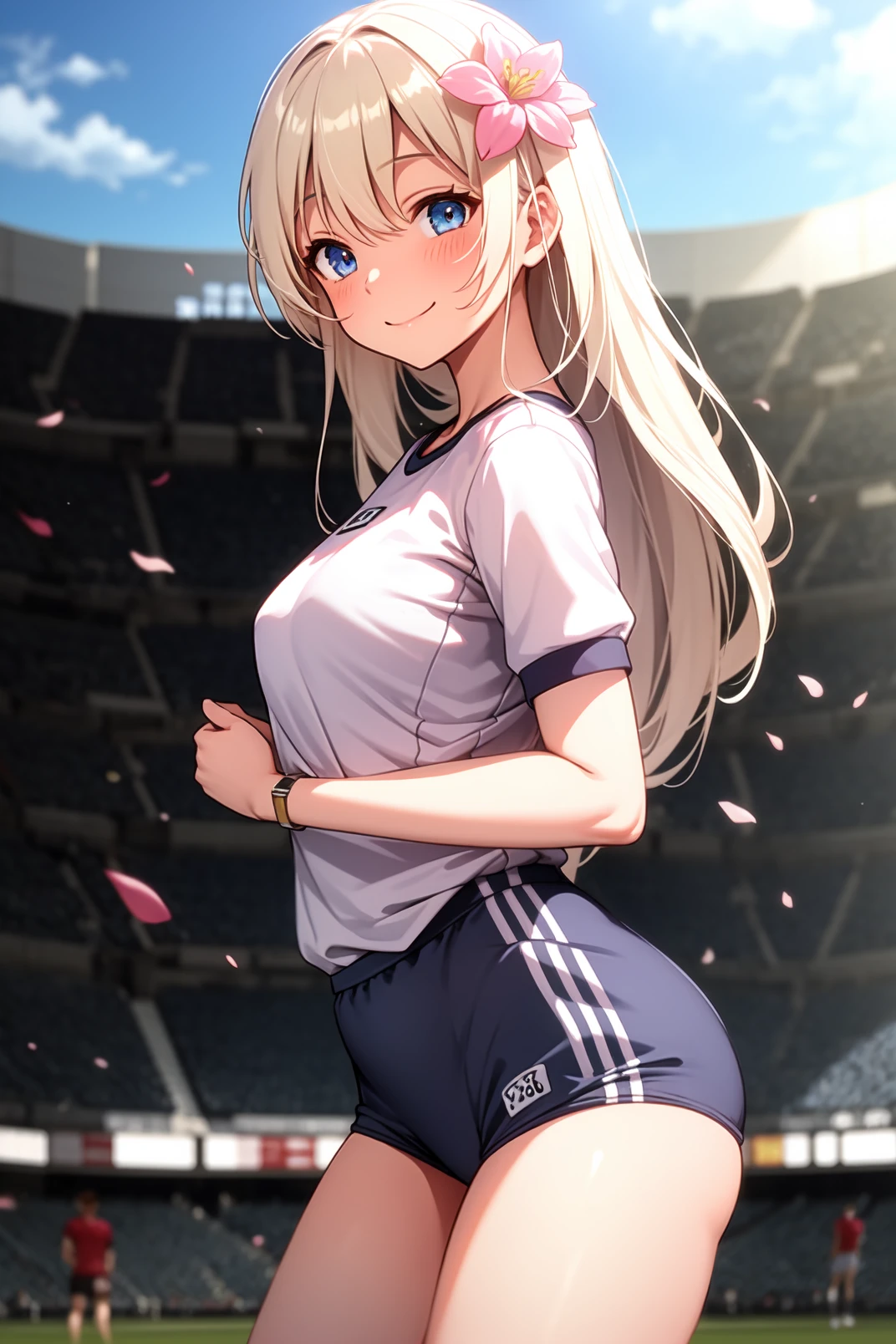 appearance: ro-500, blue eyes, blonde hair, long hair, pink flower, hair flower ornament