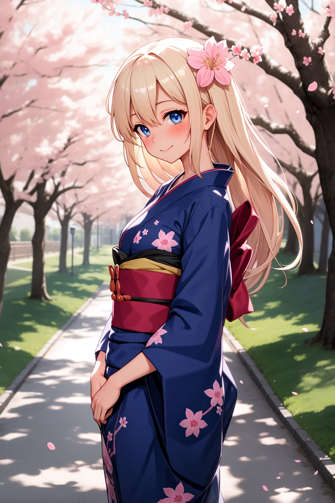 ro-500, blue eyes, blonde hair, long hair, pink flower, hair flower ornament