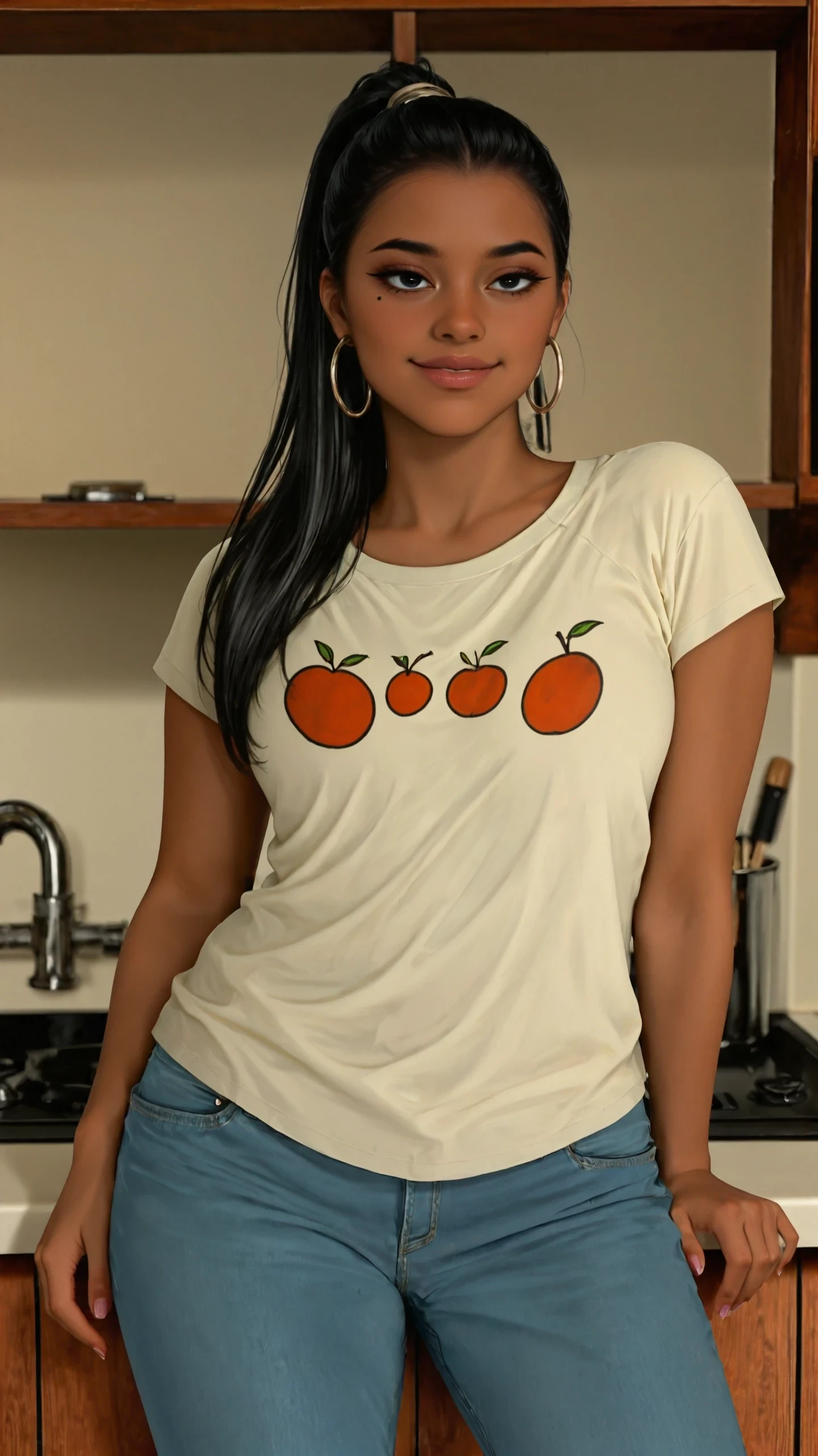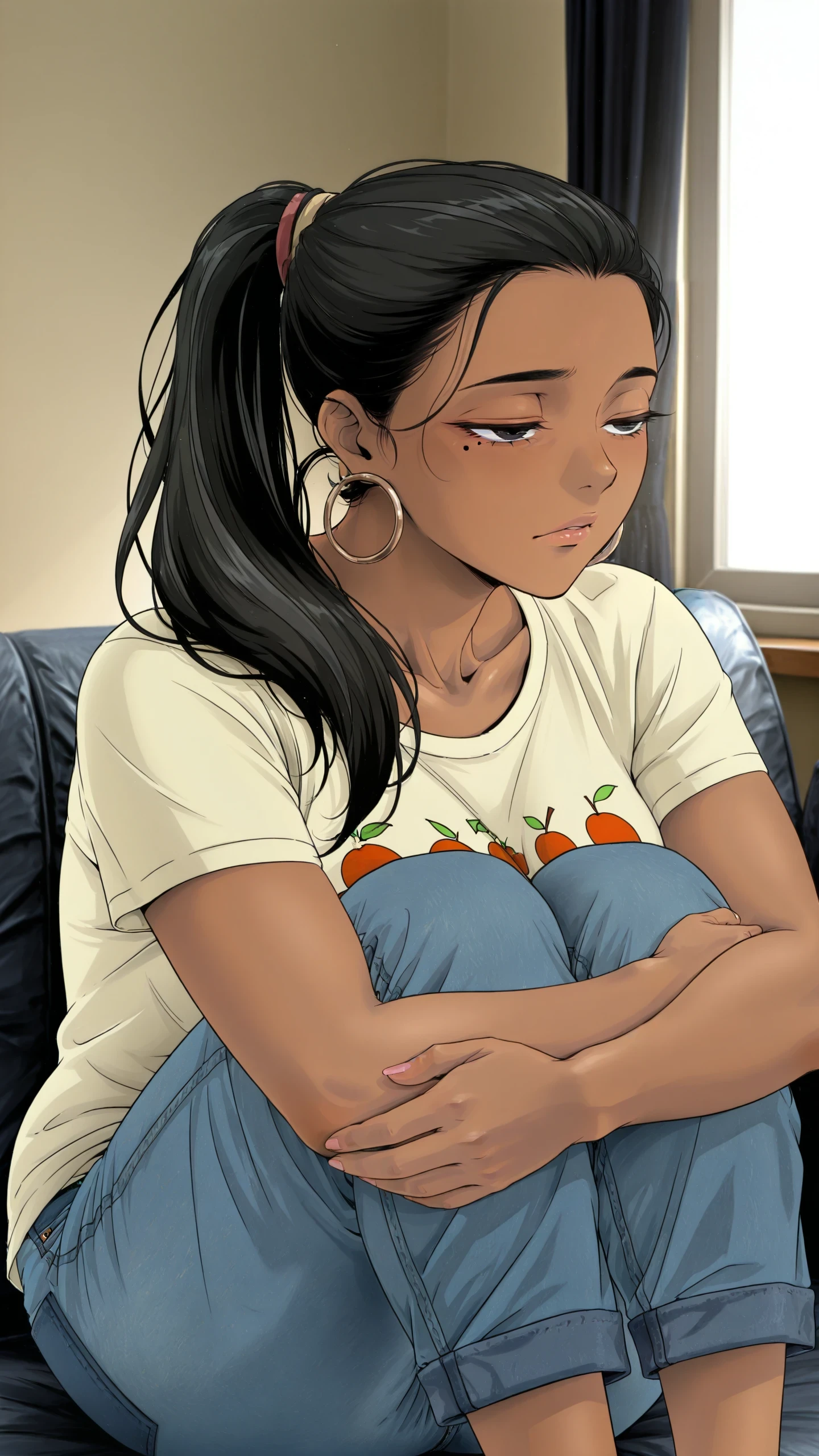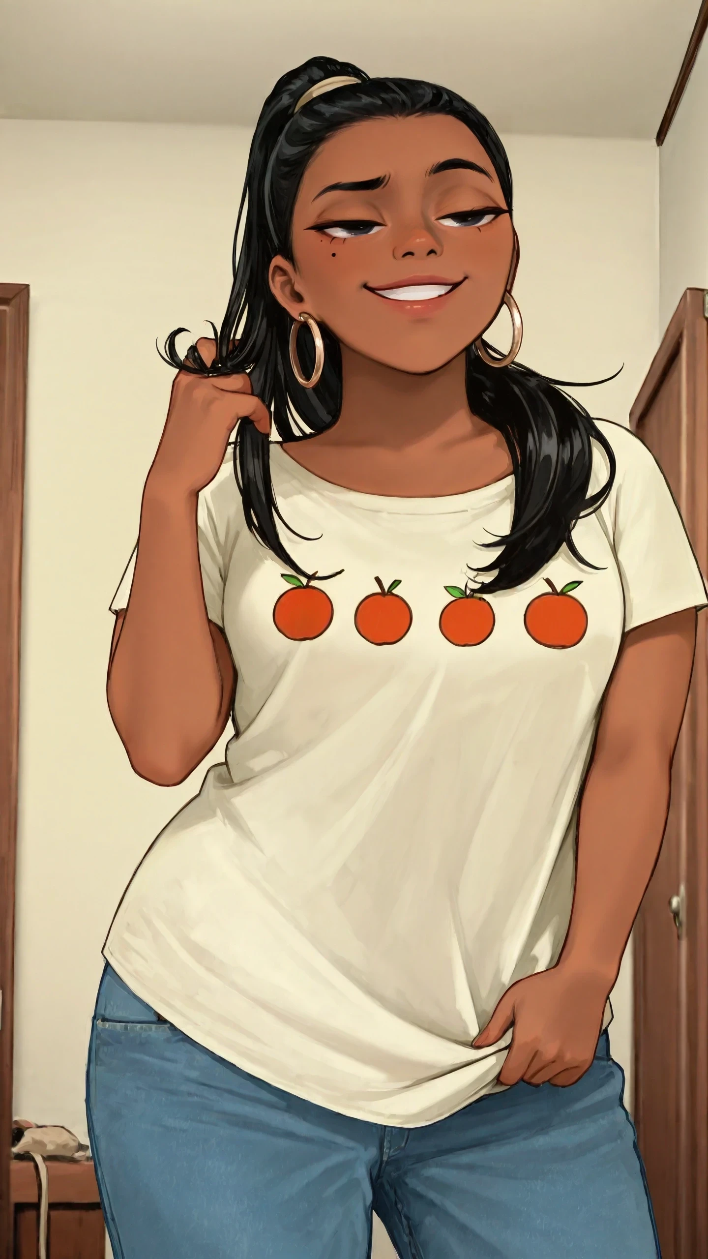 L3sh4wn4, 1girl, dark-skinned female, mole under eye, black eyes, black hair, ponytail, long hair, hoop earrings, jewelry, print shirt, denim, pants