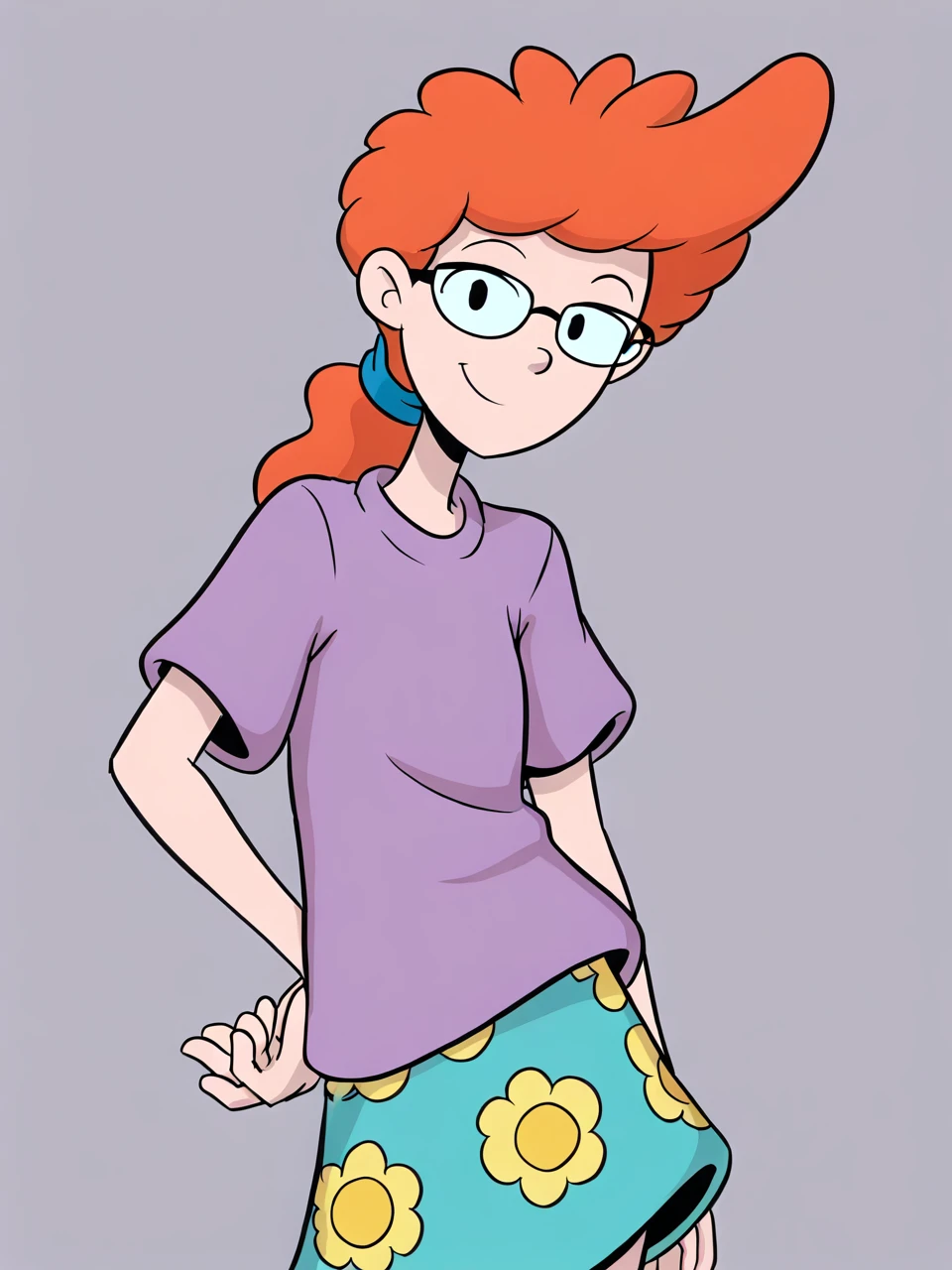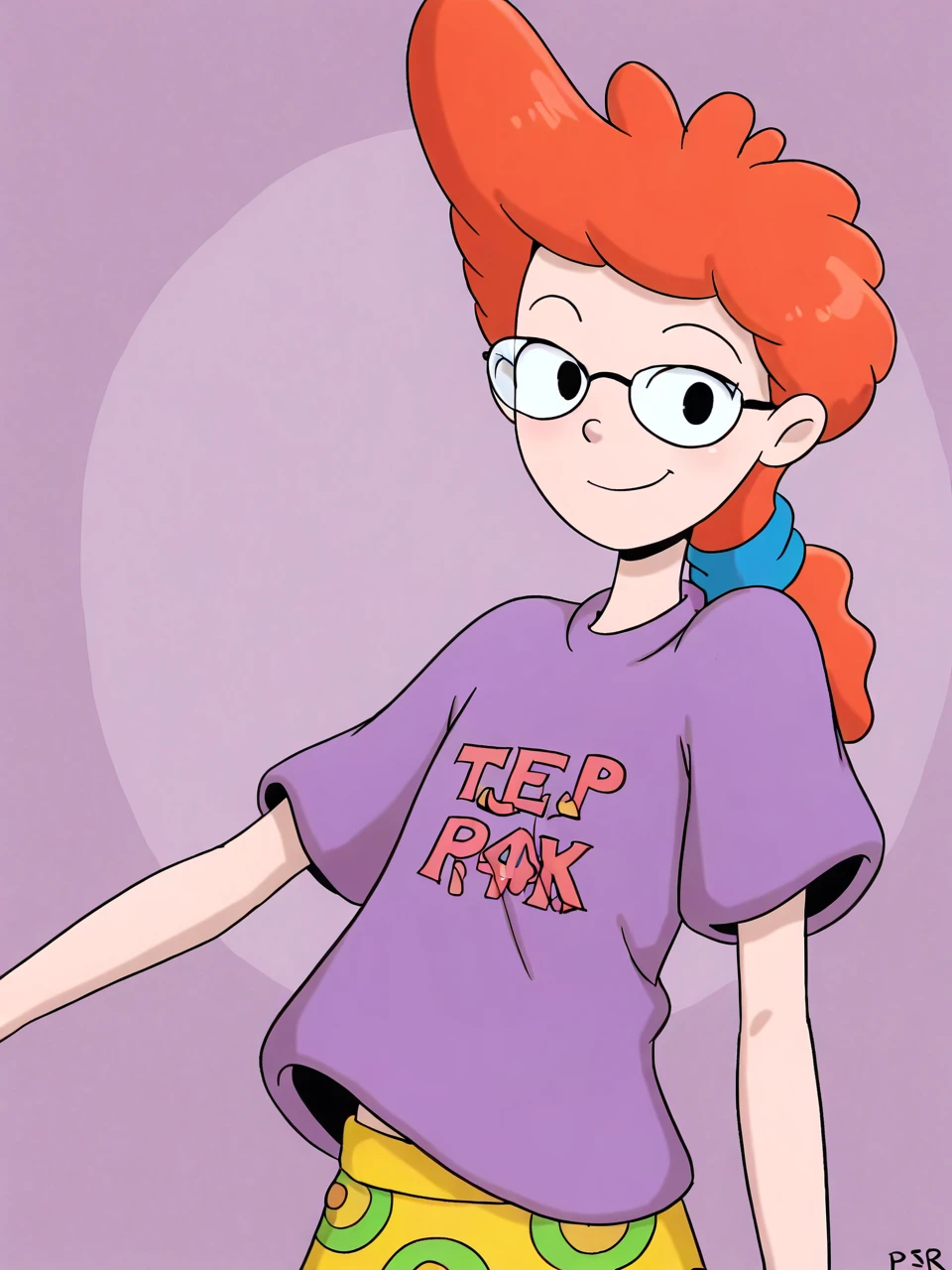 P3pp3r4nn, 1girl, solo, short hair, orange hair, short sleeves, glasses, t-shirt, purple shirt,