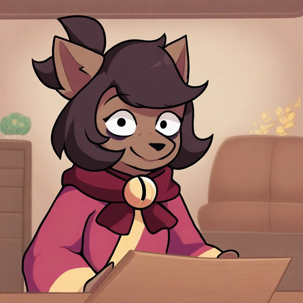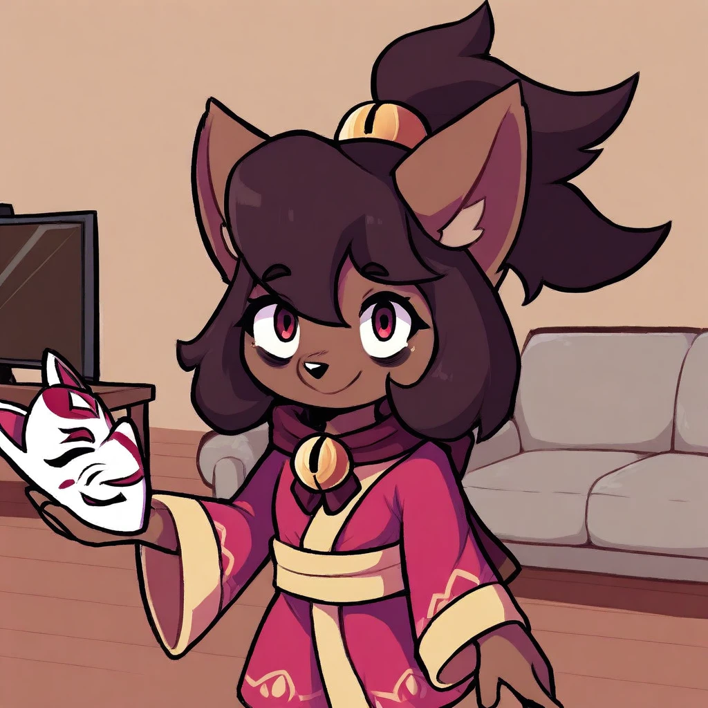 Kanako-uty, 1girl, solo, furry female, fox, brown fur, animal nose, brown hair, short hair, tied up hair, red ribbon, gold bell, dark reddish scarf, red kimono with gold trimmings, gold sash, grey pants, brown boots,