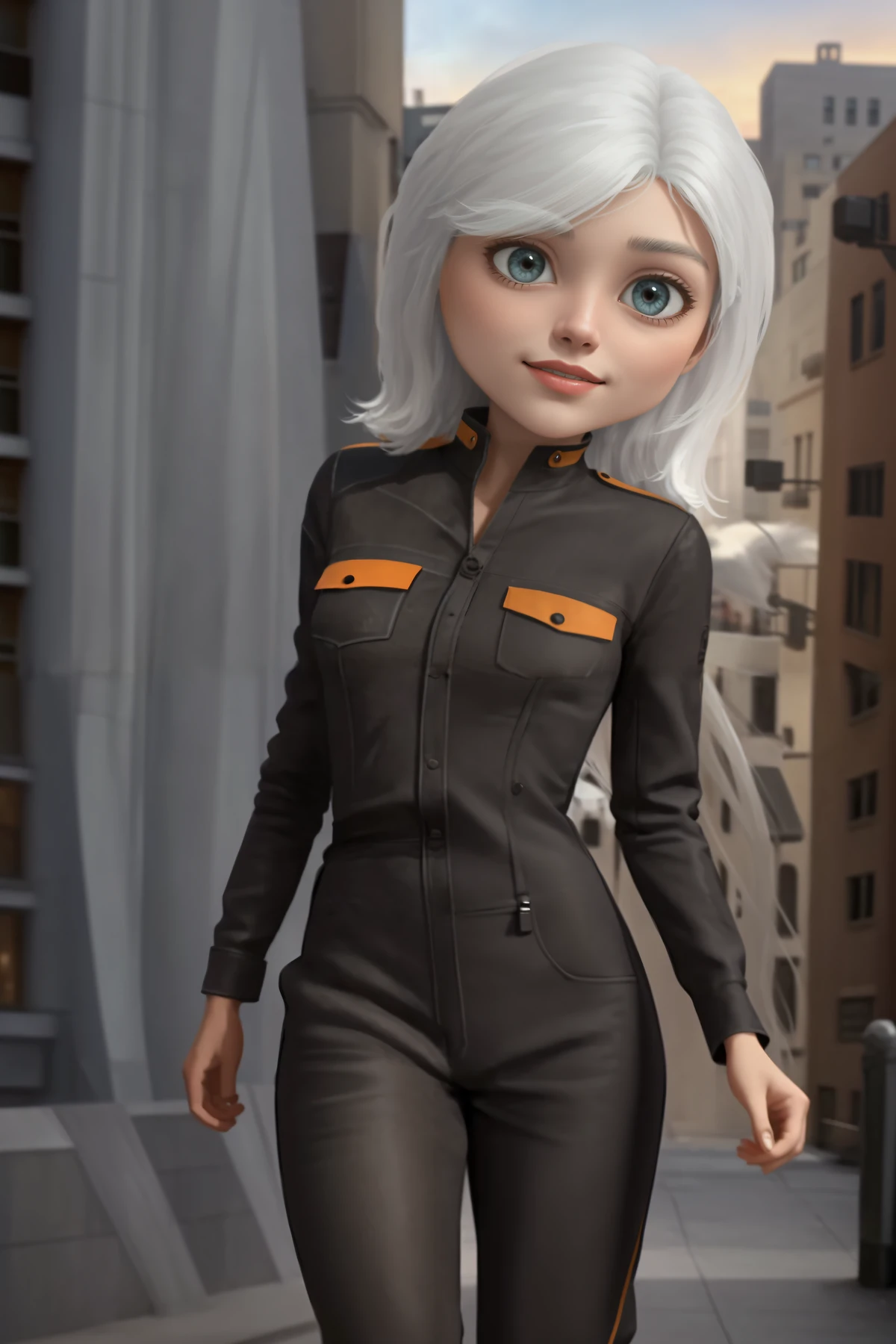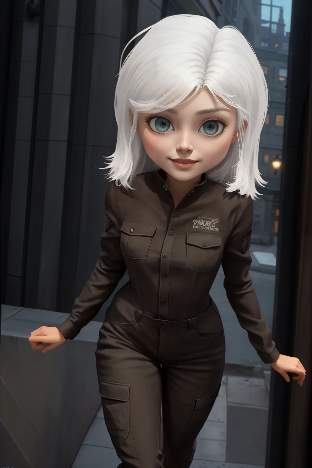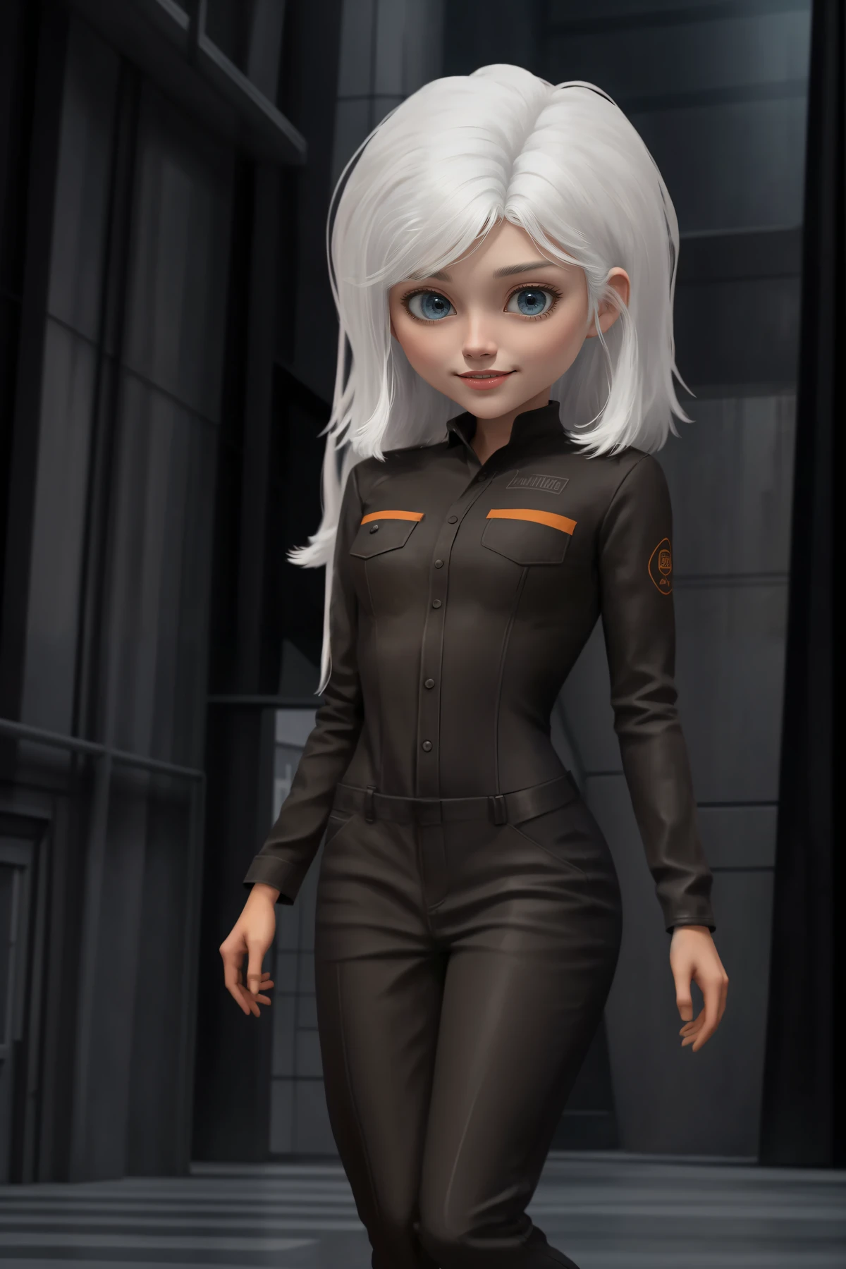 Recommended positive prompts: 1girl, white hair, short hair, wearing black prisoner jumpsuit, straight hair, snatched waist