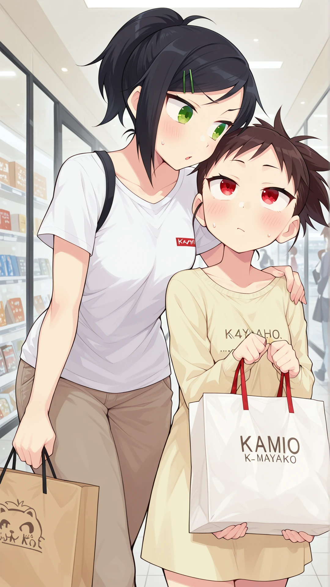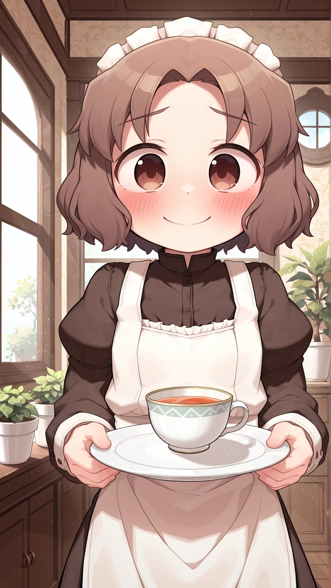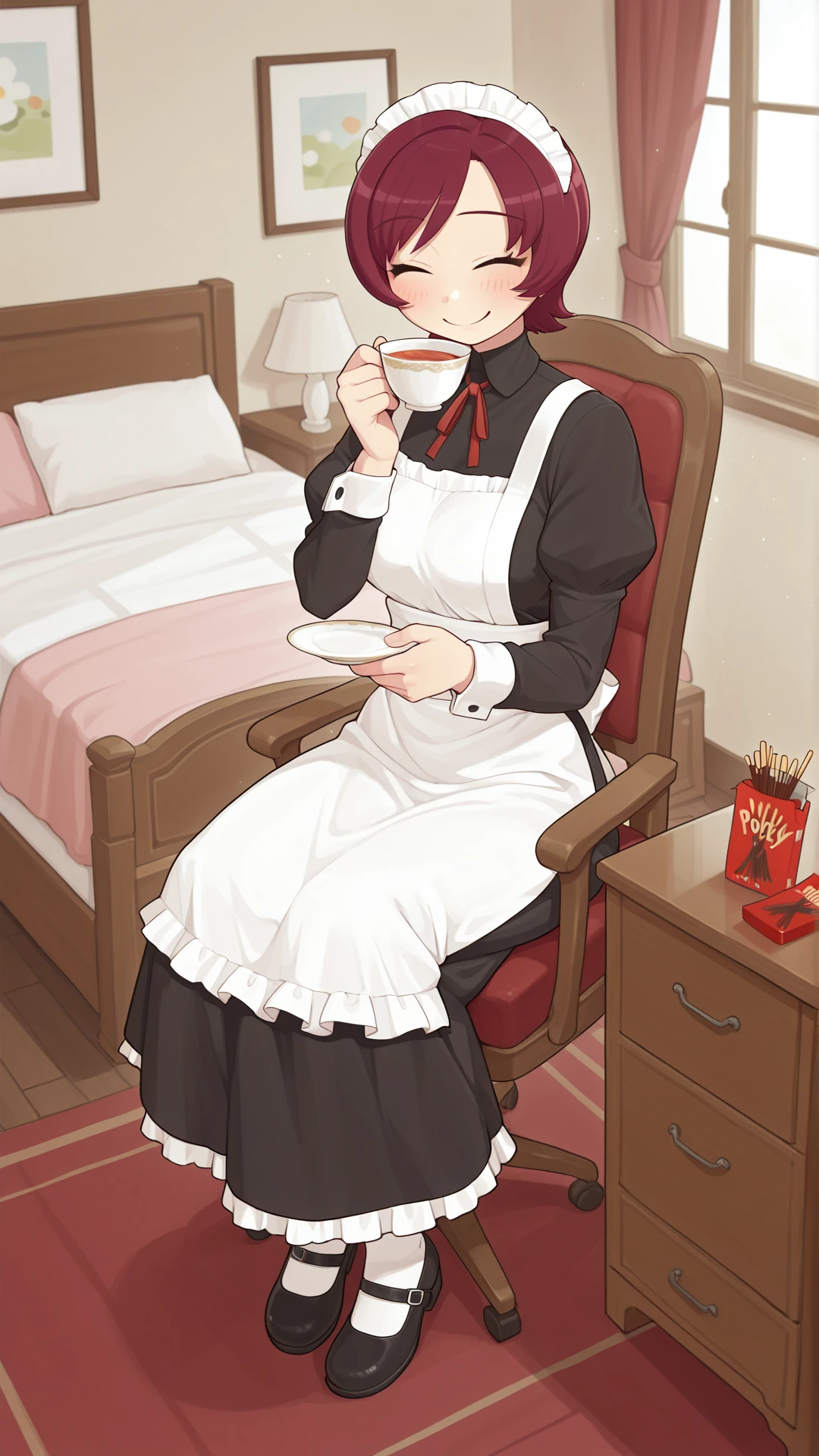 sh3ska - maroon hair, maid, green eyes, short hair,