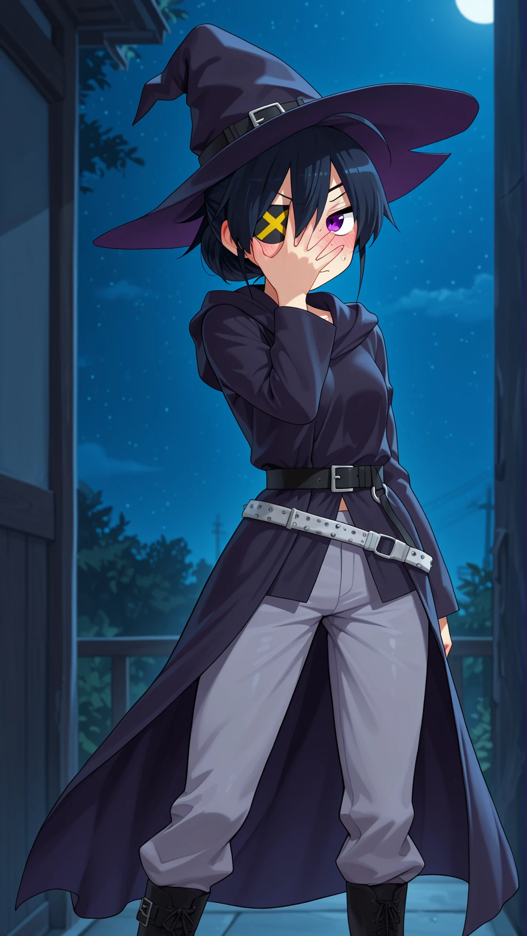 m4hiru - black hair, purple eyes, single hair bun, short hair, ahoge,