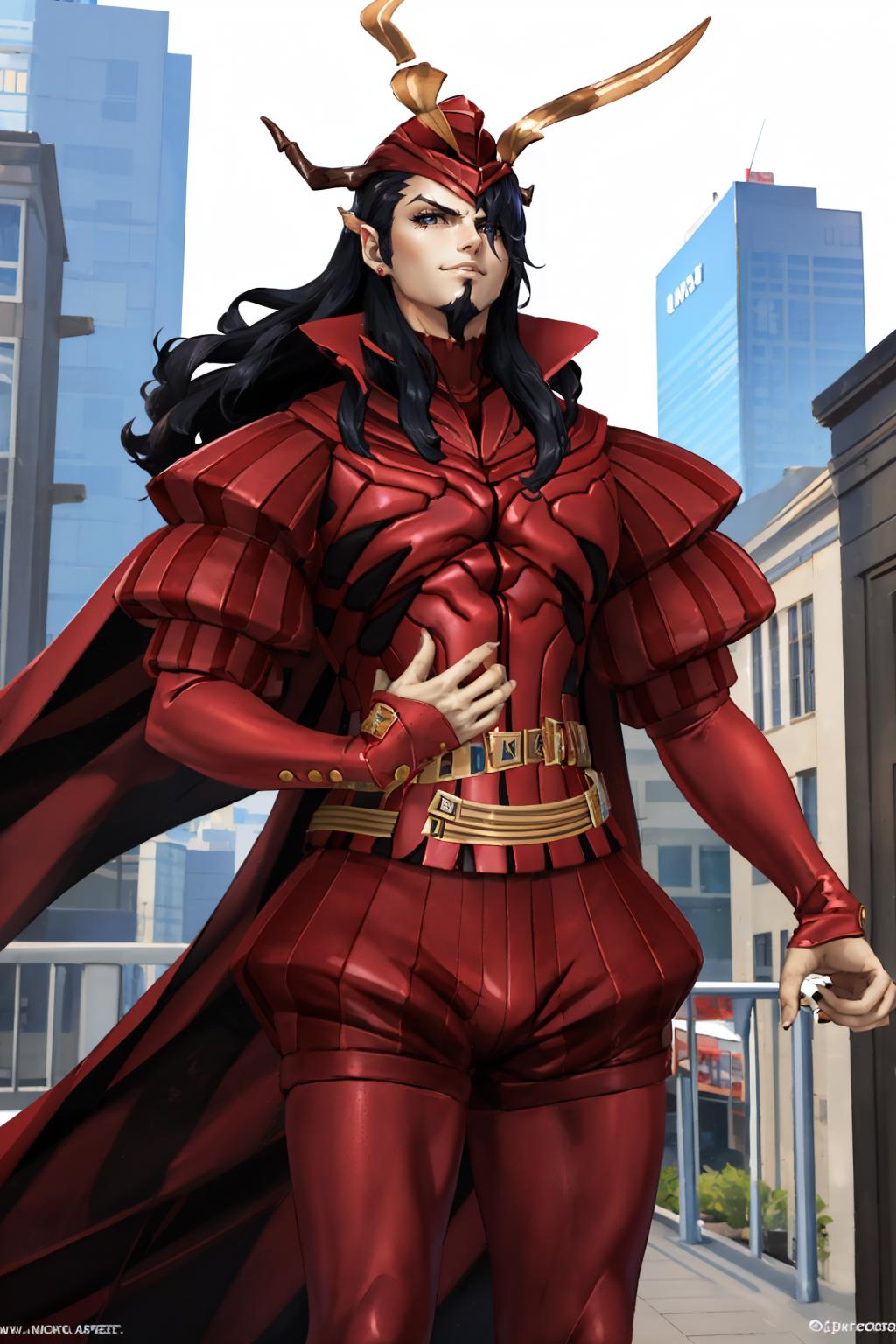 Tags: mephistosmt, black hair, long hair, cape, horns, helmet, facial hair, puffy sleeves, armor, boots