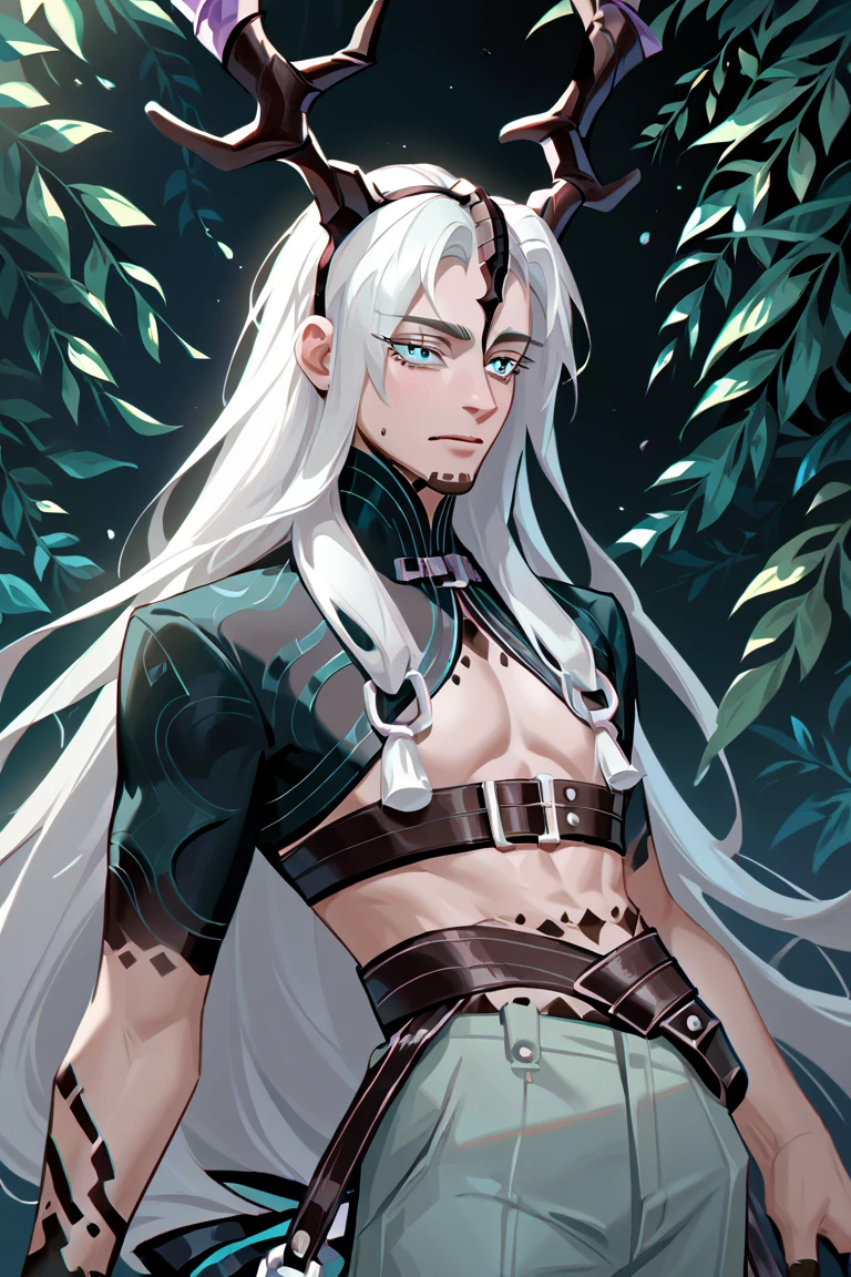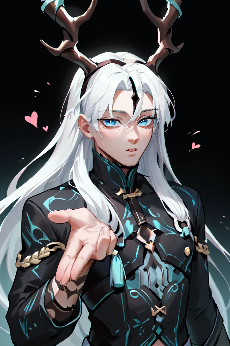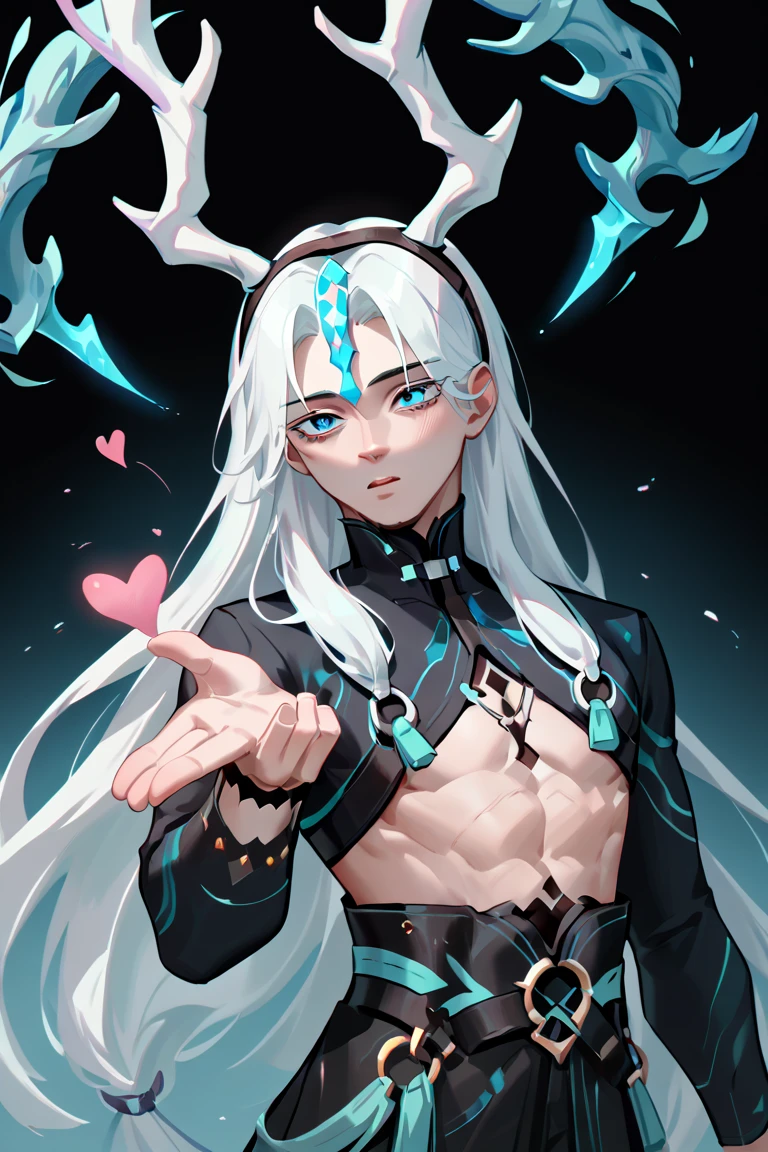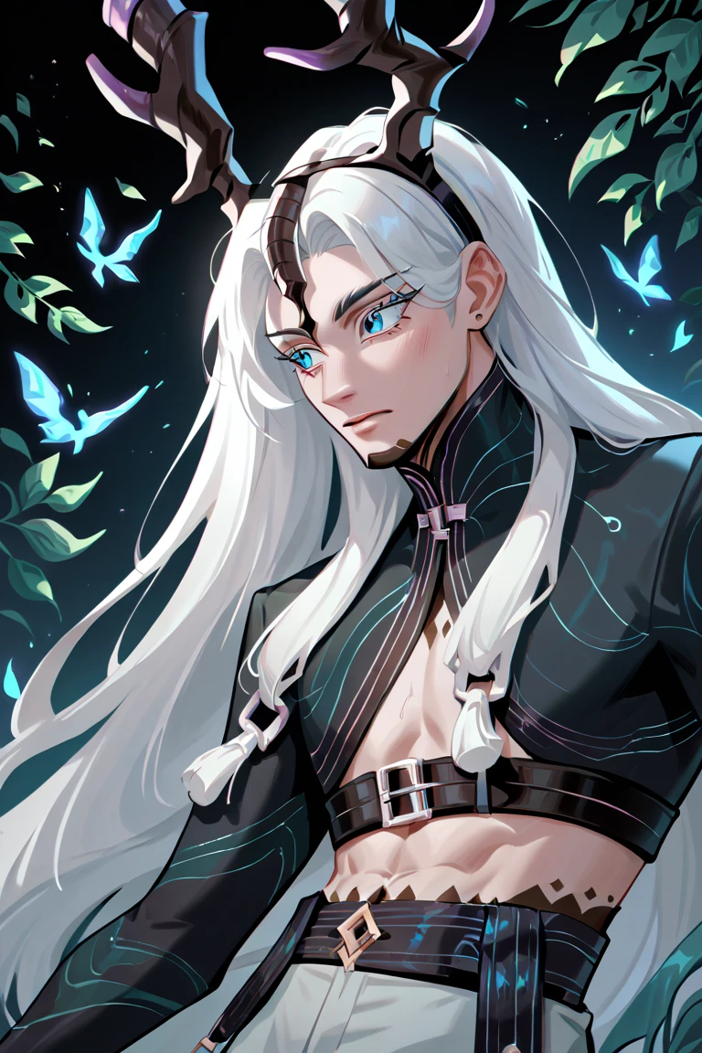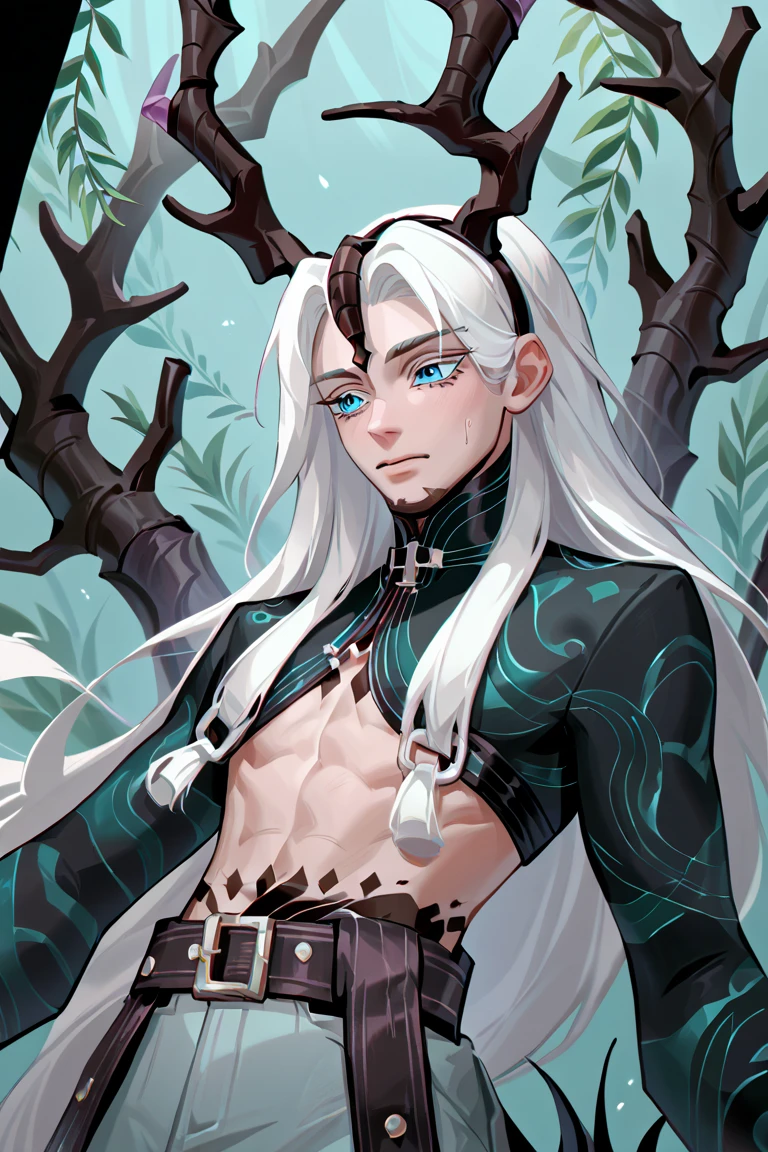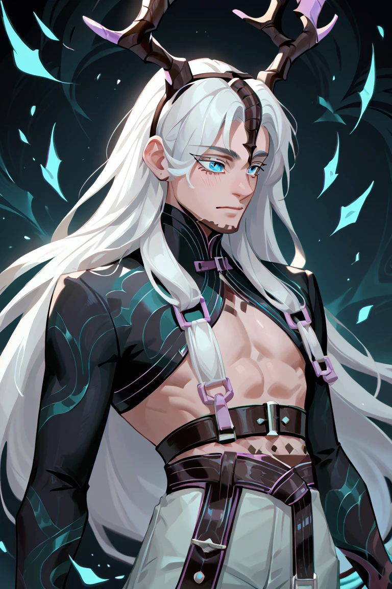 triggers: DLXiaoYin, long hair, white hair, blue eyes ,horns, antlers, belts, 1boy
